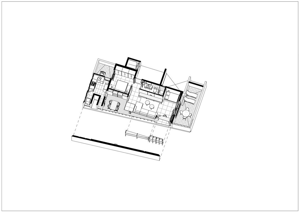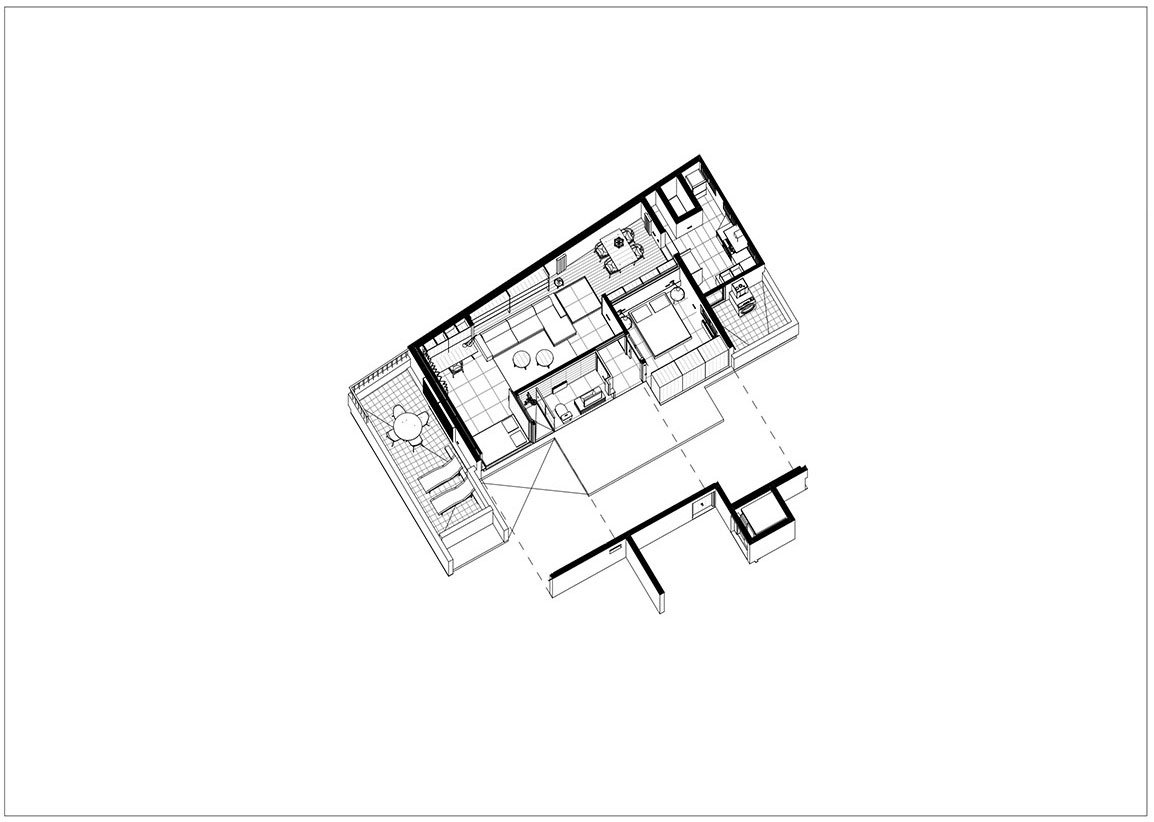 Interior space is conceived as a segregatable unit which changes according to each time needs. Different areas are defined using platforms and mobile partitions. That allows to set up different flat configurations with varied privacy degrees.