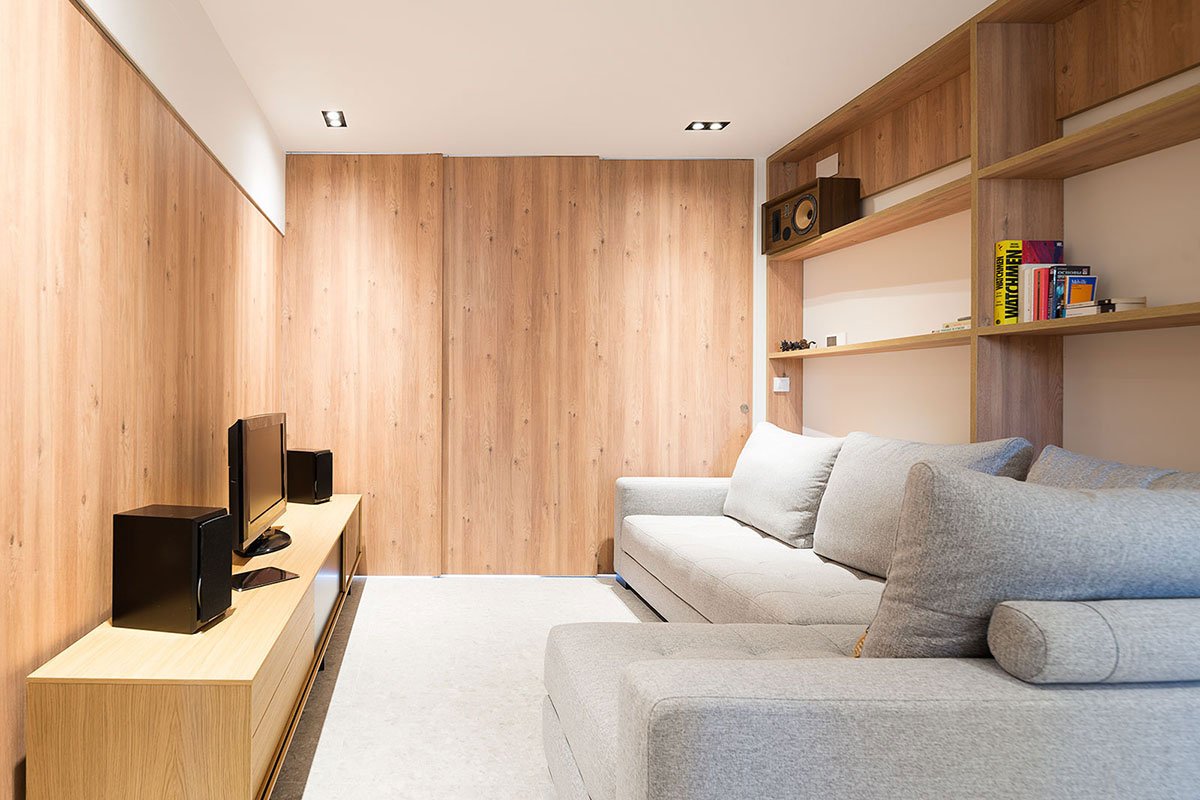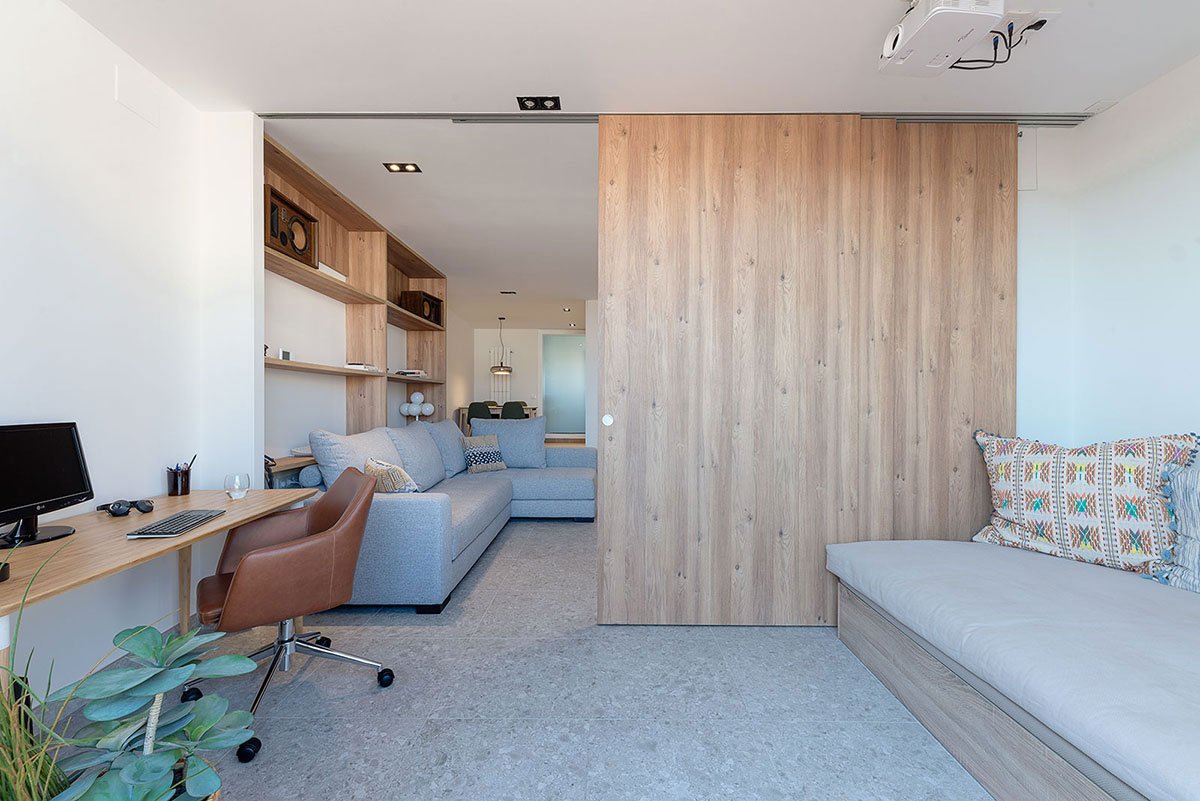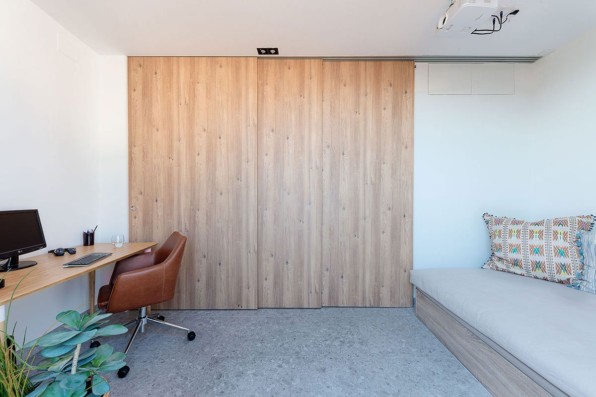 The living room becomes the hous center piece with two areas: the sofa and the chillout. That living space has different relationships with the spaces beside it: the dinning area is slightly elevated solving the relation with the kitchen; the flat receiver can be closed achieving an in suite configuration joining bedroom and bathroom; finally, three sliding panels allow to split the livingroom in two, and create the secondary bedroom for the time guests are in the house.