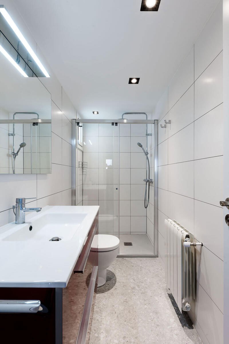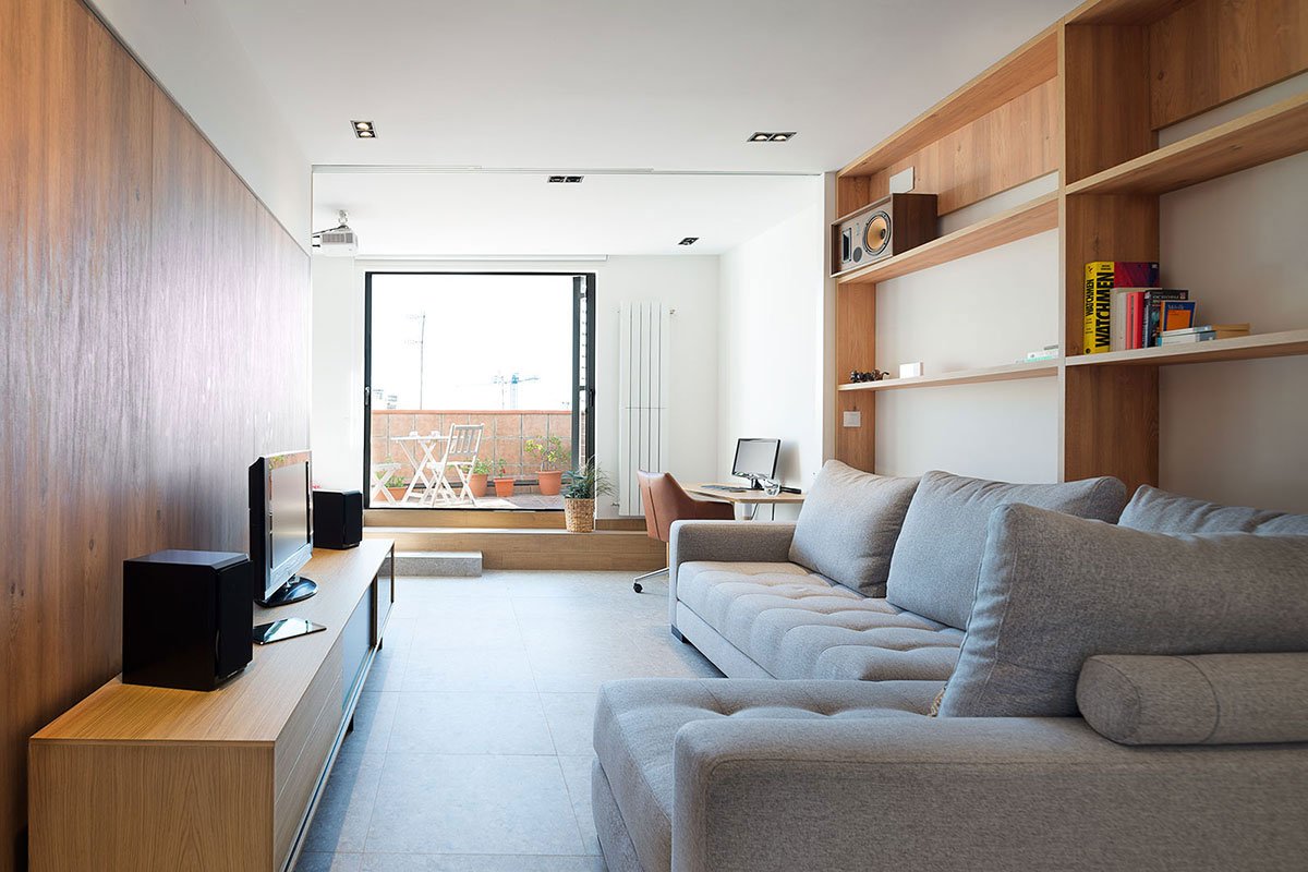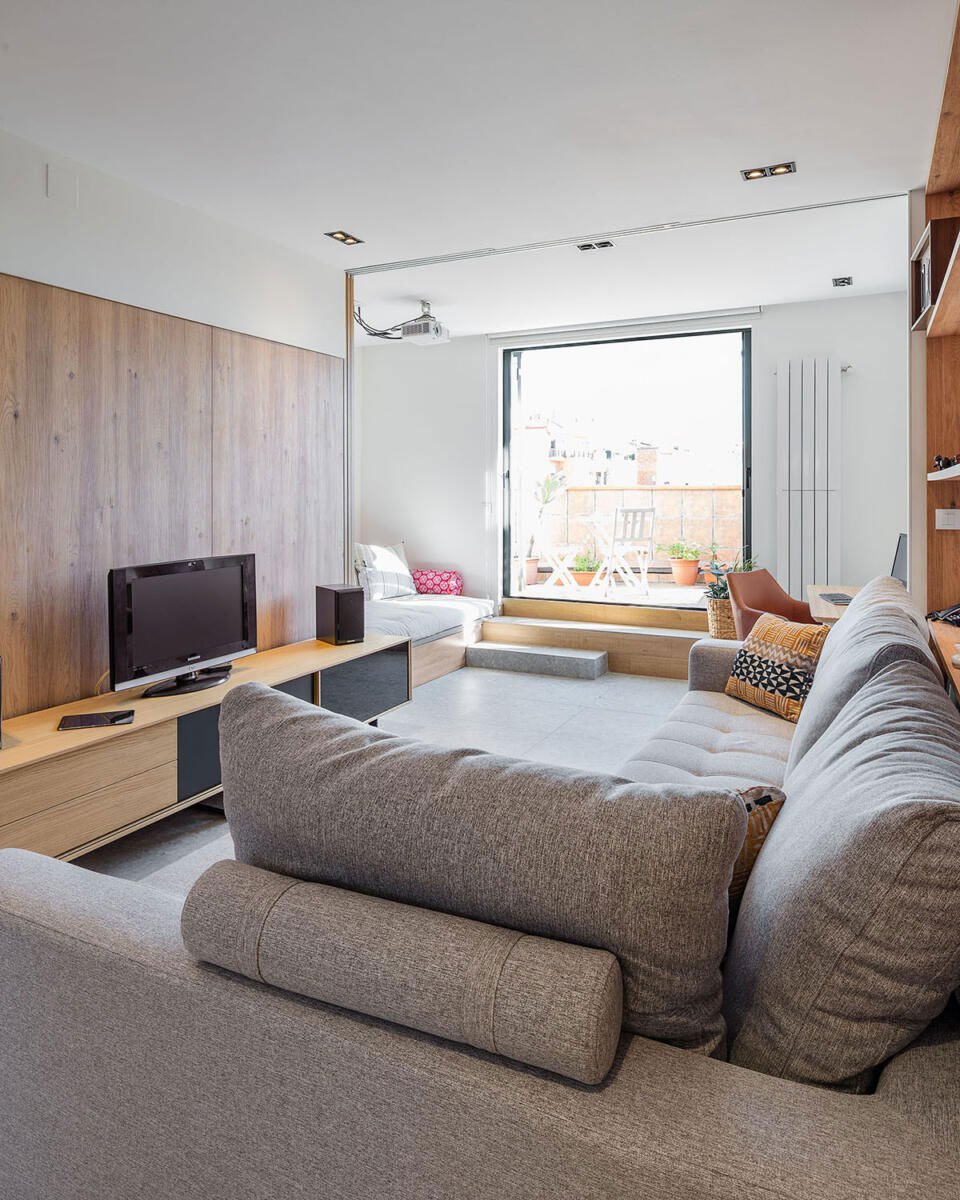 [Text as submitted by architect] The starting point for this refurbishment project was a small penthouse with a highly frangmented layout including three bedroom and a living room. Its two terraces at the sides were the biggest asset of the space, but the existing configuration of the flat didn’t facilitate their enjoyment. In addition those terraces were well over the inner level, and one of them included the flat’s kitchen, once constructed gaining space from outdoors. That area remaind out of our project, as in can’t be now legally modified.
