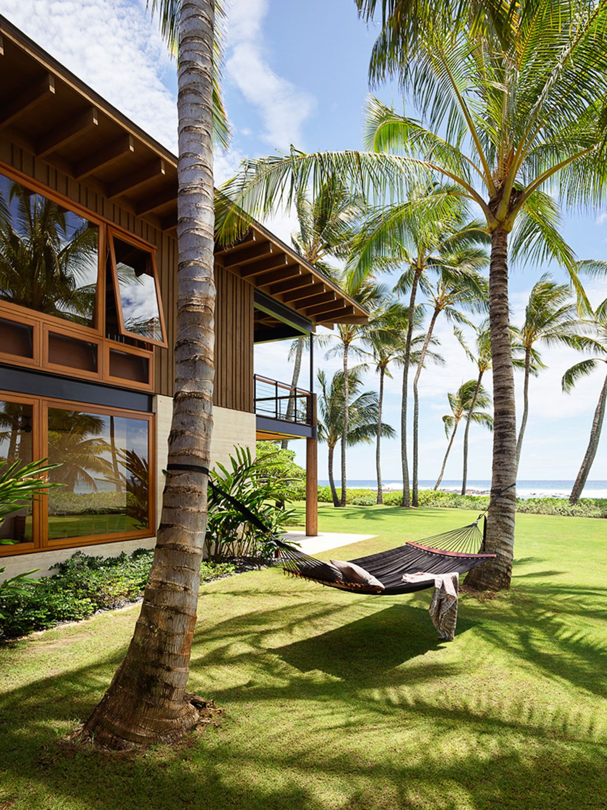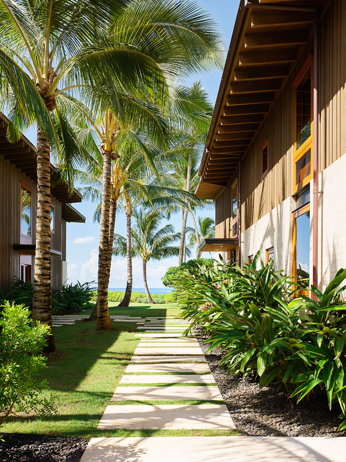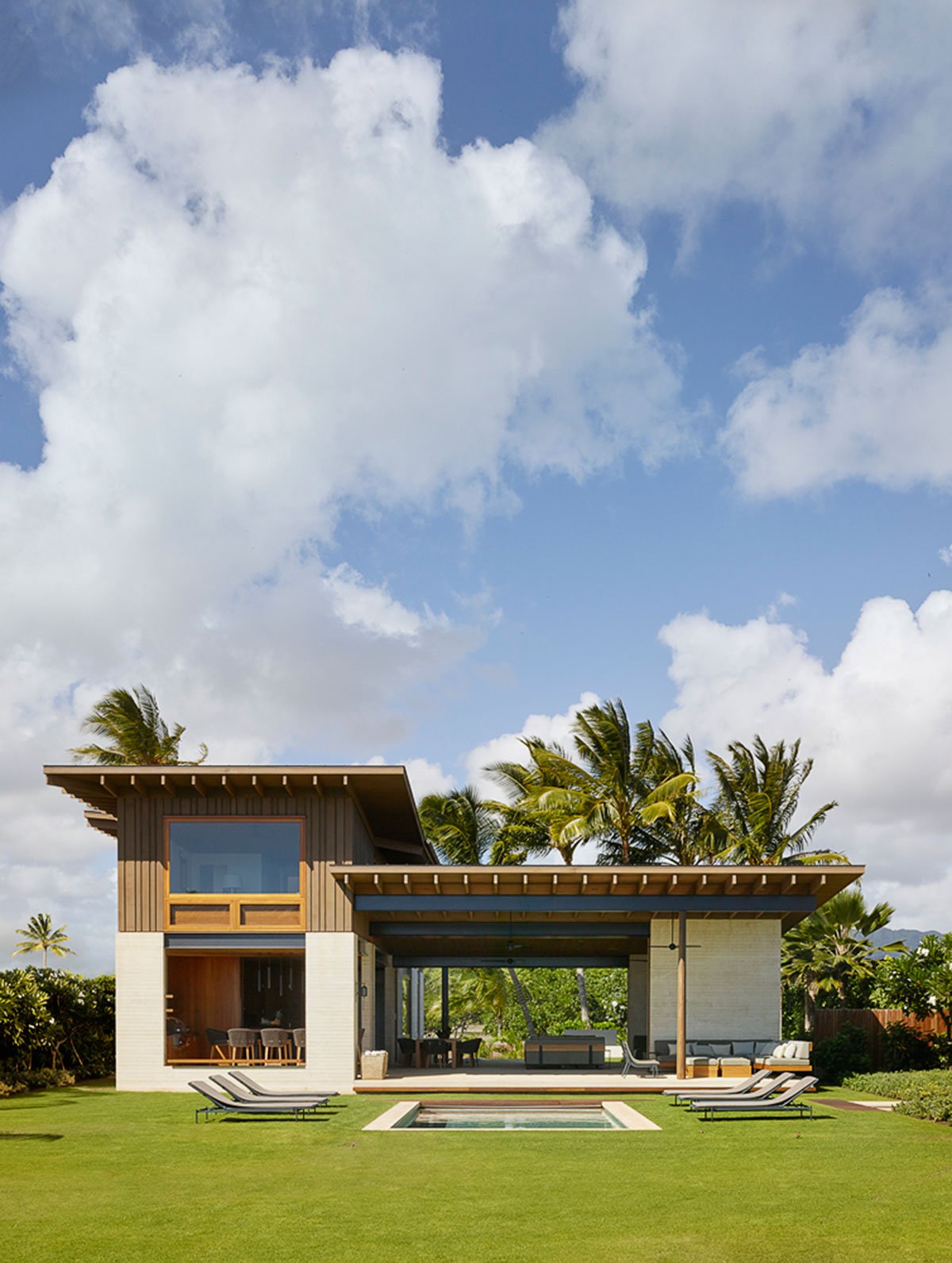 [Text as submitted by architect] Hale Nukumoi is the quintessential Hawaiian beach retreat: open and casual—the opposite of fussy. Set amidst mature palm trees, the complex is ready-made for family and friends. Composed of a main house and guest house, the site features a large yard and pool, as well as beach access. An indoor/outdoor lifestyle is exemplified by the home’s airy design: large sliding doors and walls, a custom two-story rainscreen, and layered plantings balance connections to nature with privacy.