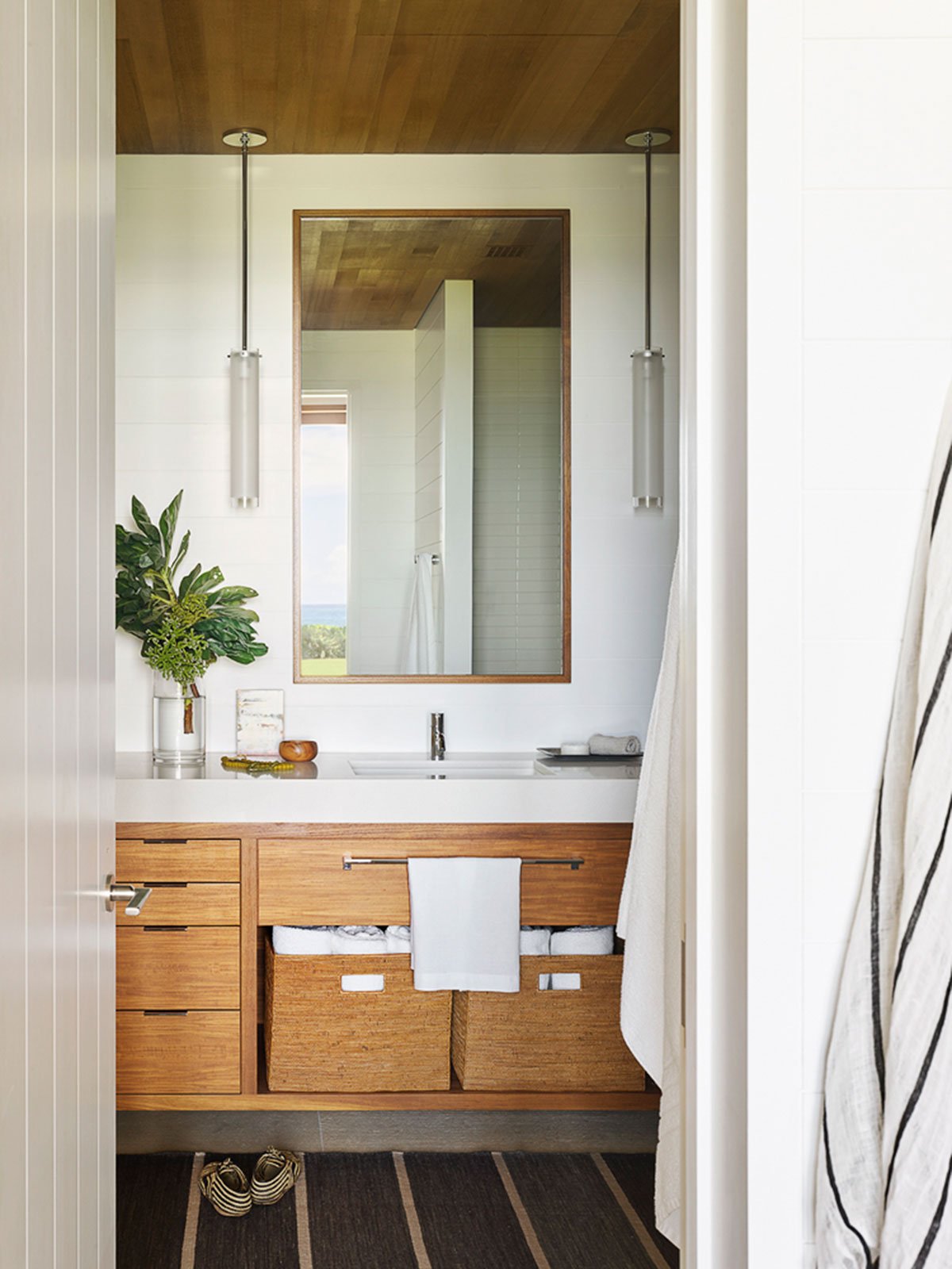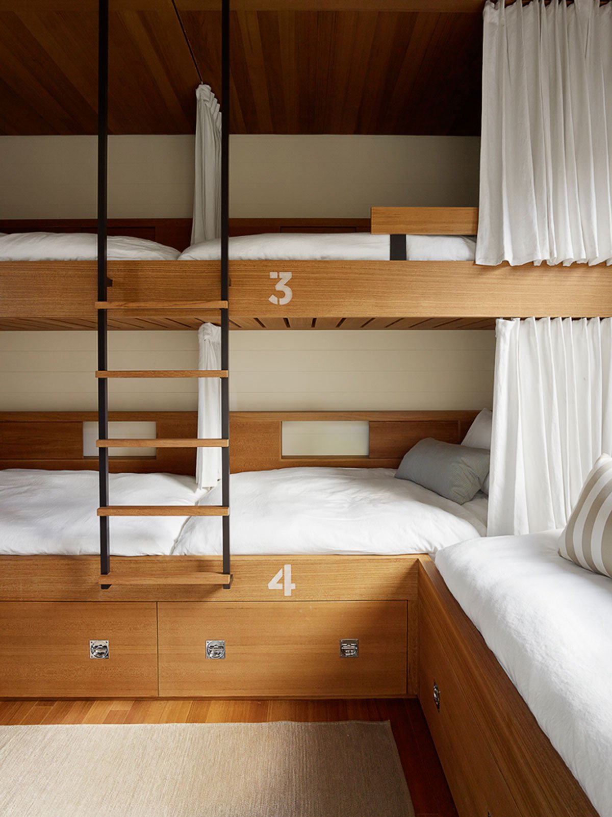 A connected indoor-outdoor room provides space for an outdoor bar, sitting area, and outdoor grill. Furnishings are modest and comfy, providing ship-like efficiency. Sand colored floors and walls run through the interior, with ceilings and cabinetry clad in wood to match the ceiling beams.