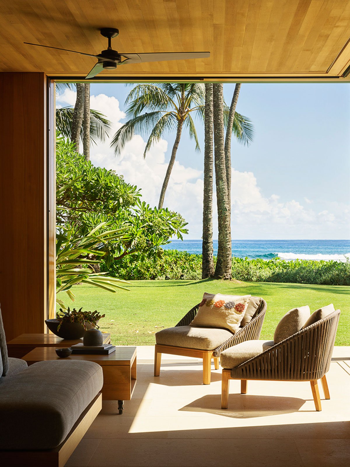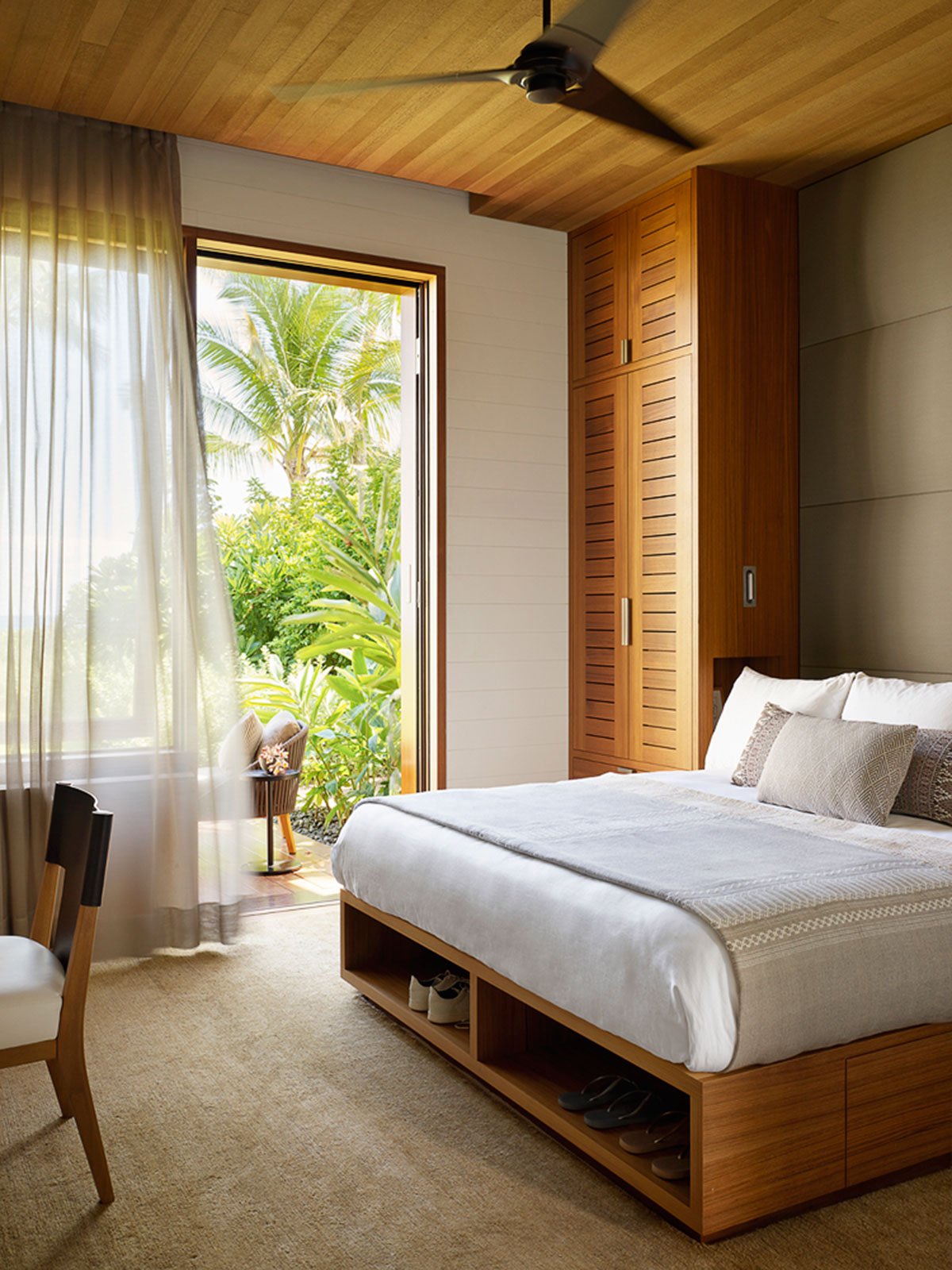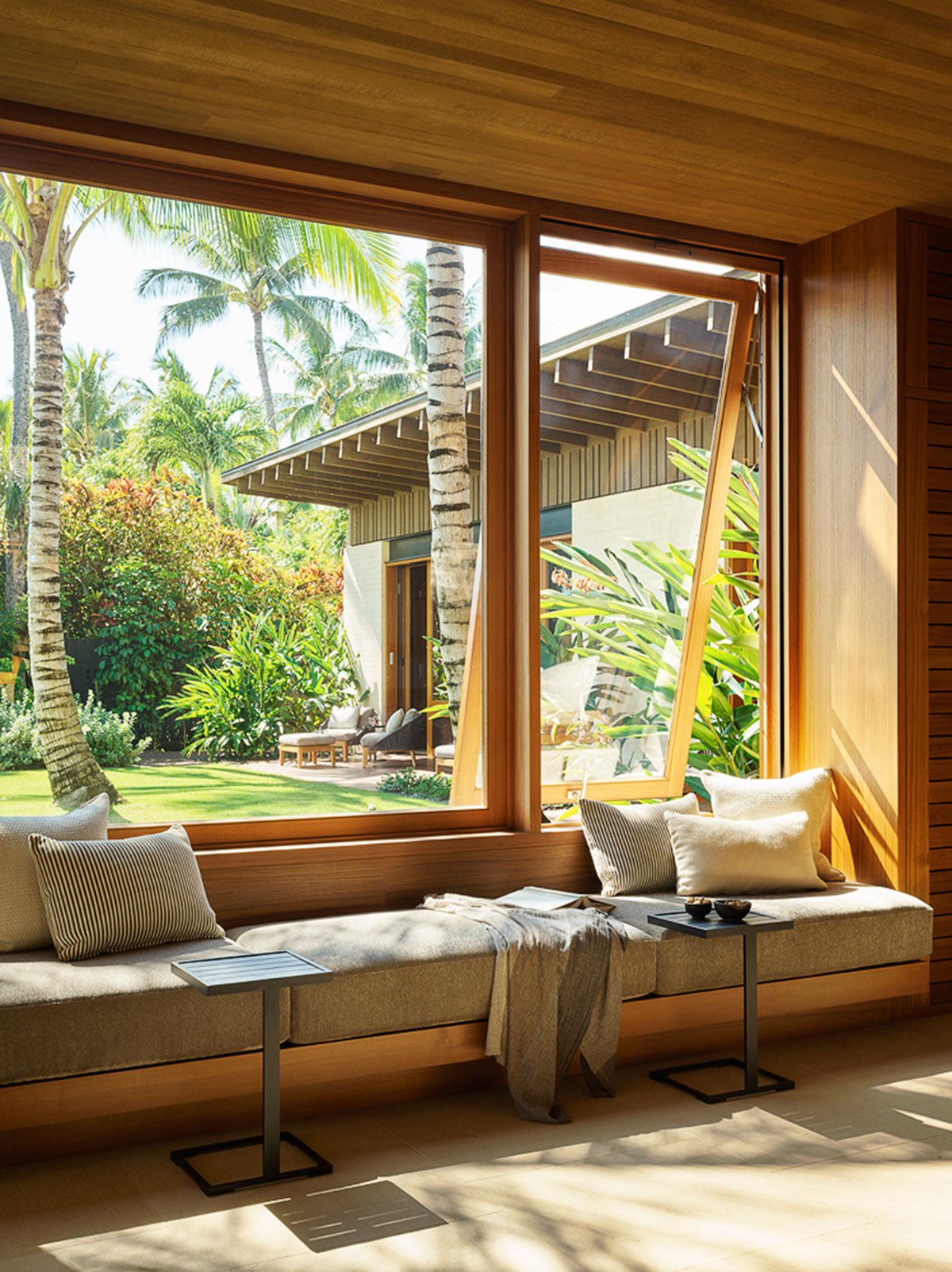 Sand, volcanic rock, and trees come together to establish a subdued and sophisticated palette of materials and colors respectful of the geological and cultural history of the islands.