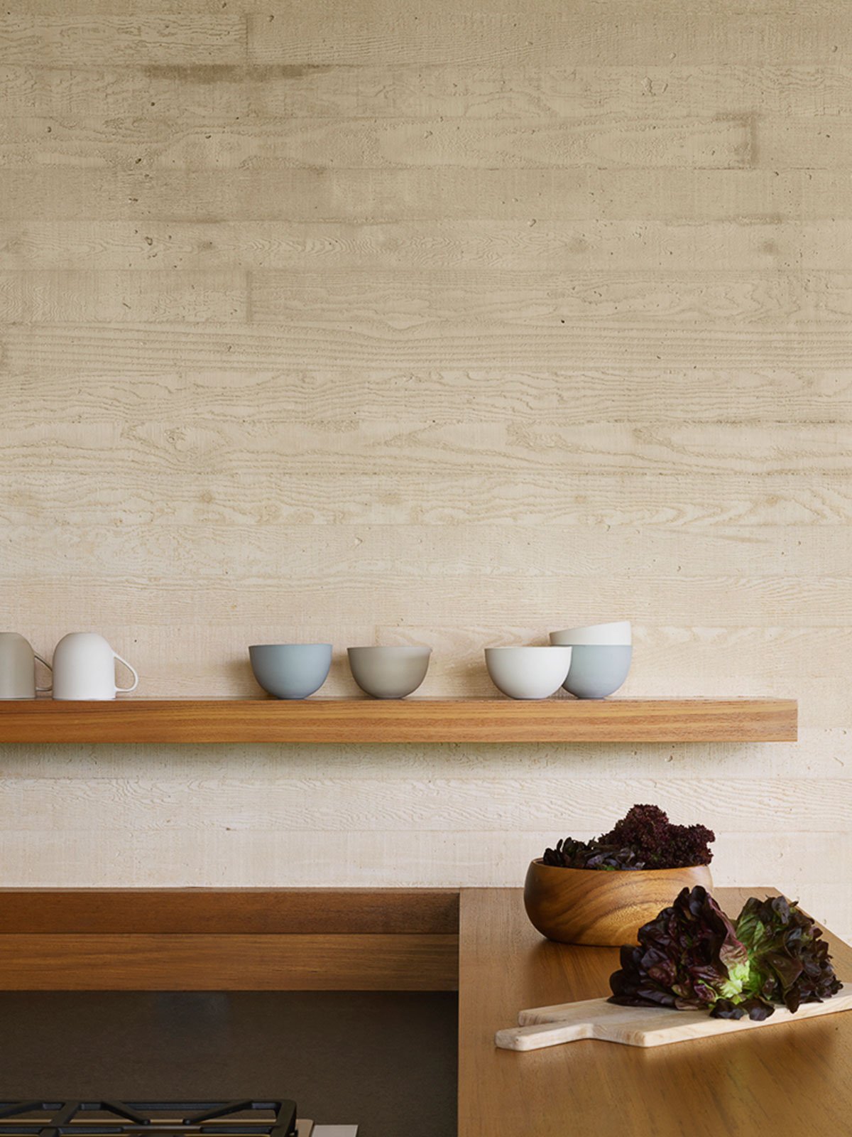 The main house and adjacent guest house—both L-shaped structures—feature pigmented, board-formed concrete base structures, with dark timber cladding the upper portions. Low-pitched roofs reach out to provide deep overhangs offering semi-protected transition spaces between inside to outside.