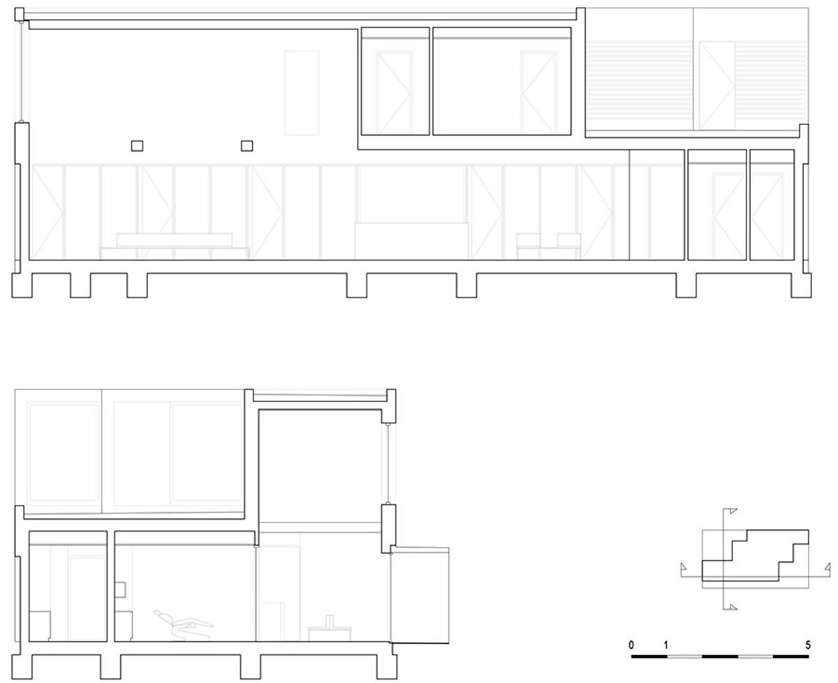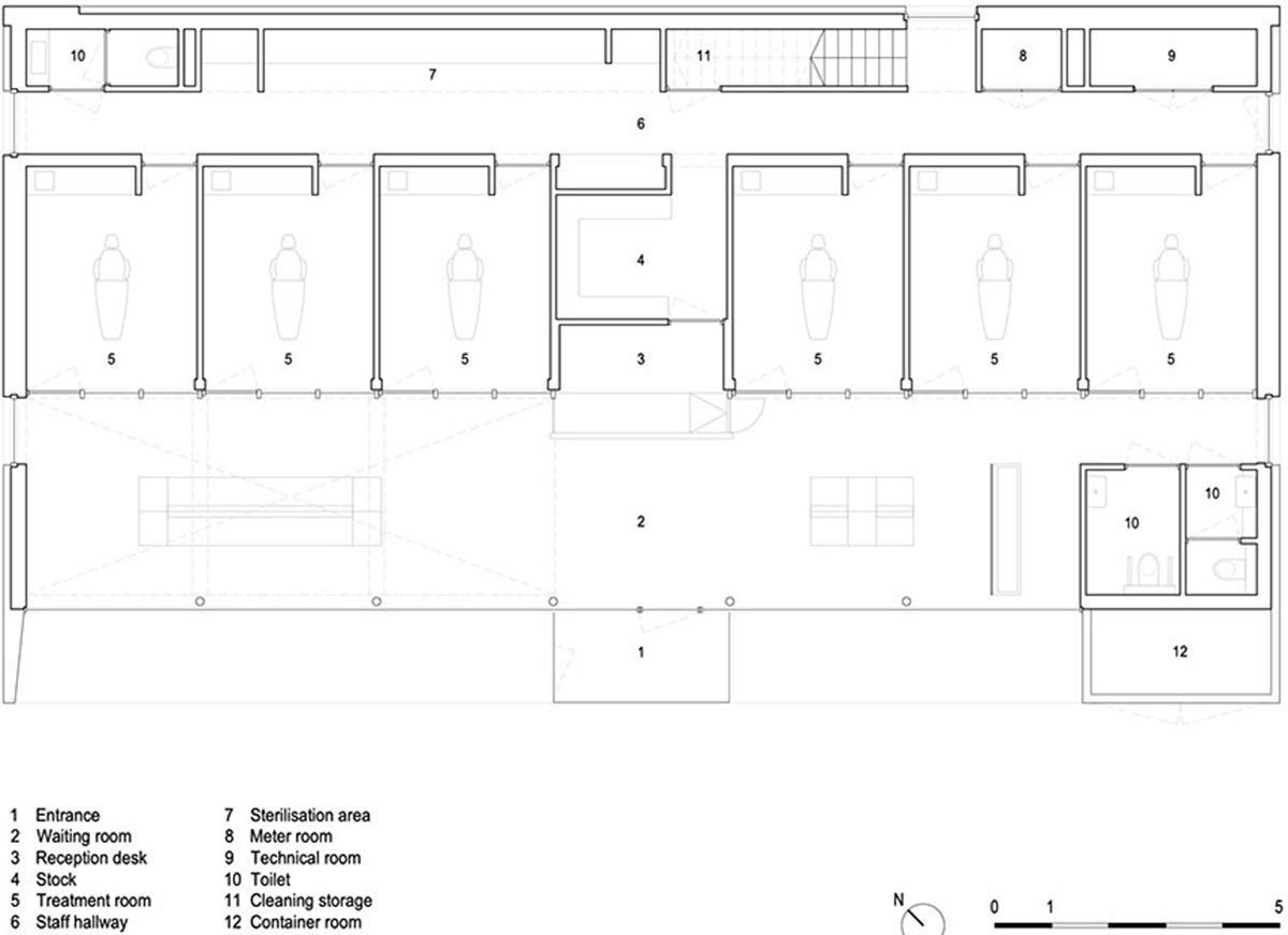 A dental practice must meet the highest hygiene, safety, and privacy standards. This requires an entirely separate routing and zoning for staff and patients. To achieve this, the design efficiently divides all functions on the ground floor among three zones: one with six treatment rooms, one that accommodates all technical and facility rooms and routing for staff, and one that combines the reception area with routing for patients—a clear and logical setup, allowing for a daily routine that is both productive and ergonomic. On the first floor, used exclusively by staff, the same three zones are applied to organize the various functions: breakroom, locker rooms, and offices.