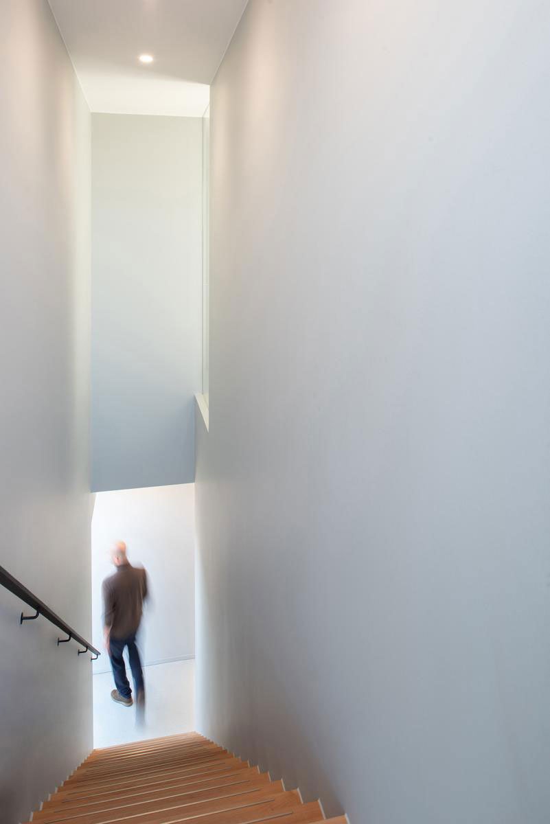 The first floor gets a staggered, sculptural look by pushing the outermost of the three zones all the way to the edges of the building envelope. This creates a playful and dynamic architectural accent on the southeastern side of the building. On the northwestern façade at Blauwe Engel, the design emphasizes the entrance to the practice. The whole building presents itself open and inviting in all directions, different and surprising from every angle.