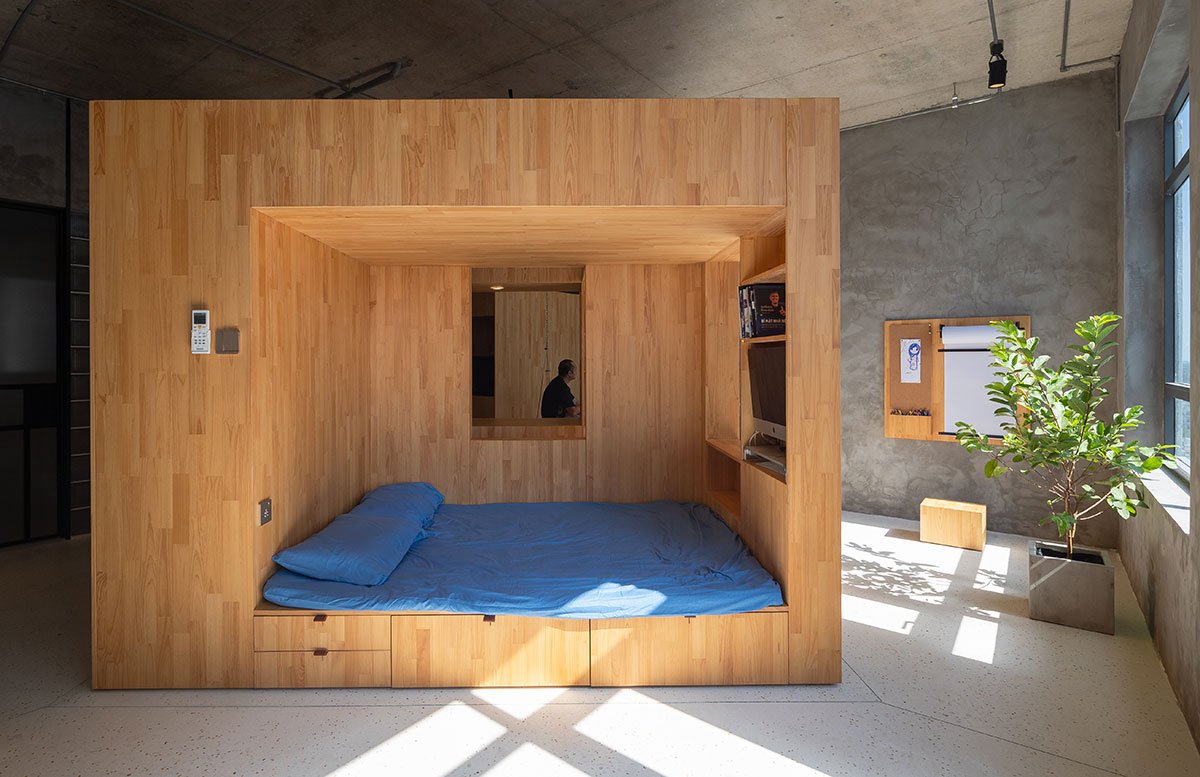 The designers installed a 3 meters wide, 3 meters long and 2.2meters high wooden sculpture block in the center of the flat, with purposes such as two beds, a workspace, a study area, a cupboard… space in the block connected vertically and horizontally, which allows activities to take place without interruption. Building a cube turned 45 degrees angle inside the apartment helps to activate flexible light and shadow areas more apparent.