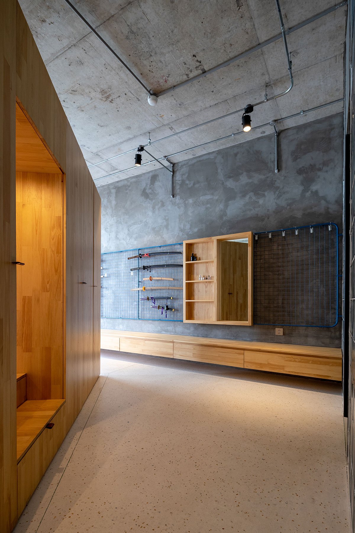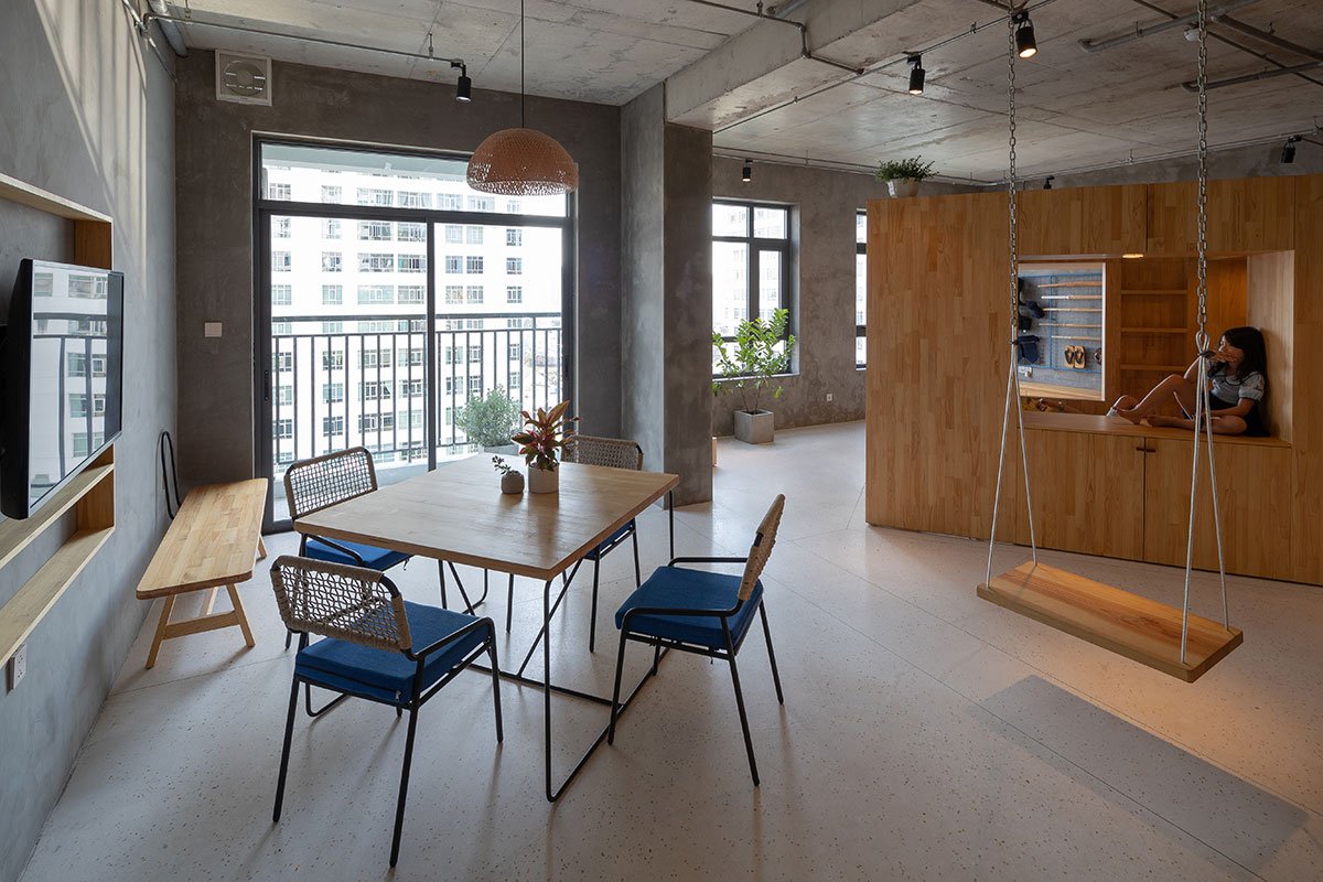 This is a freshly constructed apartment with an open floor plan and no dividing walls. To reduce building work, the designers maintained the status quo with little alteration. To take use of the maximum clearance height, the concrete ceiling layer also remains the same.
