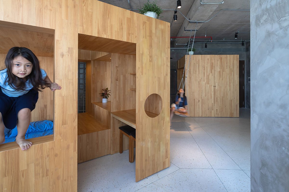 Excerpt: Happy Box, a home interiors project by Tropical Space, rethinks the design of a studio apartment from a children’s perspective. The design features a wooden sculpture block placed in the centre of the flat, providing space for two beds, a workspace, a study area, and a cupboard. A 45-degree-angle cube was also built to activate flexible light and shadow areas, allowing uninterrupted activities.