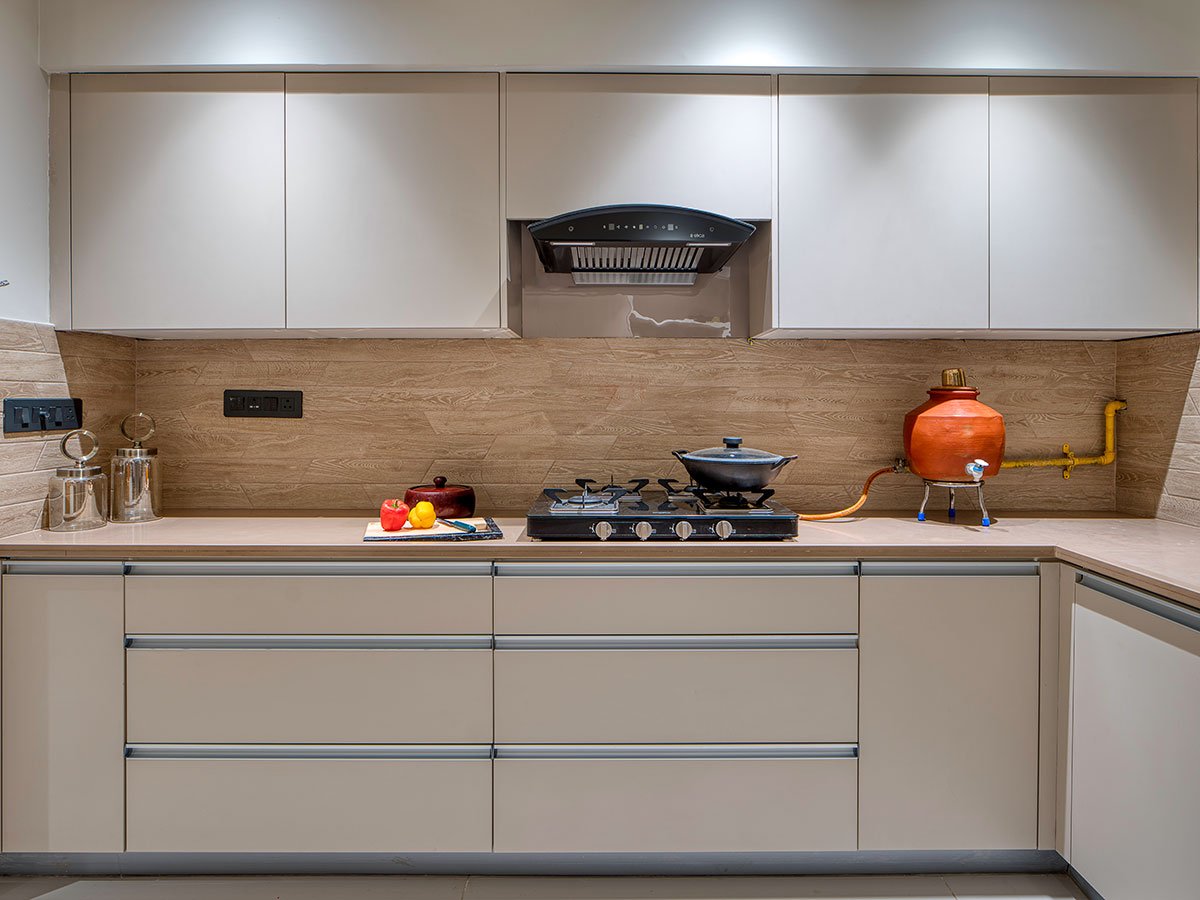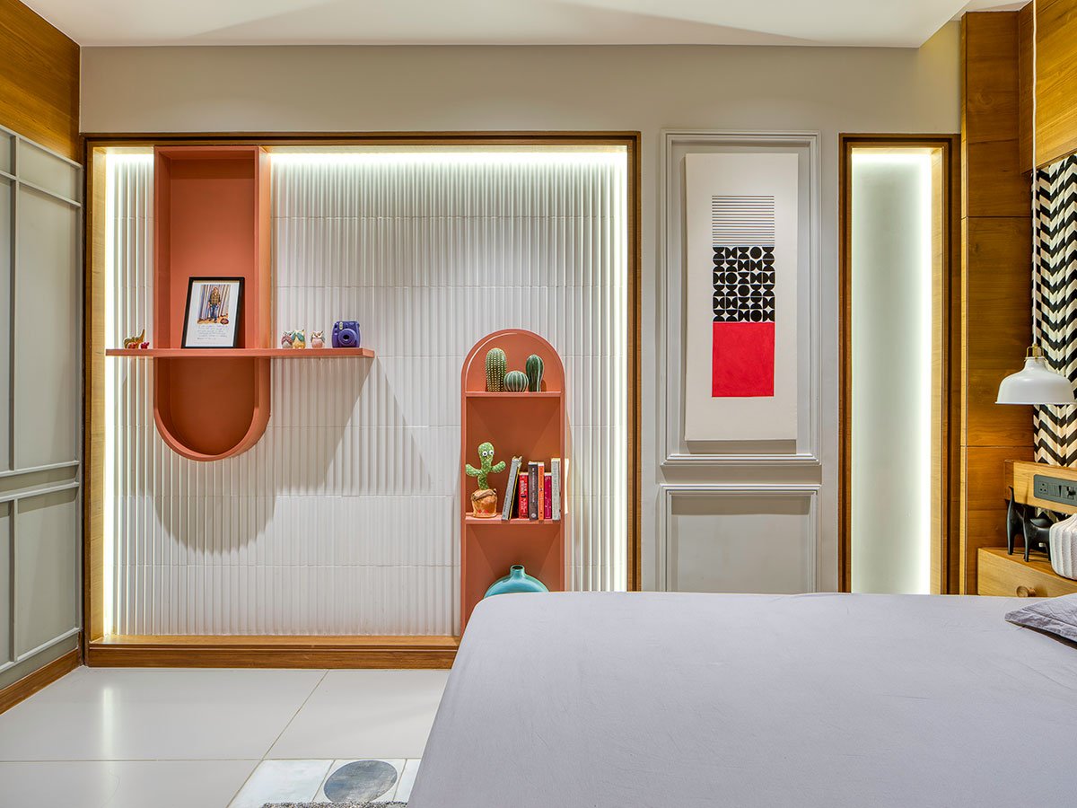 Arch-shaped panels and shelves, and square-patterned panels continue the European vibe into these rooms, juxtaposed with raw finished, linear iron door handles. A combination of bright, beige, and grey-coloured furniture, upholstery, and wall panels hold strongly to the aesthetic style and vibe that is carried through the house.