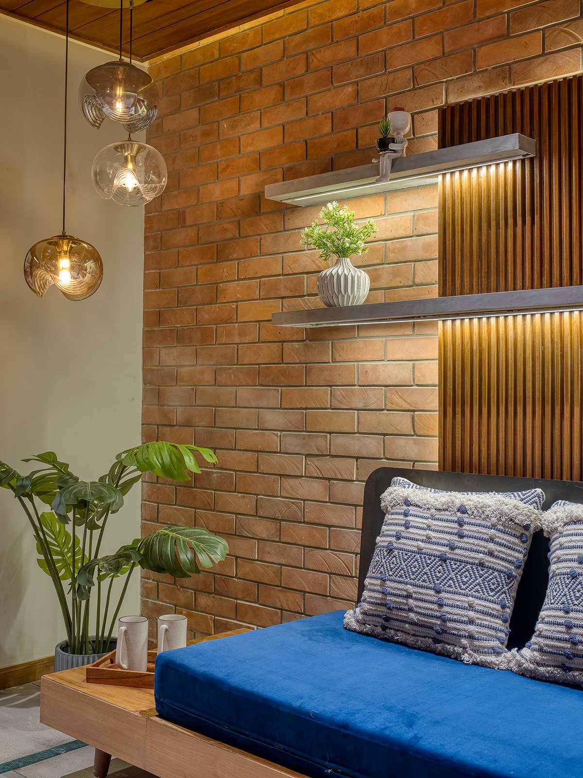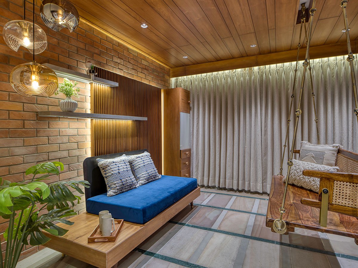 As one steps out, the northeast façade frames the dry backyard where two glass doors help establish the indoor-outdoor connection and flood the house with the bright yet calm, northern sun. A floor in buff stone tiles, walls that are cladded in brick with wooden patti and concrete-finished arched panels augment the closeness of this space to nature. One can soak in the sun while enjoying the breeze on a wooden swing with rattan-finished backrest, adding to this cosy gathering space which is the heart of conversations in this house.