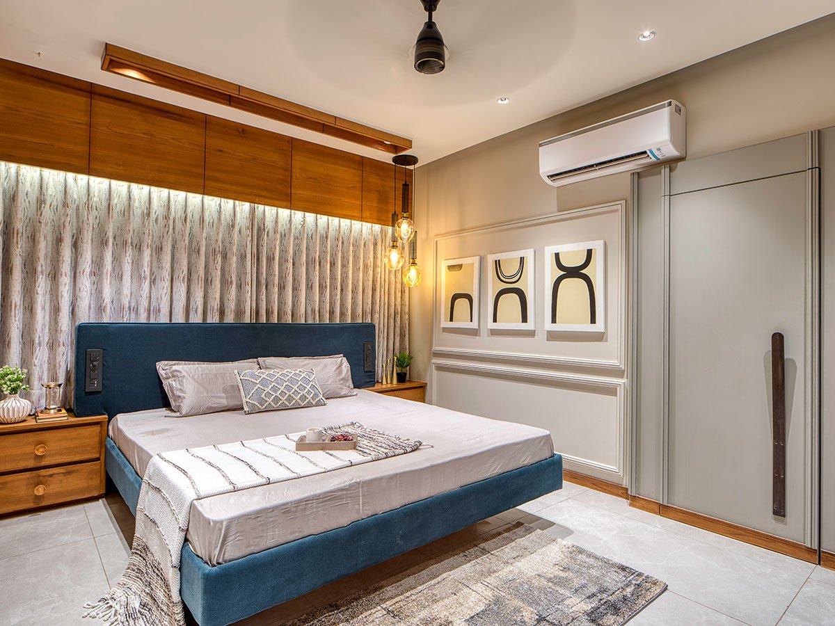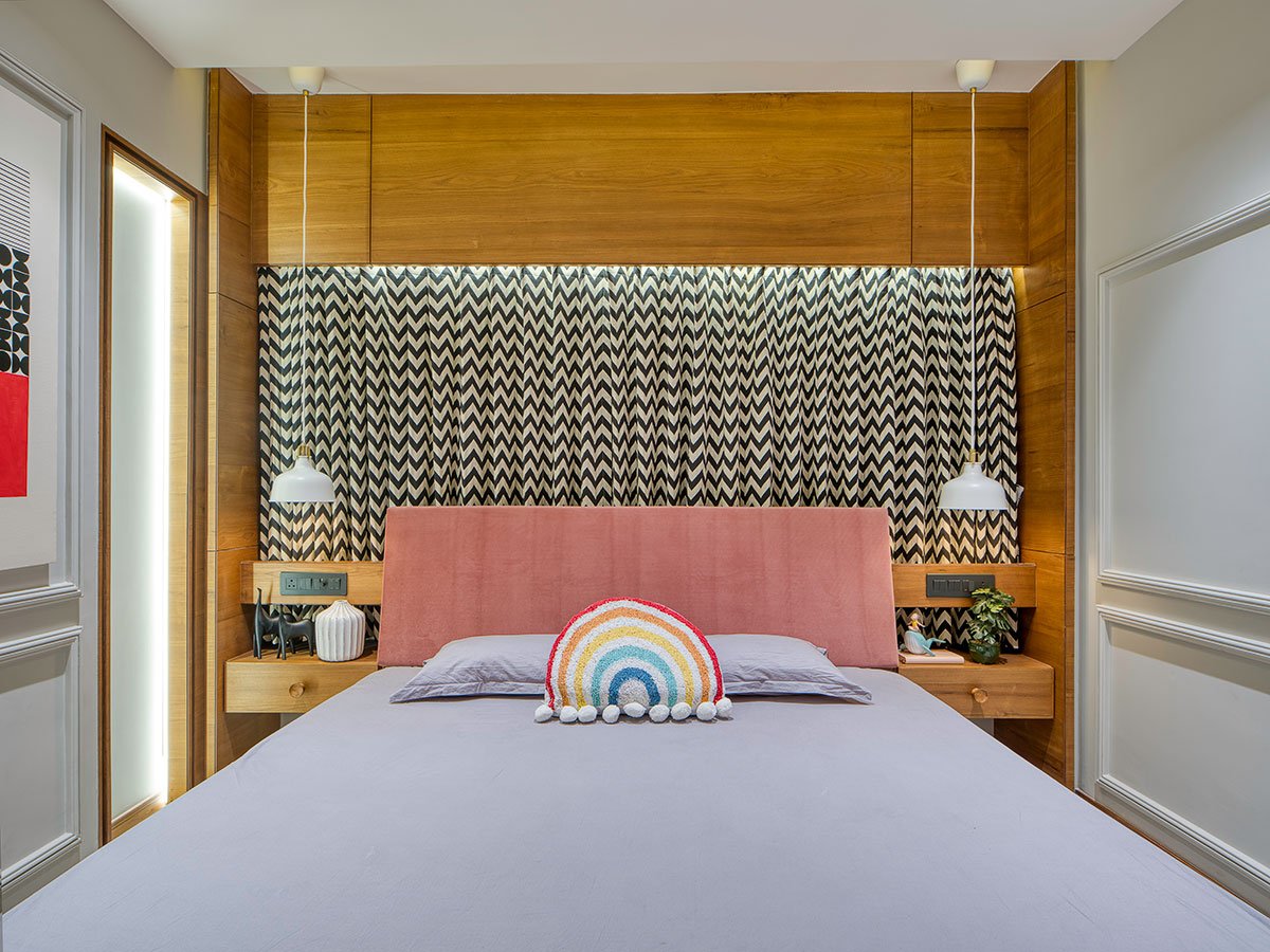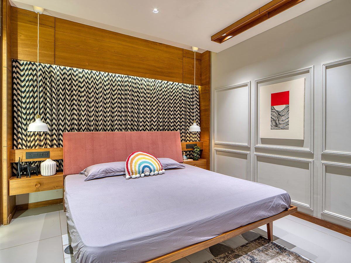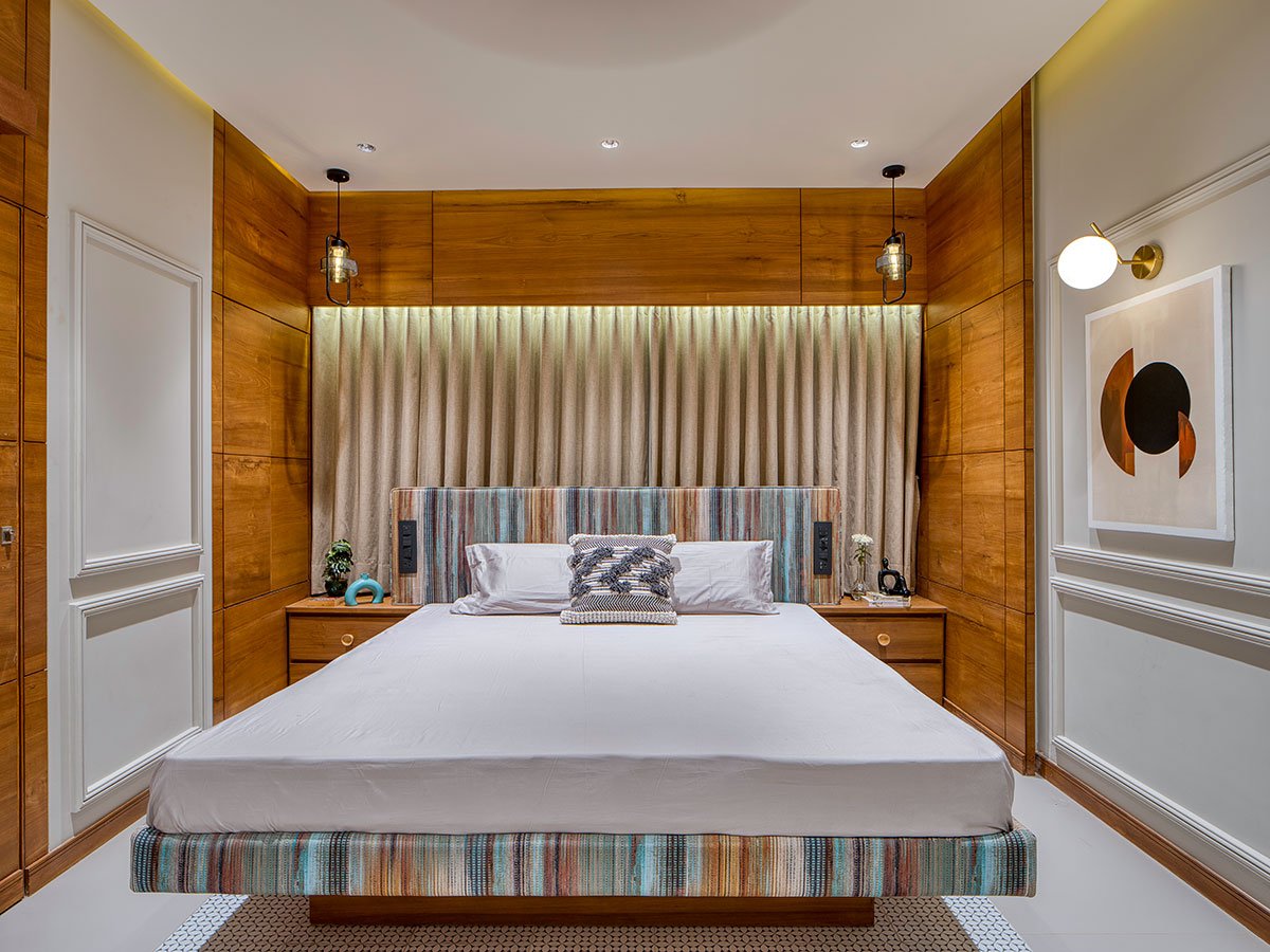 While each with a soul of its own, all bedrooms find a commonality with the rest of the spaces that binds them together, not as twins, but as siblings. Large windows grant these spaces a connection to the outside world while the sky is a plain ceiling with a rectangular wooden band translating into intricate wall panels and patterns in fabric.