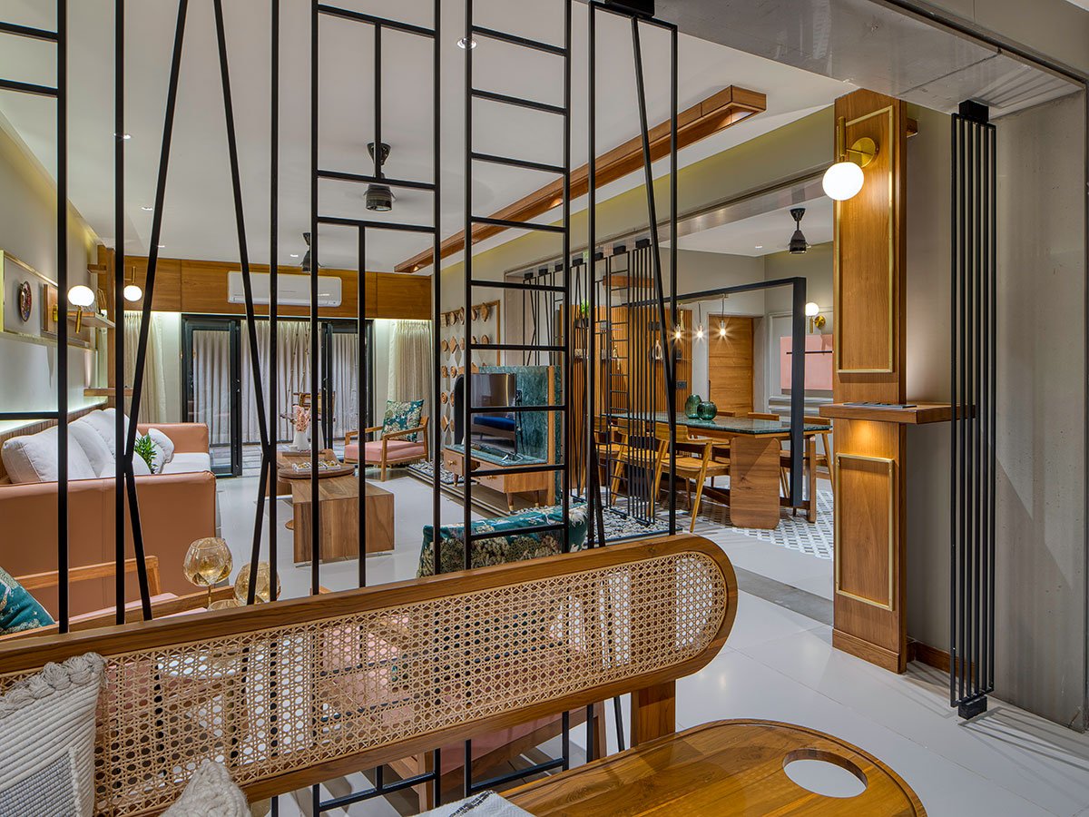 As one enters from the southwest, a small foyer area welcomes them with encompassing walls buff stone on two sides, and on third, one decorated with wooden carved blocks. A thin metal partition gives a sneak into the living room which carries forward the aesthetic language set in the first glimpse of the house. Glass doors on either side allow a foretaste of the backyard, flooding this space with light.