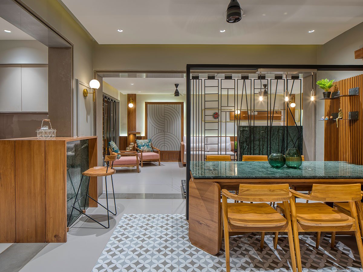 The dining area is the epicentre of the house. Other spaces such as the bedrooms, kitchen, and living are placed in its radial periphery. A heavy, granite-topped, wooden table is the iris of the space, paired with a serving counter of the same materials. An adjourning wall panelled in wood with metal shelves hands over the serving space while a mirror on the bright, sea-green wall, reflects this finesse on anyone in the space.