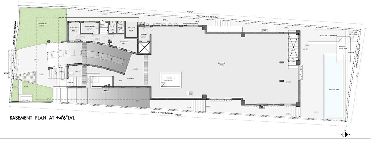 A basement garage, accessible via a ramp, reflects the client’s passion for automobiles, providing a dedicated space for their collection. The backyard further enhances the home’s social appeal, with a swimming pool and shared interaction spaces that serve as a bridge to the neighborhood, promoting community engagement.