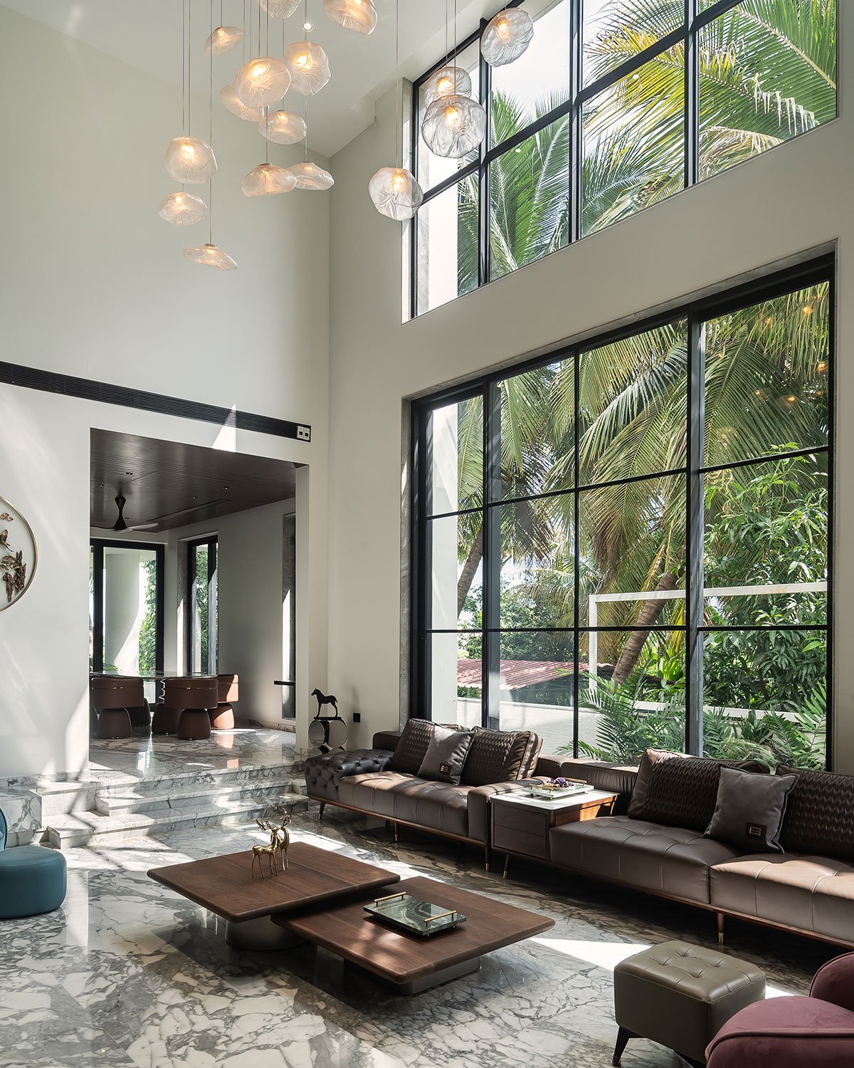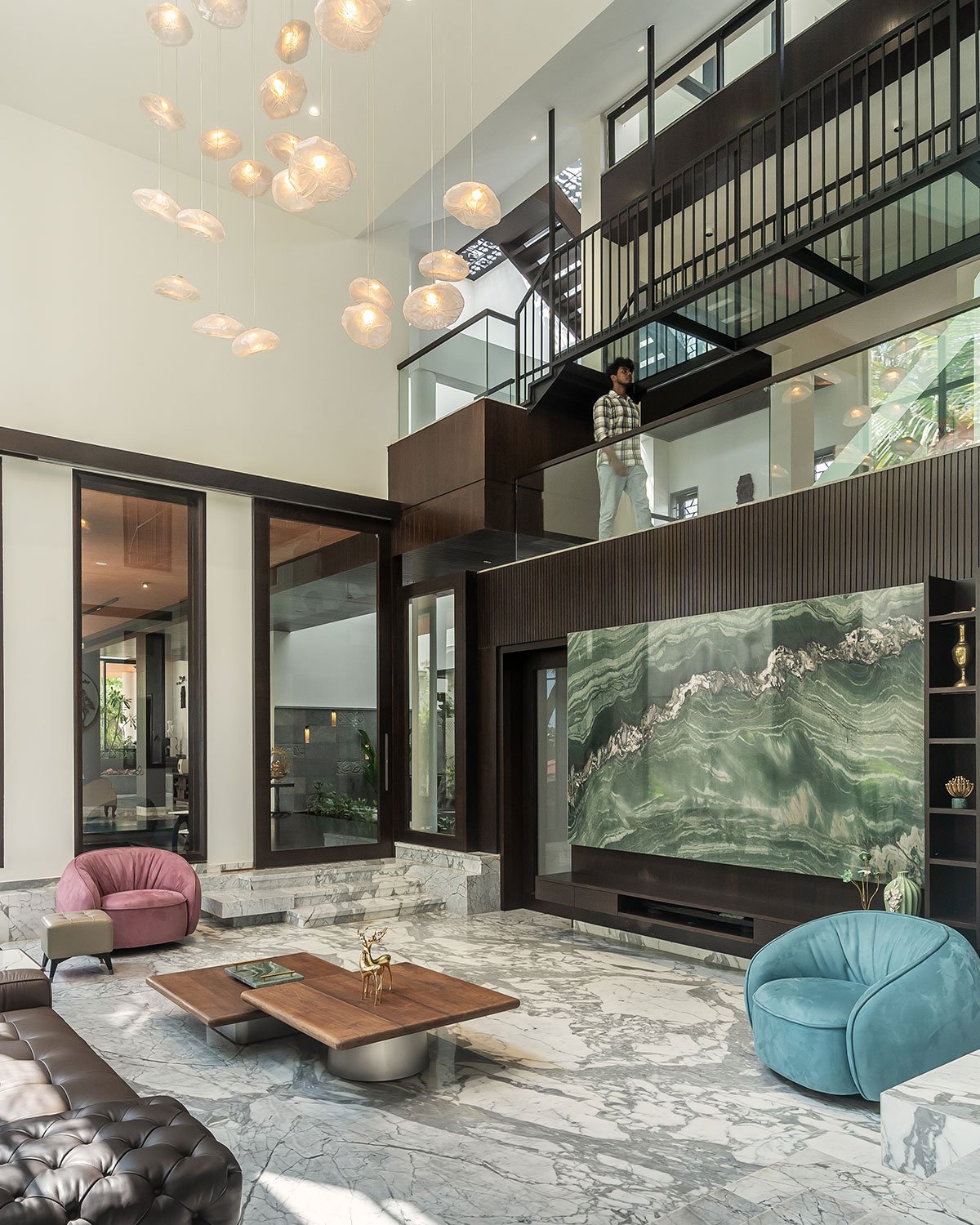 The residence is accessed through two distinct entrances, catering to different needs. A formal entrance leads to the welcome pavilion, offering a grand reception area for guests. In contrast, an informal entrance caters specifically to the client’s elderly parents, providing direct access to a comfortable lounge space designed for their convenience. The internal layout of the house follows an open-plan concept, with interconnected spaces for the kitchen, dining, and informal living areas, ensuring a sense of continuity and openness.