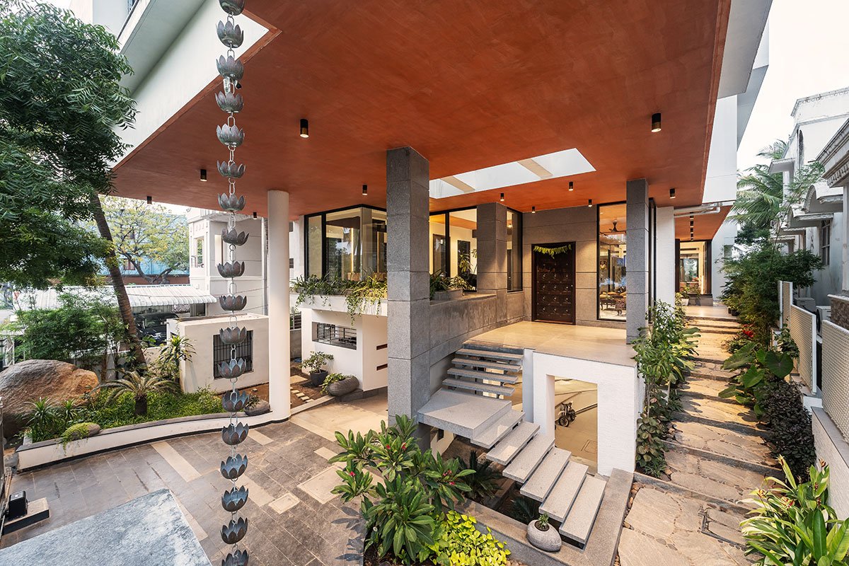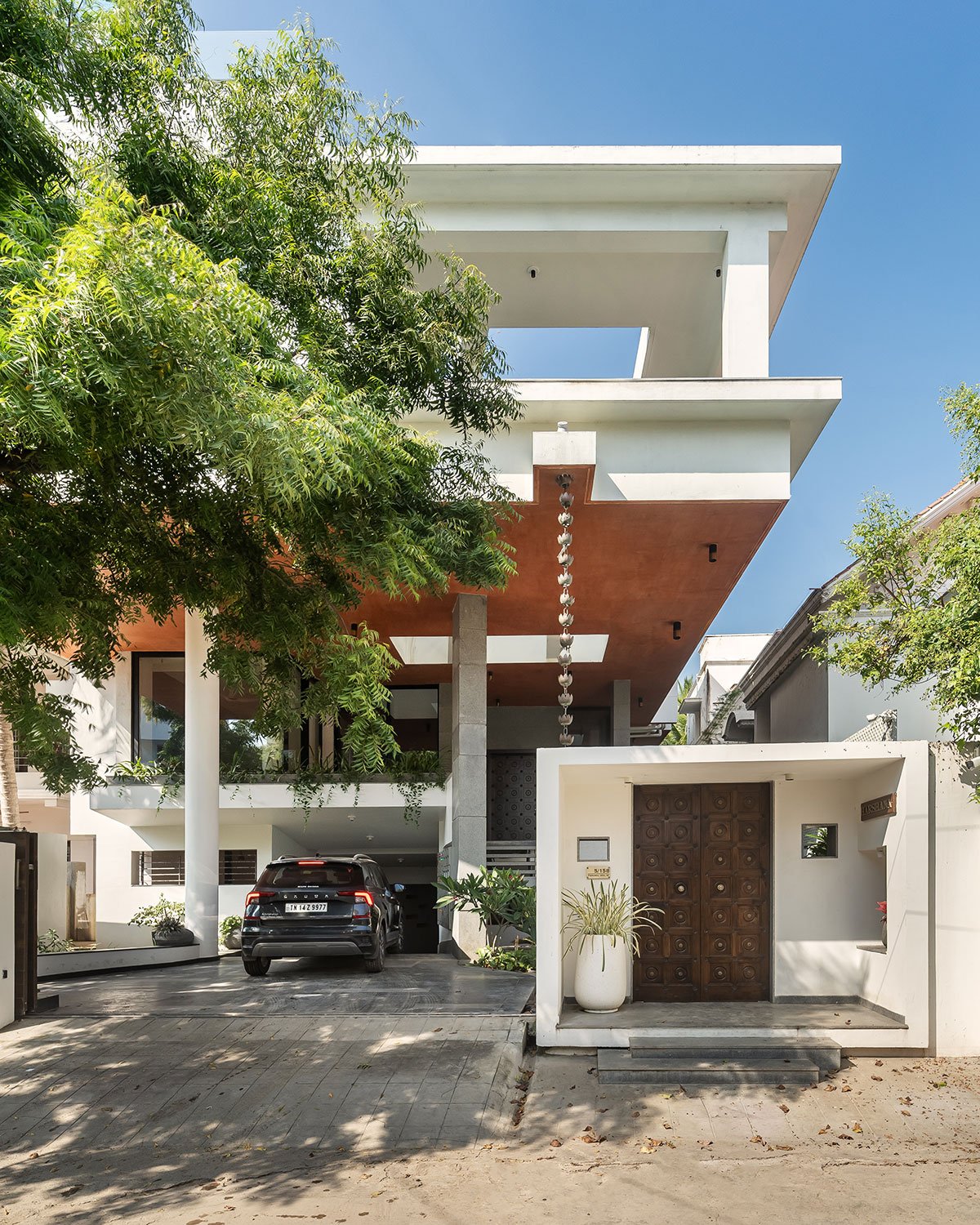 [Text as submitted by architect] Located in Medavakkam, Chennai, Harshana Residence sits amidst a neighborhood of diverse architectural styles and varying building heights. Designed with a vision to revive and reinterpret elements of traditional architecture, the residence blends heritage-inspired concepts with contemporary needs. The design focuses on fostering social interactions, enhancing connections between spaces, and seamlessly integrating nature into the built environment.