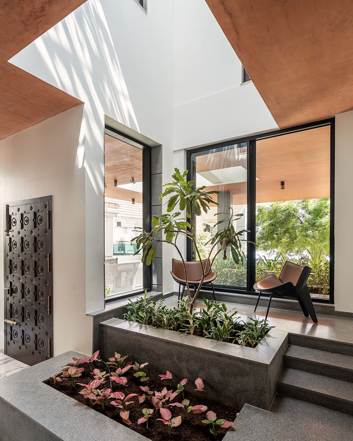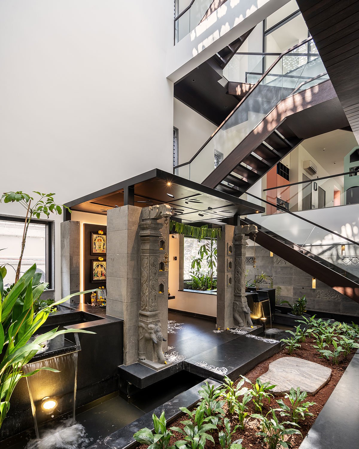 Central to the residence’s concept is the reintroduction of architectural elements such as the thinnai (a traditional raised platform for seating) and kunds (water reservoirs), which act as social nodes for informal gatherings. These features not only encourage interaction but also echo the essence of traditional South Indian homes. Strategically placed open courts punctuate the structure, maximizing natural light and cross-ventilation while establishing a fluid connection between indoor and outdoor spaces. The integration of landscaped pockets within the residence further enhances this interplay, creating a serene living environment.
