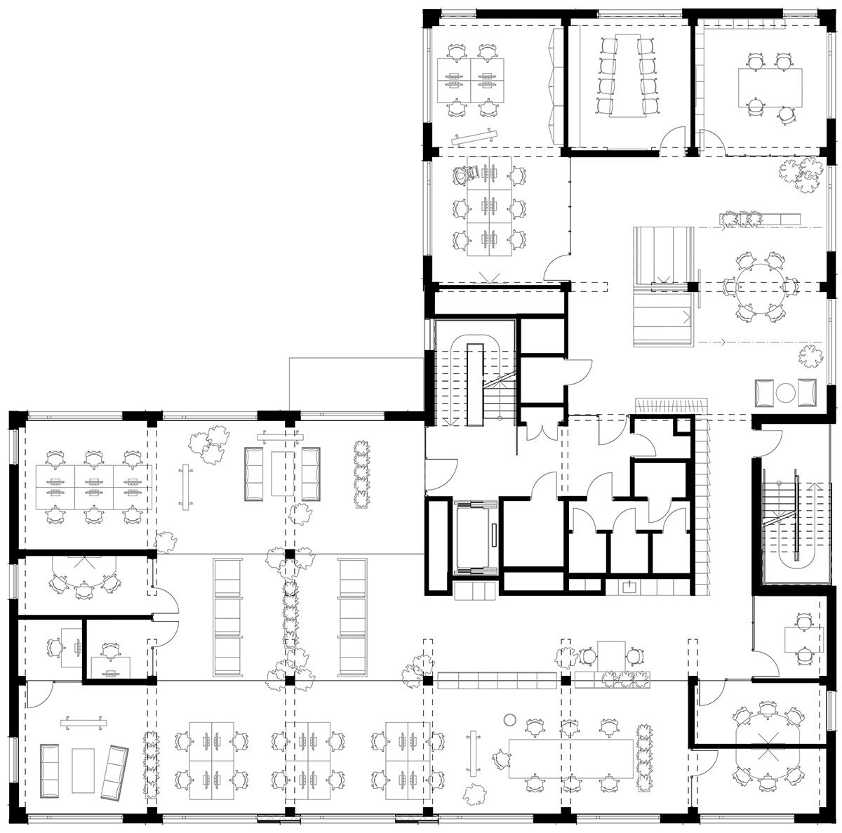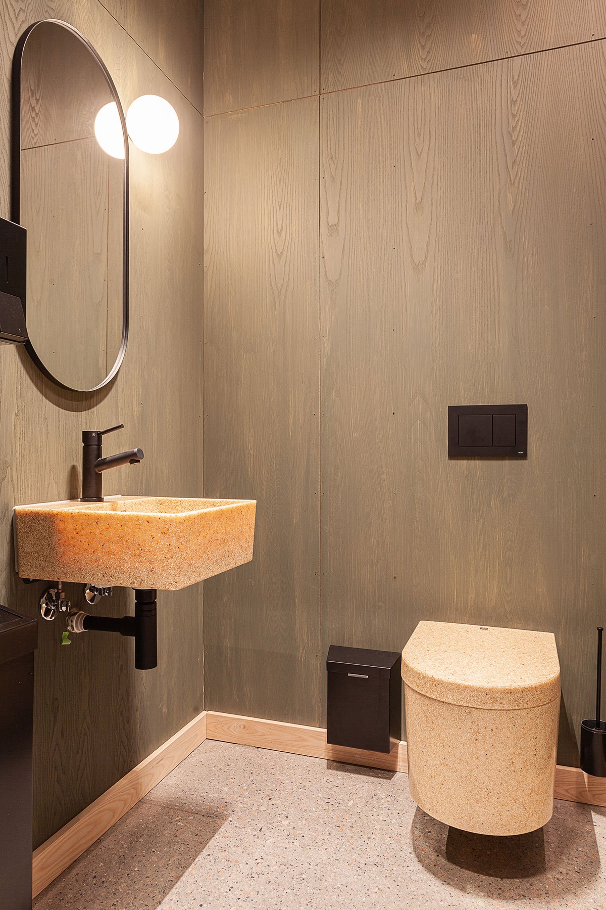The project integrates a substantial proportion of reused and upcycled materials, including ventilation aggregates, acoustic ceiling plates, and secondary room flooring. Moreover, 60% of the furniture constitutes upcycled pieces, while the remaining 40% incorporates biodegradable materials or industrial waste like ocean-harvested plastics.