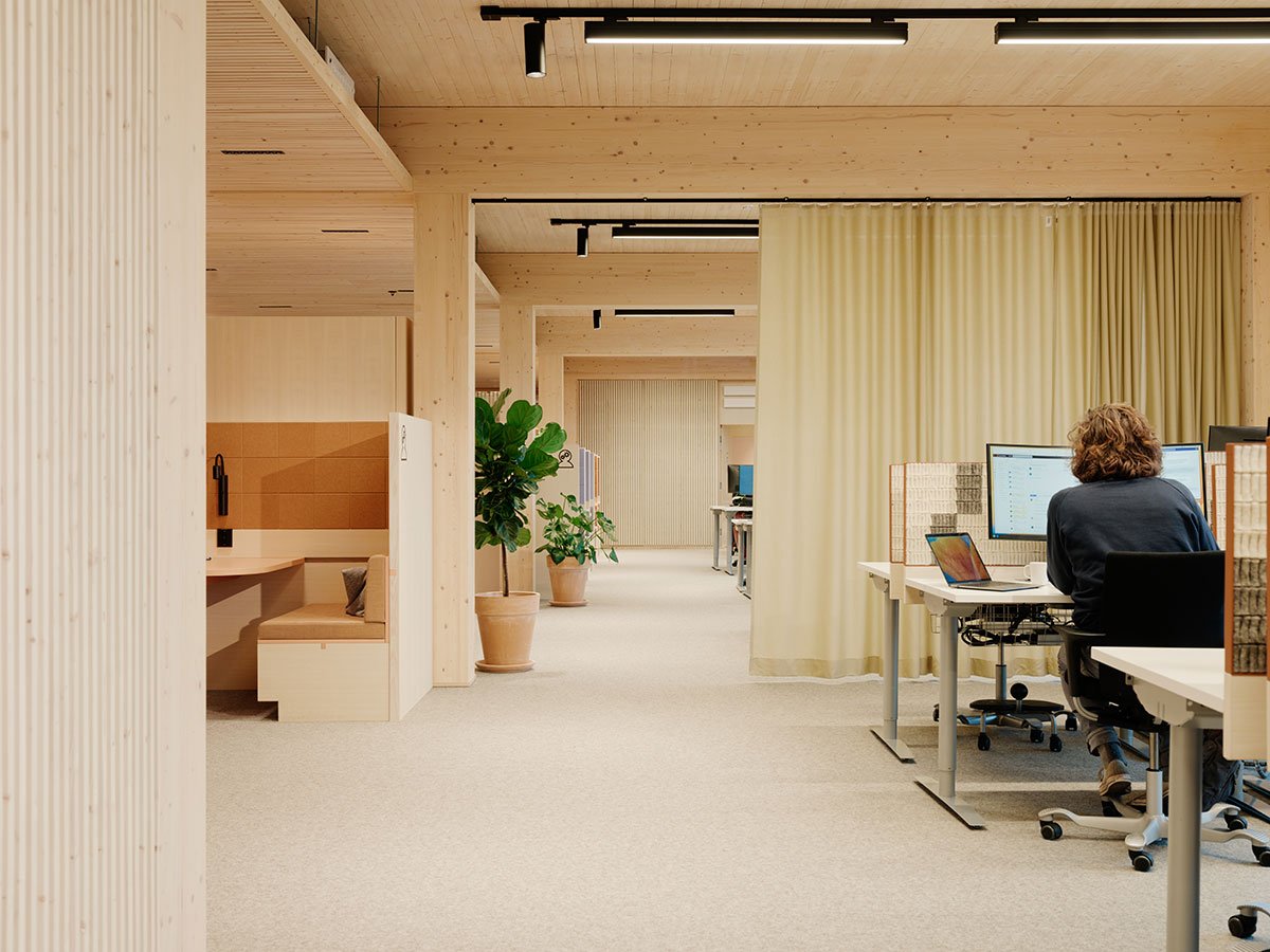 The interior predominantly features exposed wood, cork, and wool elements, with wooden nails used instead of screws for attachment. Harnessing the hygrothermal properties of these organic materials, the building aims to curtail energy consumption, enhance occupant well-being and focus, and mitigate sick leave instances.