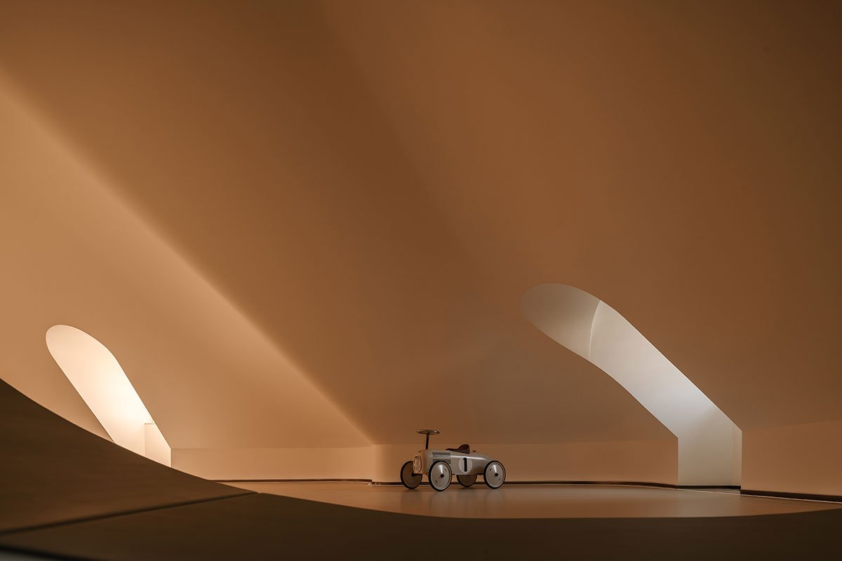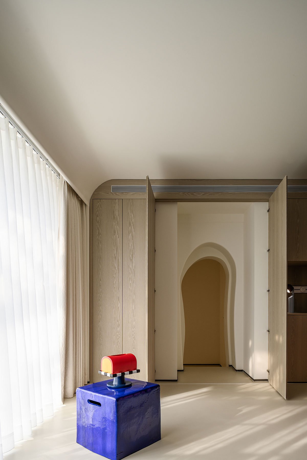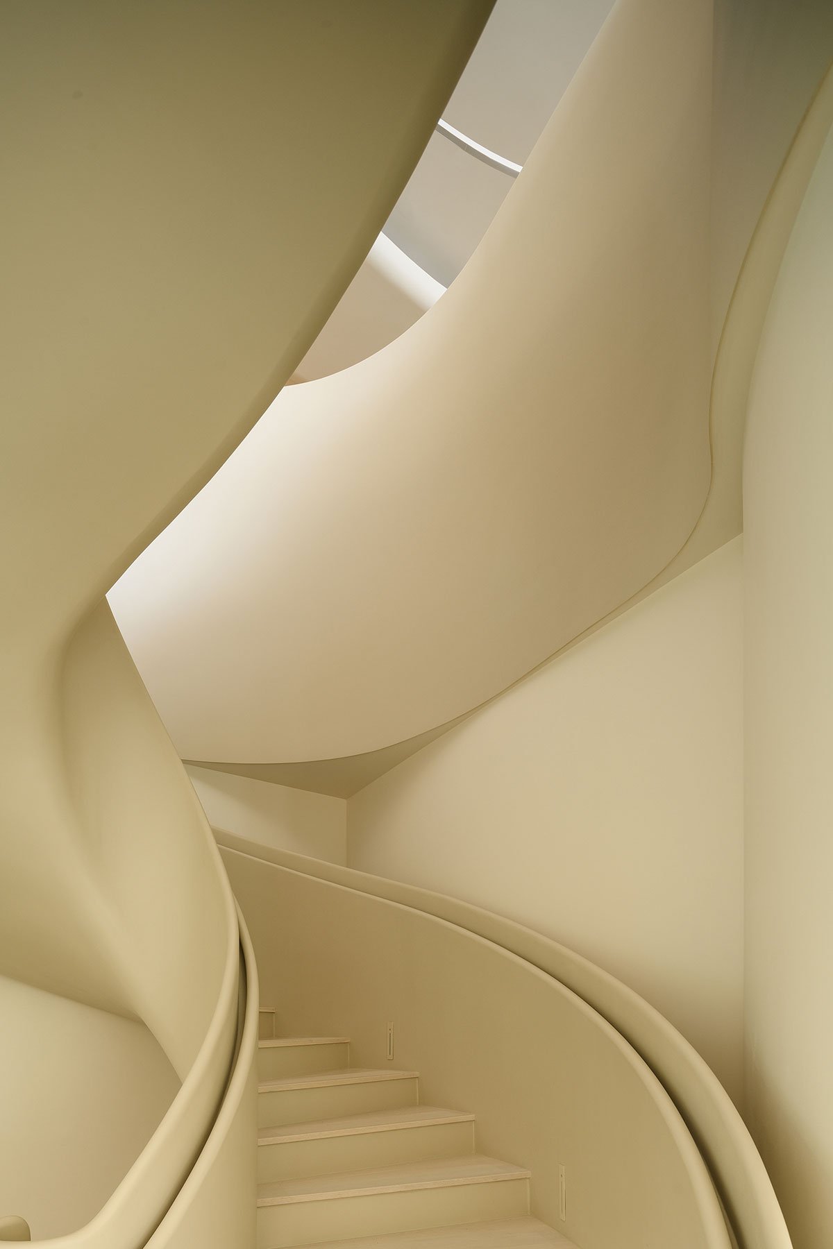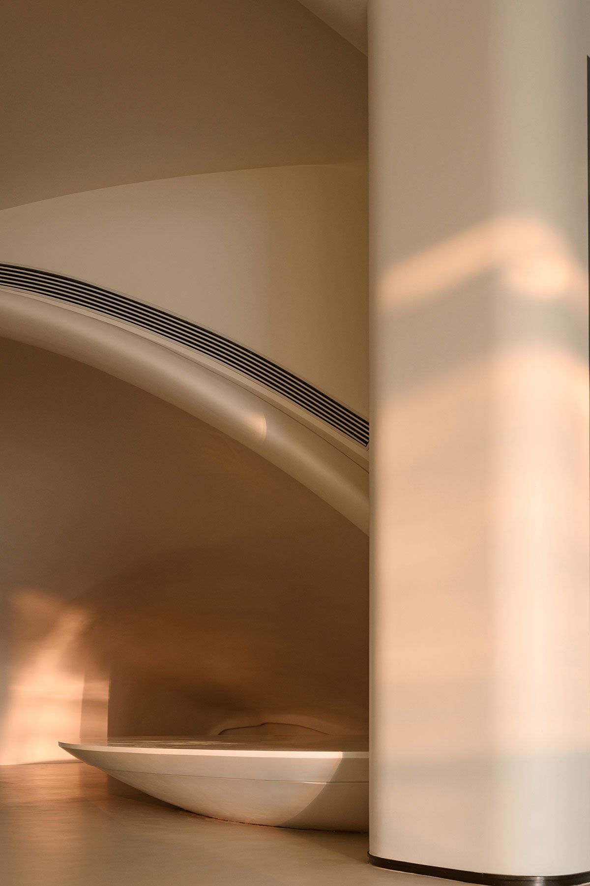 The spiral staircase, with its unique shape in the center, gracefully connects the upper and lower floors through smooth curved lines. Gentle curves, as the basic design language, covers a significant portion of the space. A unique visual tension is cleverly created in the space through light and structure.