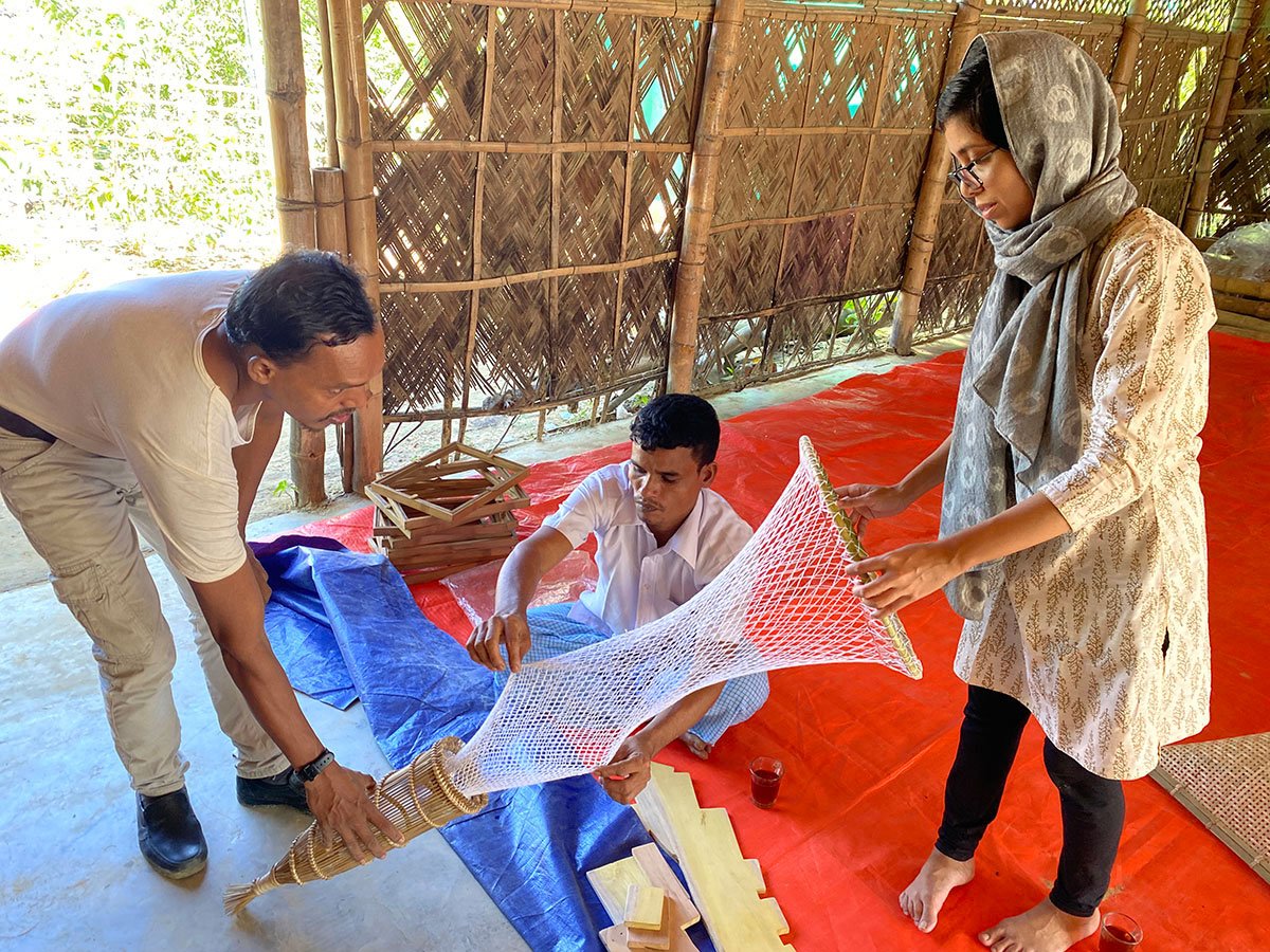 Rohingya artisans and community members came forward with their indigenous knowledge, techniques, ways of life and stories that helped visualize an appropriate approach for designing the space. Nipa palm leaf (om pata/gol pata) pallets for roofing, various bamboo weaving techniques, traditional doors-windows-household patterns, and other information resulted in a continuous process. The elderly artisans who had the expertise for years taught the young generations the methods they used to have. At the same time, the young Rohingya souls explored new possibilities.