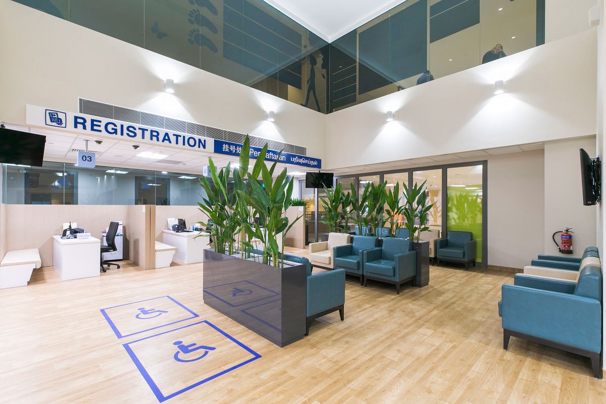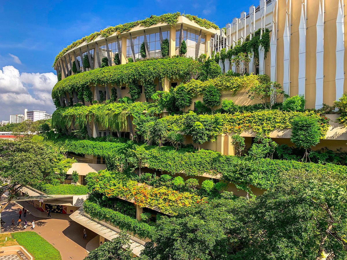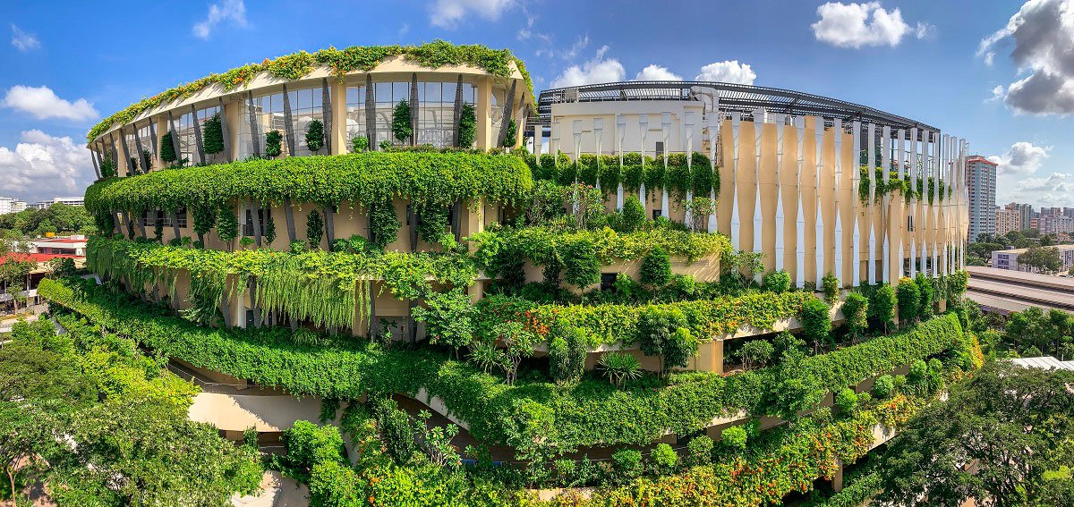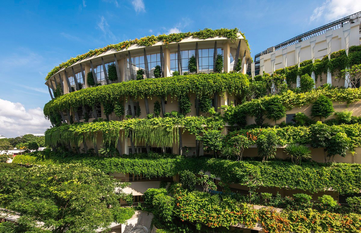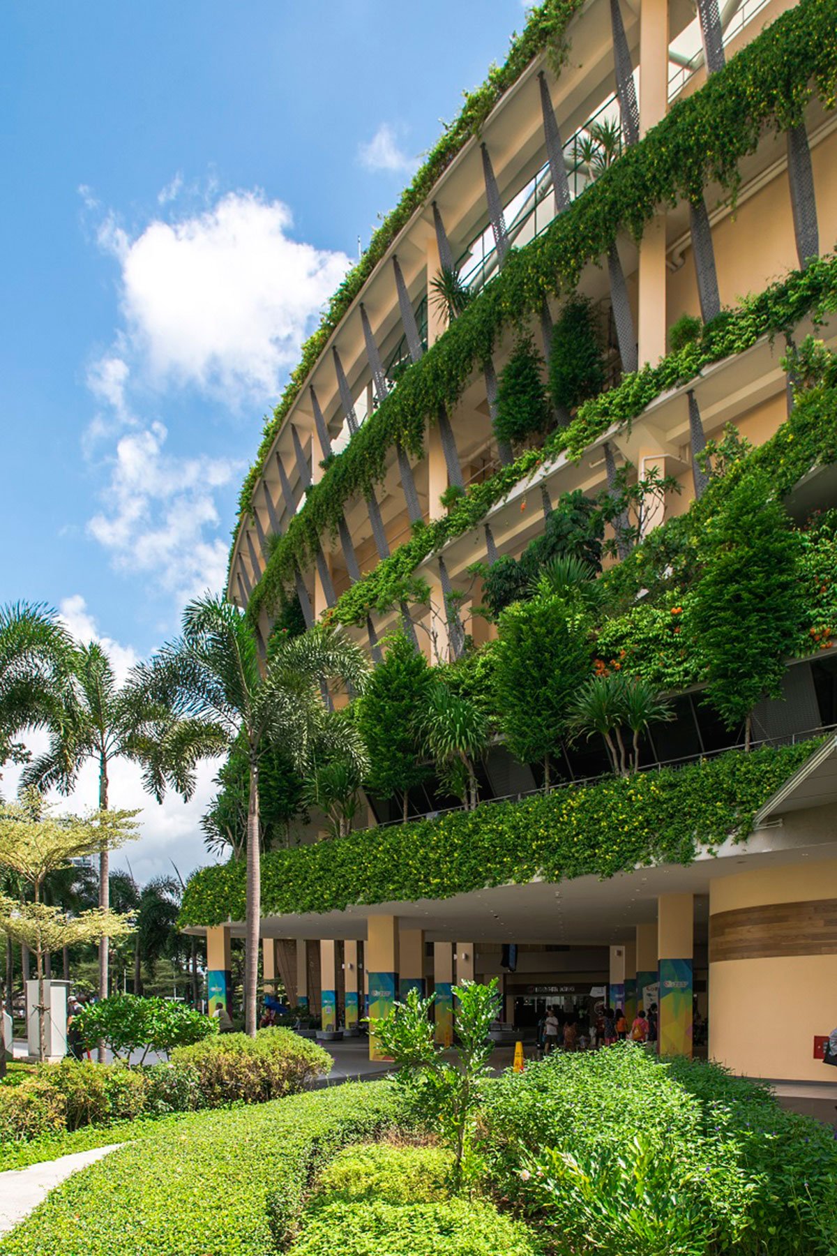 Thirdly, a self-shading façade was conceptualised to reduce heat gains through the façade. Tapered fenestrations, wrap-around tensile fabric and vertical fins help reduce solar heat gain and the incidental cooling load by 30%, by allowing wind to permeate into naturally ventilated corridors on the upper levels. The peripheral planter boxes serve as natural screens to the internal space, reducing heat gain, while having an aesthetic and therapeutic impact.