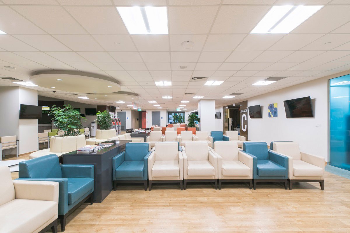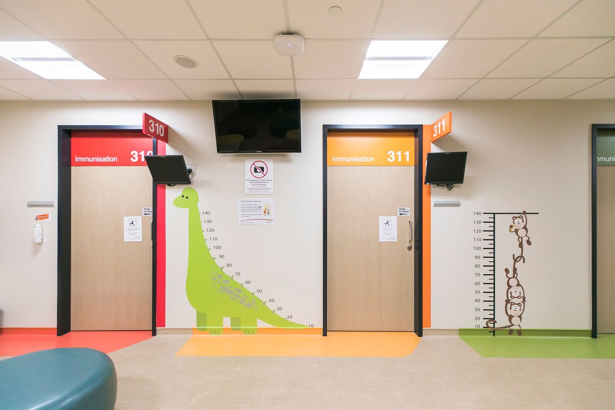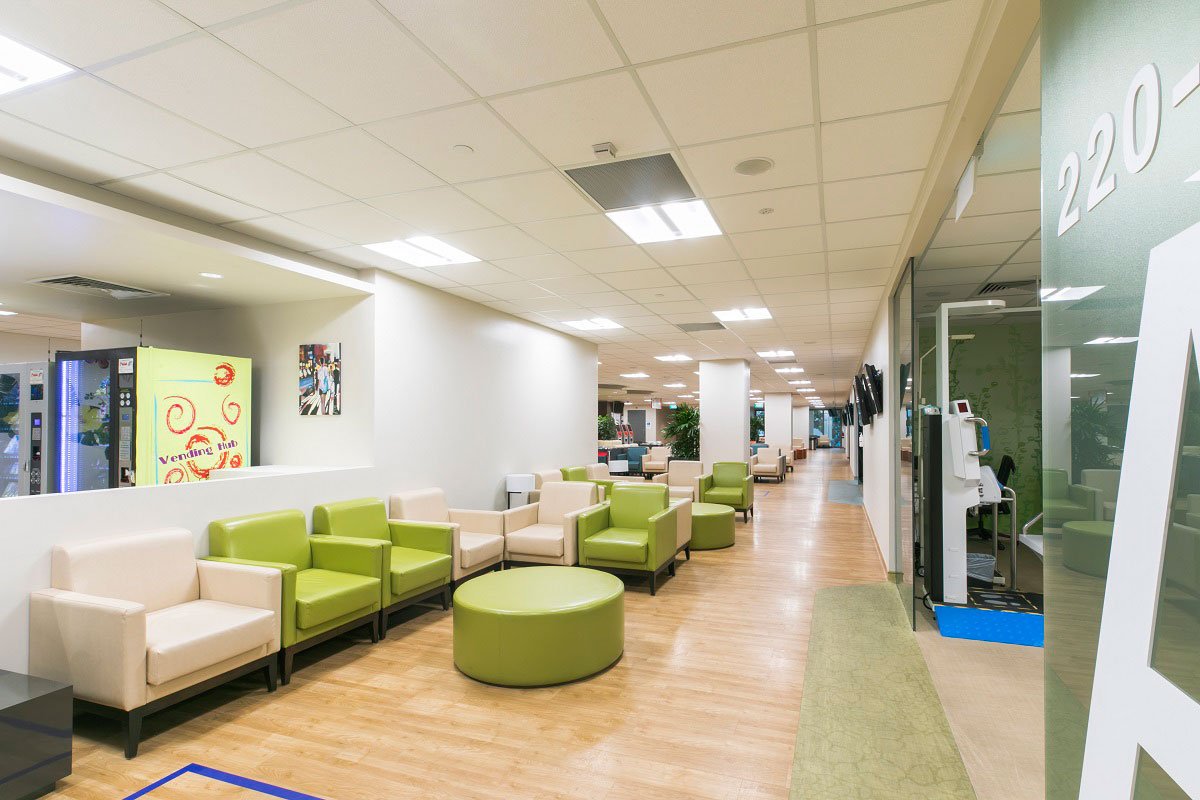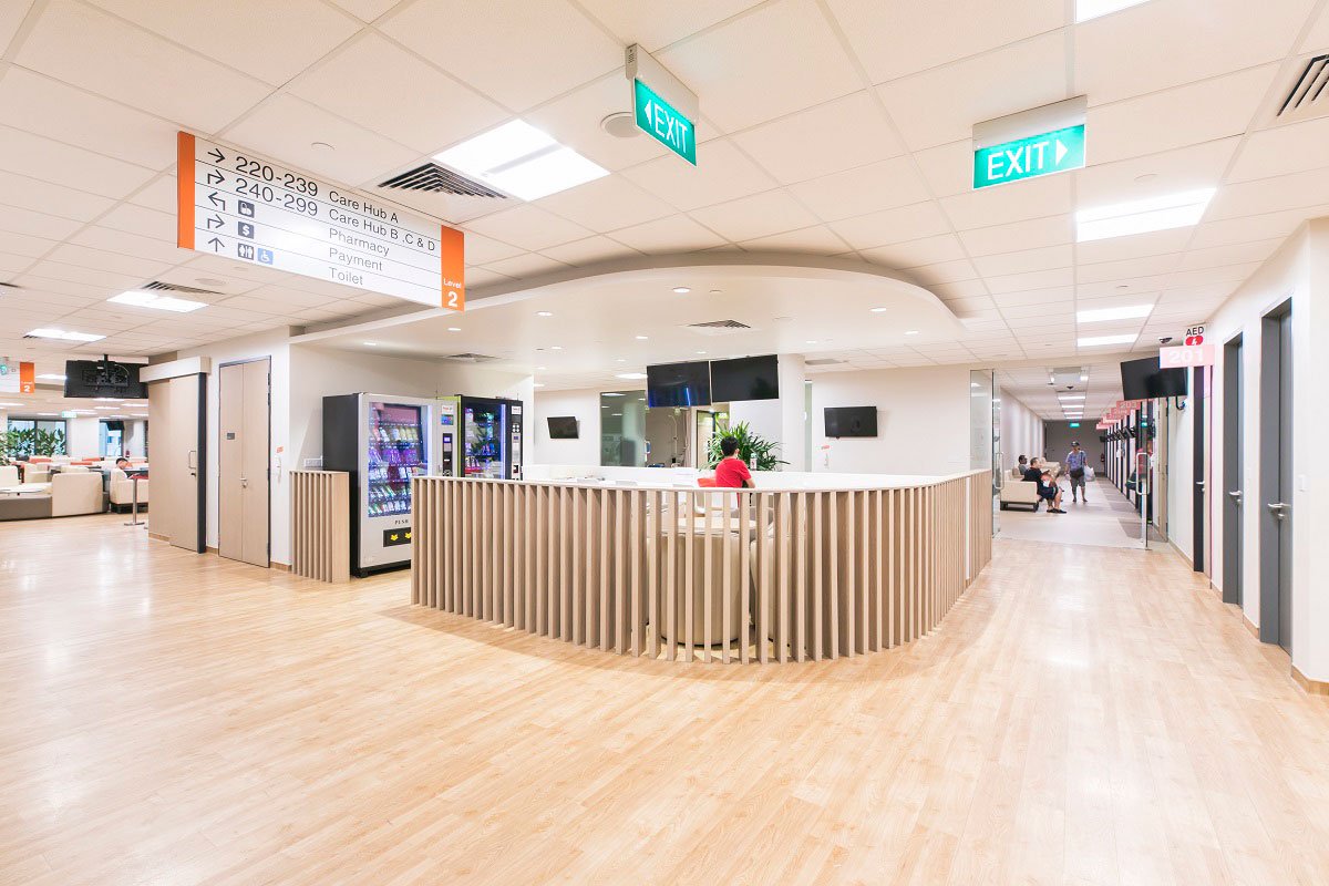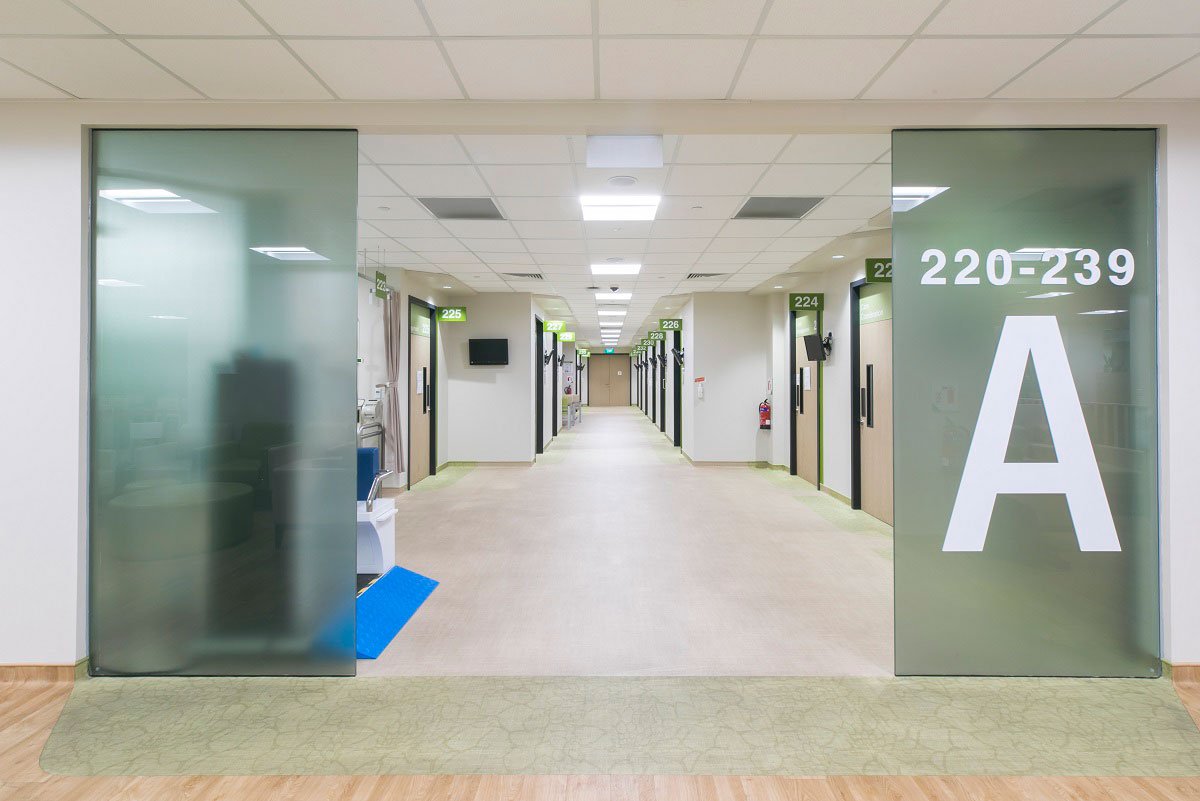 Thirdly, a self-shading façade was conceptualised to reduce heat gains through the façade. Tapered fenestrations, wrap-around tensile fabric and vertical fins help reduce solar heat gain and the incidental cooling load by 30%, by allowing wind to permeate into naturally ventilated corridors on the upper levels. The peripheral planter boxes serve as natural screens to the internal space, reducing heat gain, while having an aesthetic and therapeutic impact.