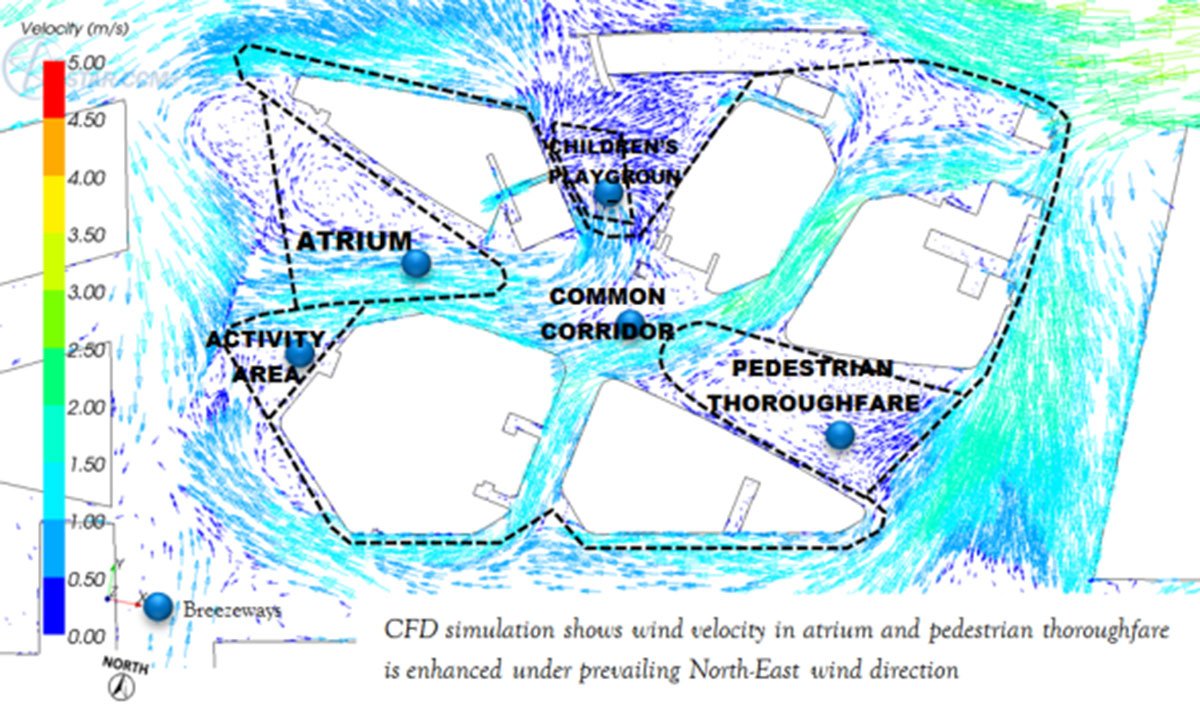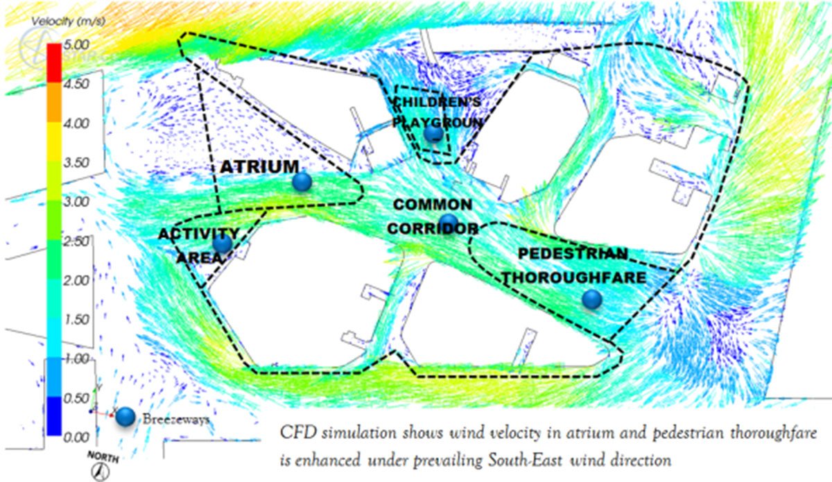 The channelling of ventilation simulation through CFD (Computational Fluid Dynamics) helped to refine the design and achieve acceptable wind flow rates in non air-conditioned spaces.