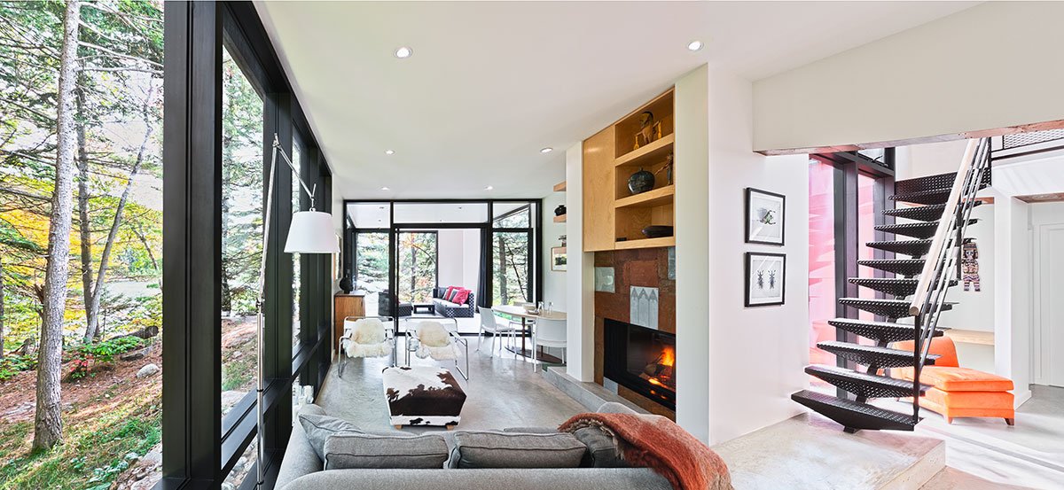 Excerpt: Hill-Maheux Cottage by Kariouk Architects is designed as an introverted home yet connected to its beautiful, forested, lake-side surroundings. The cottage features two “bars” of living space connected by an elliptical loft; one bar contains private spaces, and the other includes public areas. The ground-level volumes are constructed with large glass windows, allowing for privacy without enclosing them.
