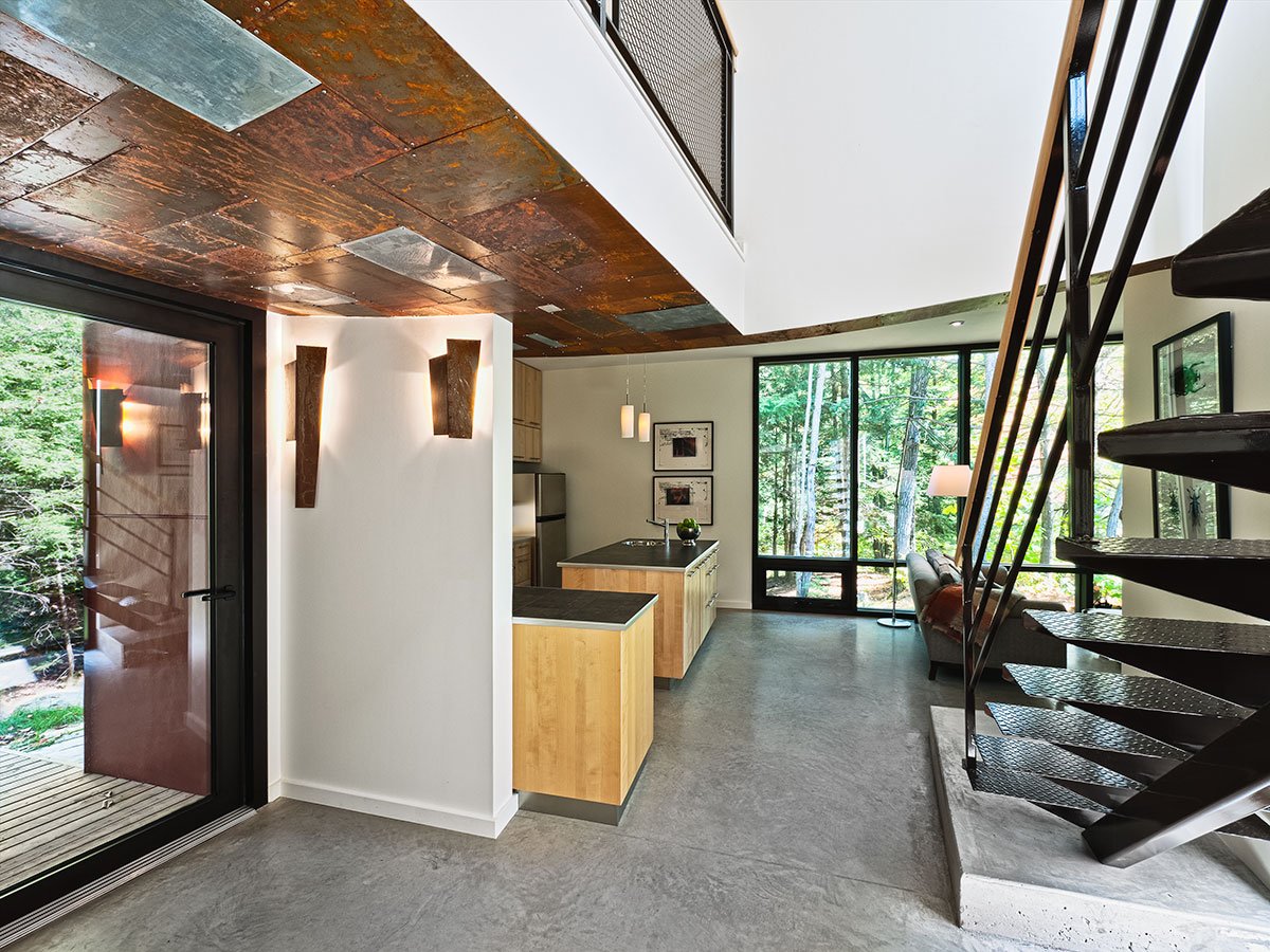 Rather than “walling-in” the two ground-level volumes to achieve privacy, they are made with large expanses of glass and are sited at the edge of the property where vegetation is most dense. The underside of the loft volume and the fireplace surround are surfaced with a “quilt” of metal plates, including copper and zinc printing plates that the clients received from a printmaker friend. Many of the plates are etched with landscapes from the original printmaker, but many are etched with works created by the couple and their daughter. There are, however, many yet-unetched plates that can be removed, worked by the clients and their friends visiting the cottage, and then reinstalled. In this way, the house keeps a record of its past.