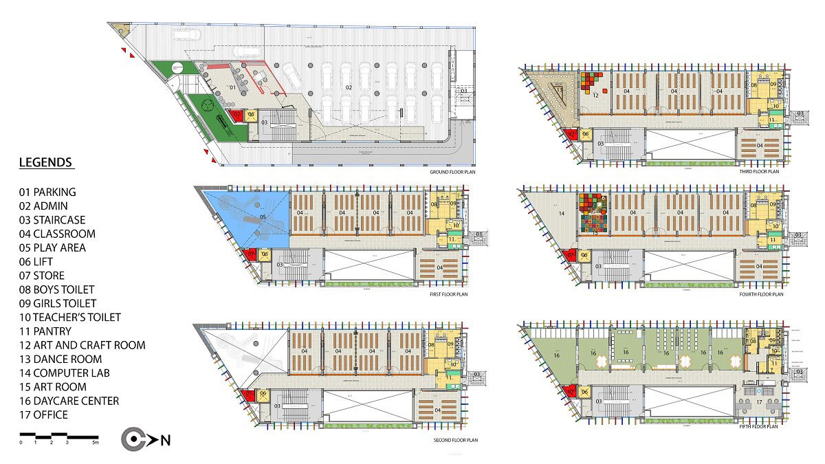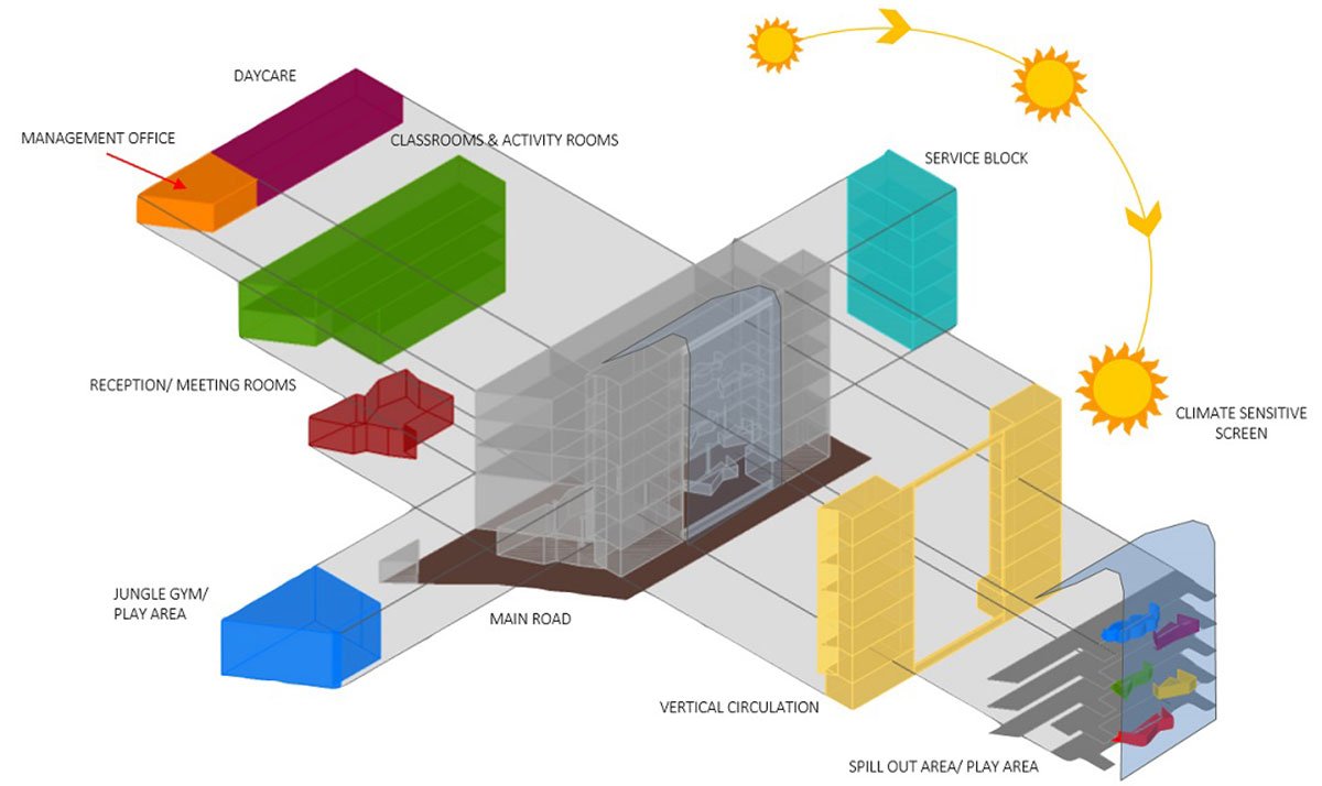 Typical floor planning: Classrooms placed on the east side. Staircase and atrium on the west side. These ways classrooms are protected from harsh sun heat from the southwest direction.