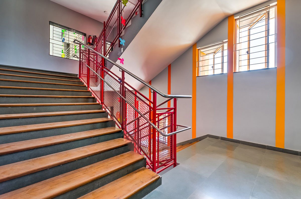 Safety First: Each element in the building is well thought for its placement and design to ensure child safety at the utmost level. Elements like railing, handrail level, window grills, electrical component placement, fire fighting system, emergency exits, corner & edges of furniture, door shutter and frame junction, step riser (122mm), the wood tread of the staircase, etc.