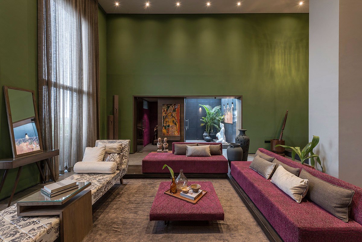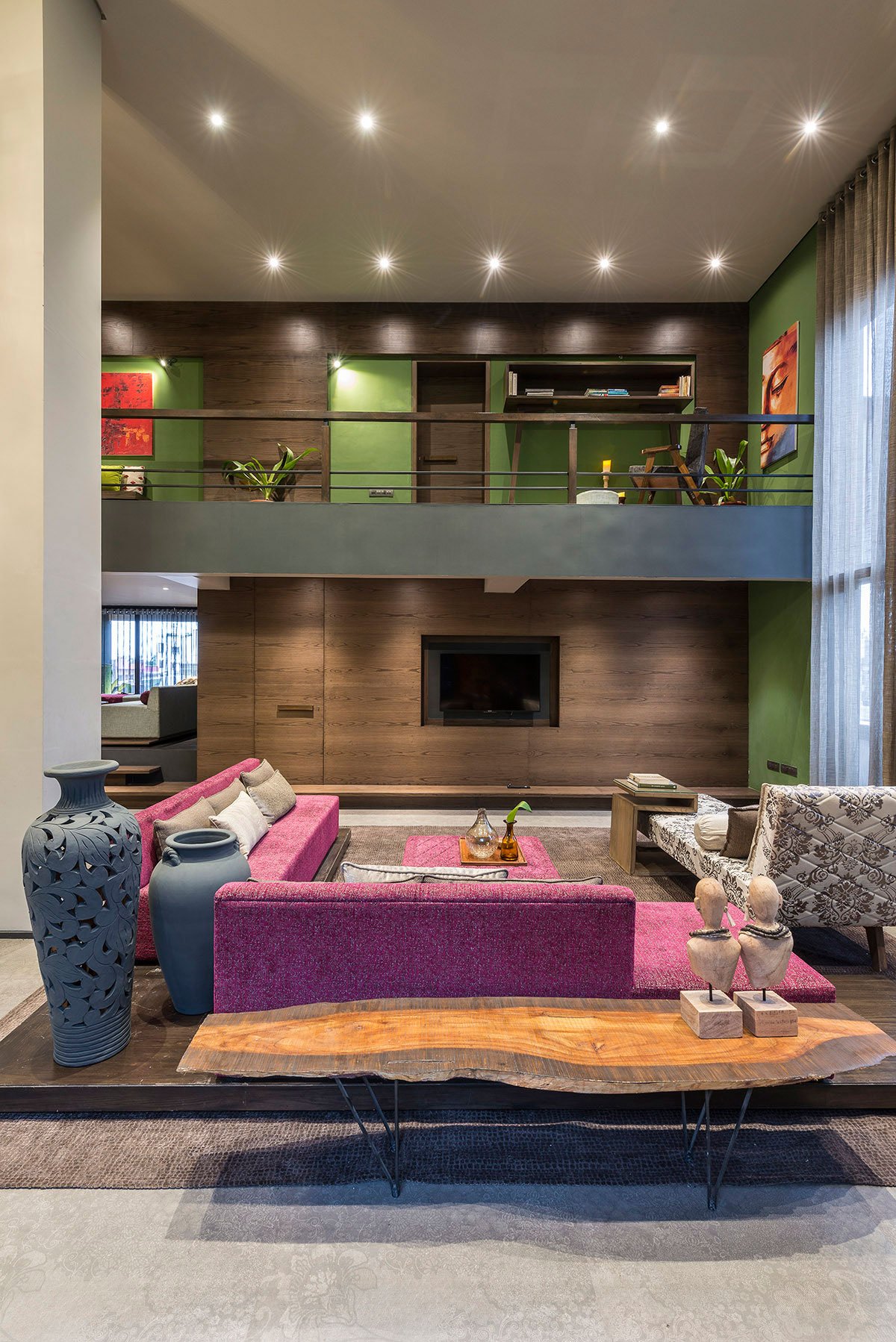 Hues of different colours on walls and upholstery complement timber textures and mark an exuberant perception of the living space. Traditional paintings and elements as artefacts give a touch of Indian roots in the chic space. The Dining area is connected to the family living with change in levels ascribing individual identities to both. Design elements in these spaces are continued to the terraces blurring the boundaries between inside and outside.