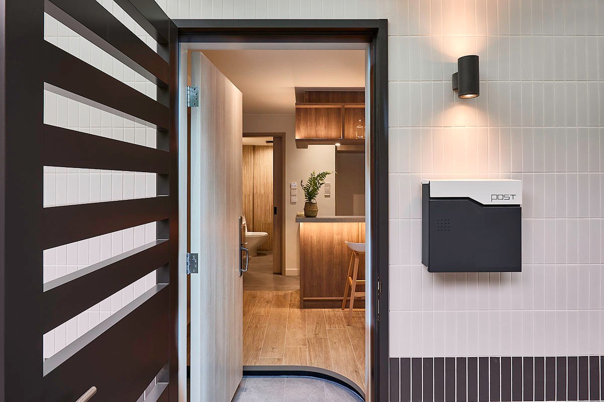 The simple yet settling facade starting to give the inhabitants a sense of home already when they are approaching their apartment from the main road. The neat & clean combinations of light grey & off white tiles, having a subtle contrast to the overall ambient without being odded out from the surroundings.