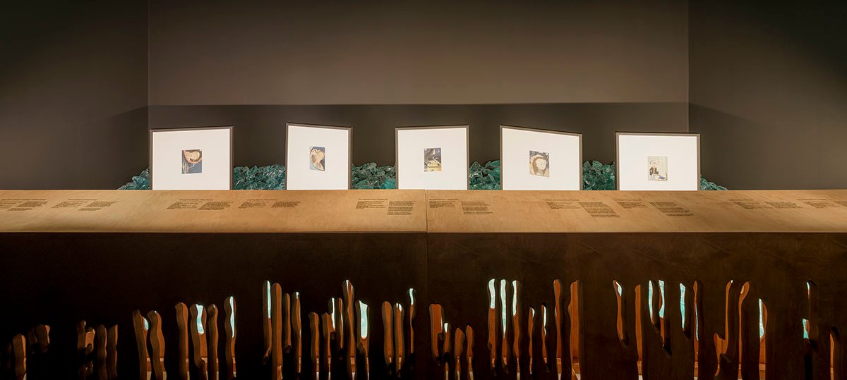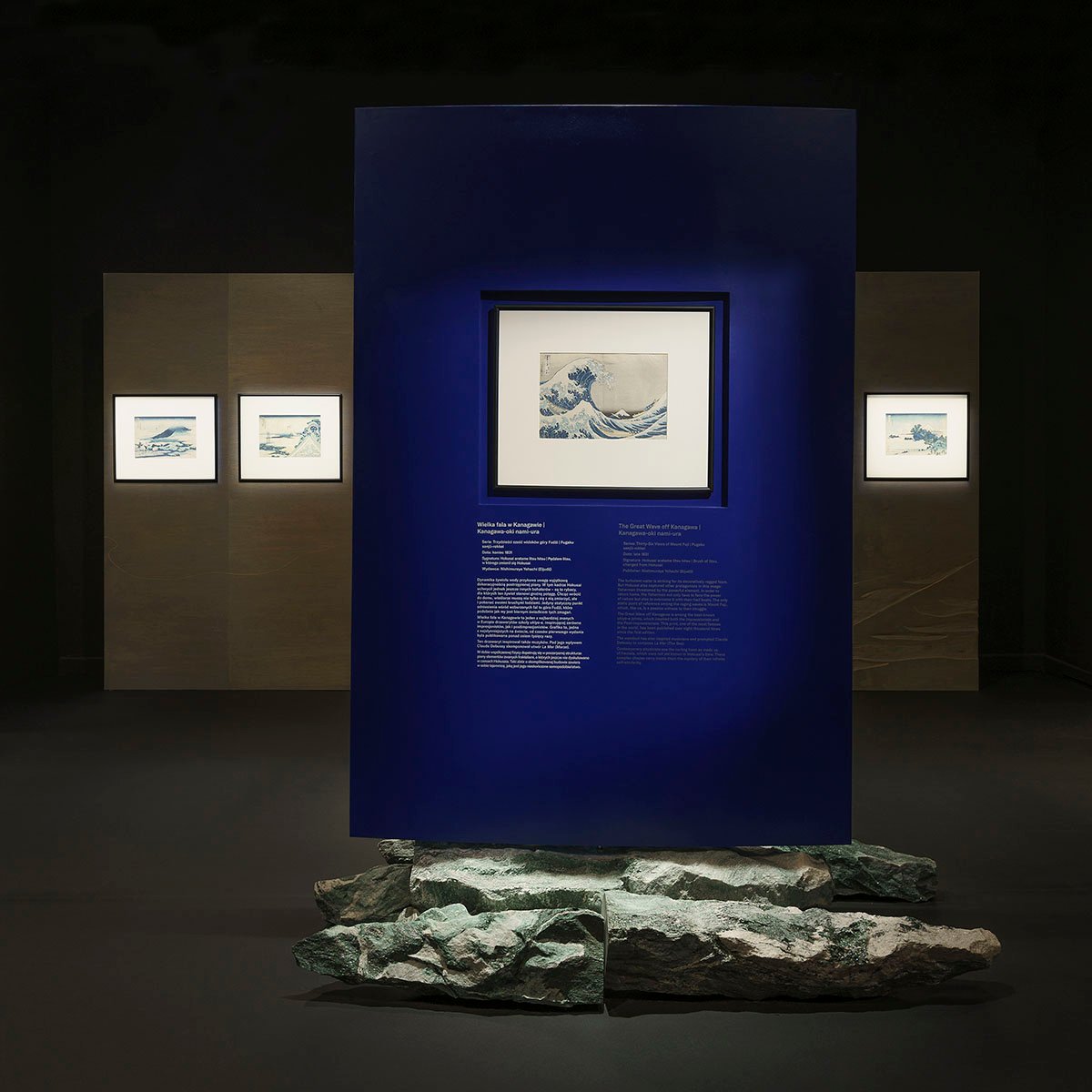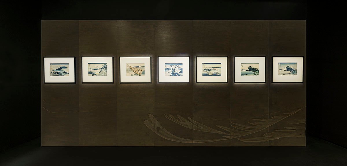 Also, smaller separating elements were designed individually. The wall with probably two of the most famous works by Hokusai (“The Great Wave off Kanagawa” and ”Fine Wind, Clear Morning”) stands on a specially selected boulder, which may suggest a reference to historical solutions in the shaping of Japanese gardens (keiseki stones) and architecture (soseki stones). The background for this free-standing display is a screen for selected works from the series “Thirty-Six Views of Mount Fuji”. The panel boards, hand-dyed gray, are cut by an engraving which is an enlargement of a few lines from the “great wave” exposed in front of it. This gesture was intended to illustrate the woodblock carving technique on a larger scale and strengthen the relationship between the work of art and its background.