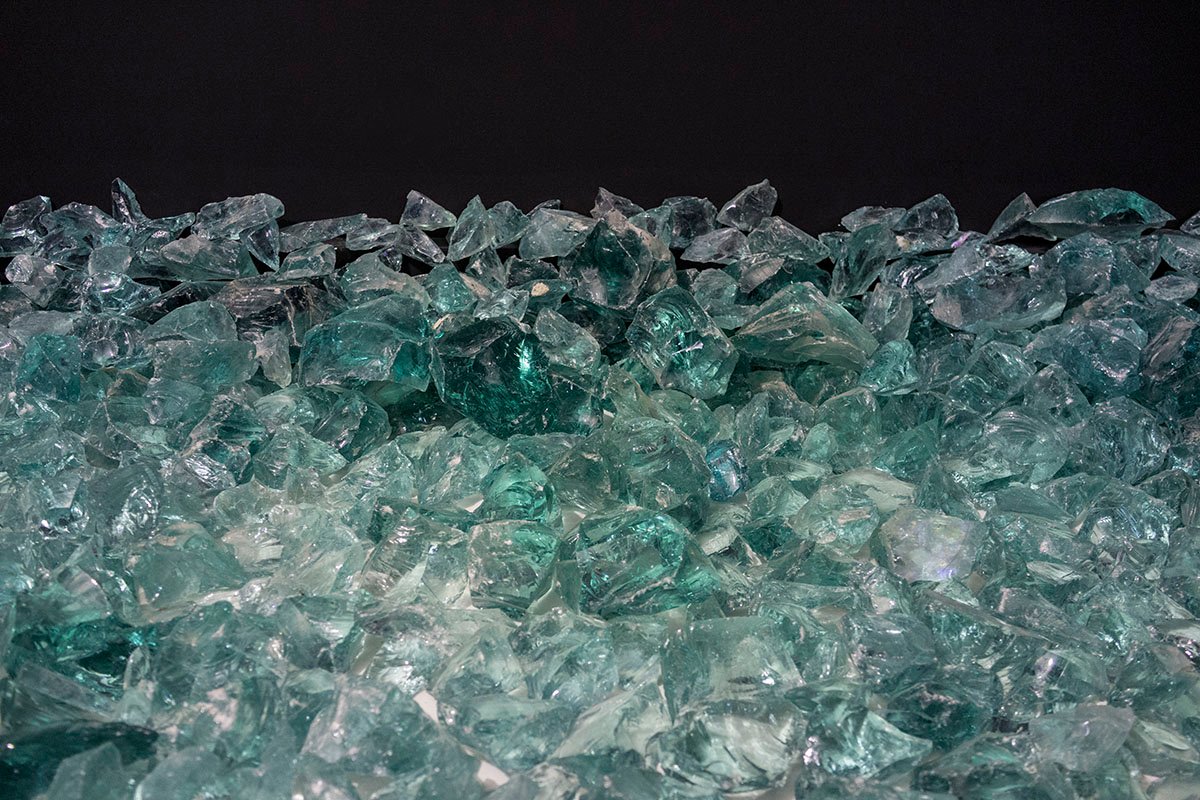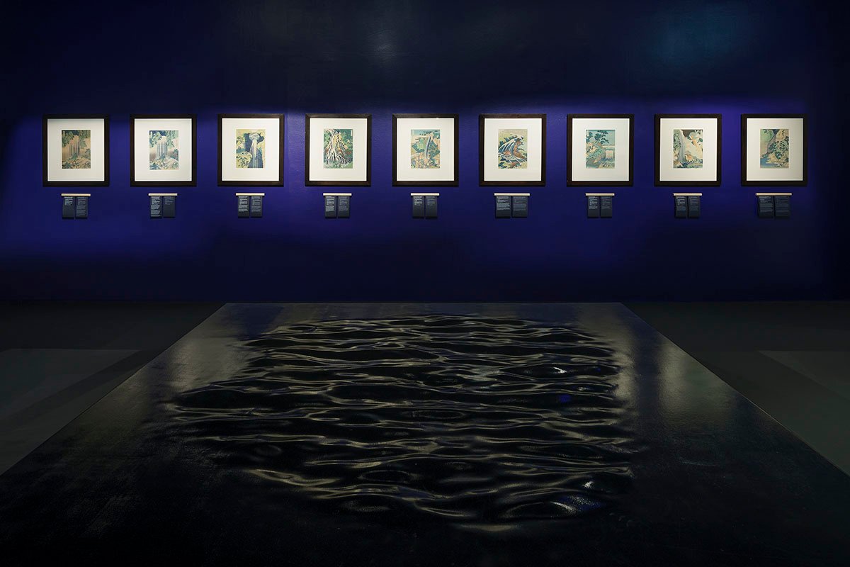 Passages…” are to serve for reflection, contemplation and tranquility (the presence of works of art has been limited in their immediate surroundings). The shapes, colors and textures of the selected boulders indirectly refer to the works displayed in specific rooms. Importantly, these stones were only borrowed for the duration of the exhibition, and after its end, they will be returned to the company dealing with their distribution and will serve to decorate some new gardens in the future. In subsequent exhibition spaces, the selection of colors and materials is also based on specific works by Hokusai. In the room with the representations of “ghosts and apparitions”, free-standing frames with woodblock prints appear in a camouflaged „garden” filled with pieces of turquoise sintered glass. In turn, in the dark blue room with illustrations of waterfalls and bridges, a spatial installation inspired by the surface of water is placed in the central point. This attempt to capture something elusive in a permanent form fits in with the concept of ukiyo-e, describing old Japanese art as “images of the floating world”. This idea is present in many elements of the exhibition arrangement, including the intangible ones – discreet music, moving projections, or the smell of various natural materials (wood, stone, canvas, paper).