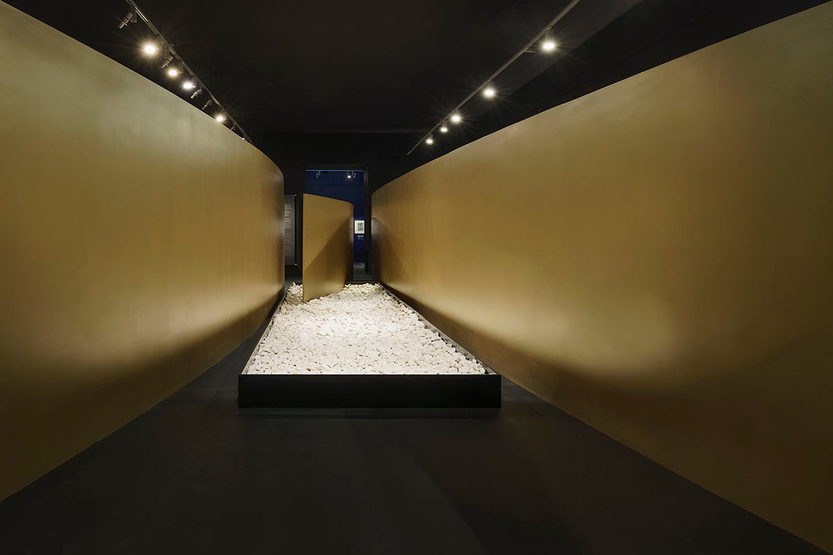 Low walls made out of various materials separate individual interiors and suggest the itinerary of the visit, guiding guests to the subsequent groups of works of art (”Views of Mount Fuji”, “Literary Inspirations”, ”Ghosts and Apparitions”, ”Waterfalls”, ”Surimono. Occasional Prints”, ”On the Tōkaidō Road”, ”Pattern books”, ”Hokusai Manga”). The rectangular interiors feature additional diagonal screens, painted with silver and gold varnish. Such subdued, metallic hues are a reference to similar colors used in Japanese art (fuki bokashi – shading, silver plating and gilding in woodblock printing, maki-e – craft gold plating) and architecture (hishibuki – wiping off zinc sheets). Seven free-standing narrow walls (”slimmed” at the edges to a width of between 1 to 3 cm) disturb the regularity of the layout and symmetrical enfilade arrangement. Their plan may resemble calligraphic brush strokes or cuts in woodblocks.