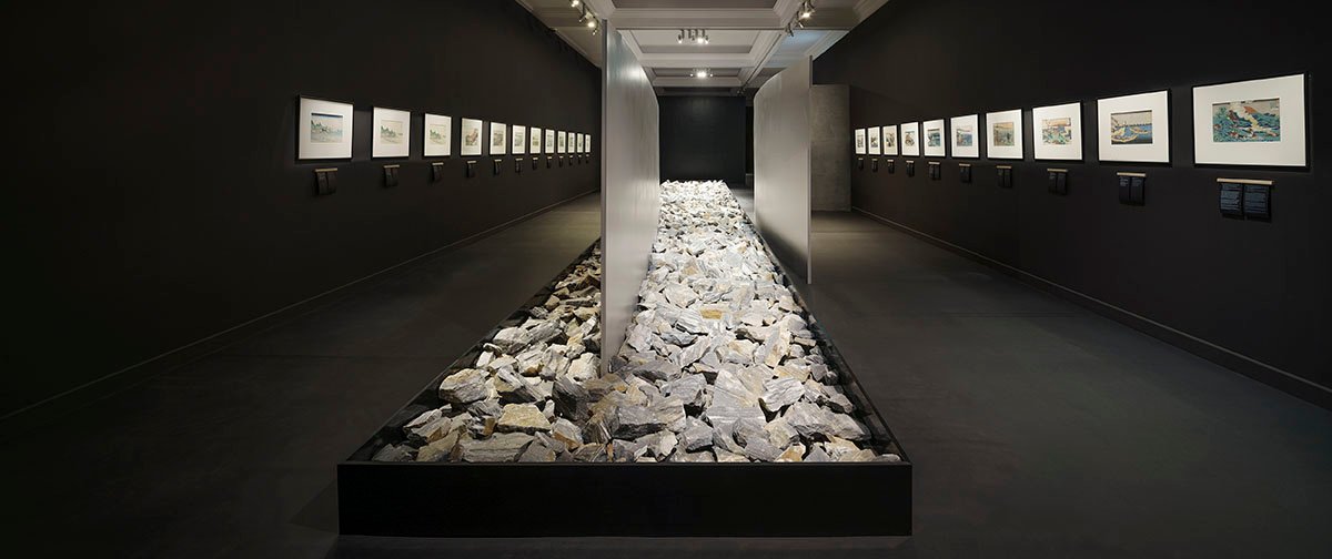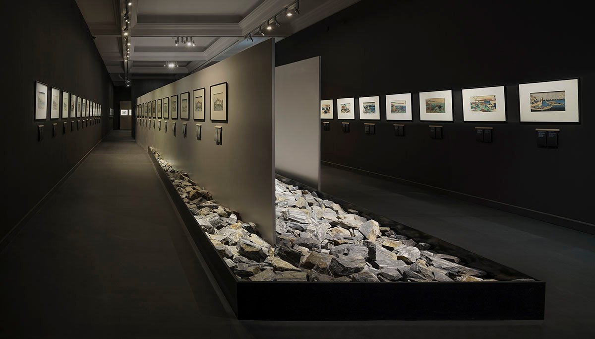 One of the most important elements of the arrangement are four “gardens”, adjusted to the individual exhibition spaces. They are an attempt to introduce nature (so beautifully and synthetically presented by Hokusai) into museum interiors. Sometimes this “implementation” is literal, on other occasions indirect, but in both cases it allows for a wide range of interpretations and associations with the work of this Japanese artist. The “gardens” in the first and last room are filled with specially selected stones. The temples in Kyoto: Daitoku-ji, Ryōan-ji and Ginkaku-ji were the inspiration for such unusual accents in the exhibition spaces. As in the ancient Japanese art of landscaping, the oblong “dry gardens” (karesansui) in the exhibition ”Hokusai.