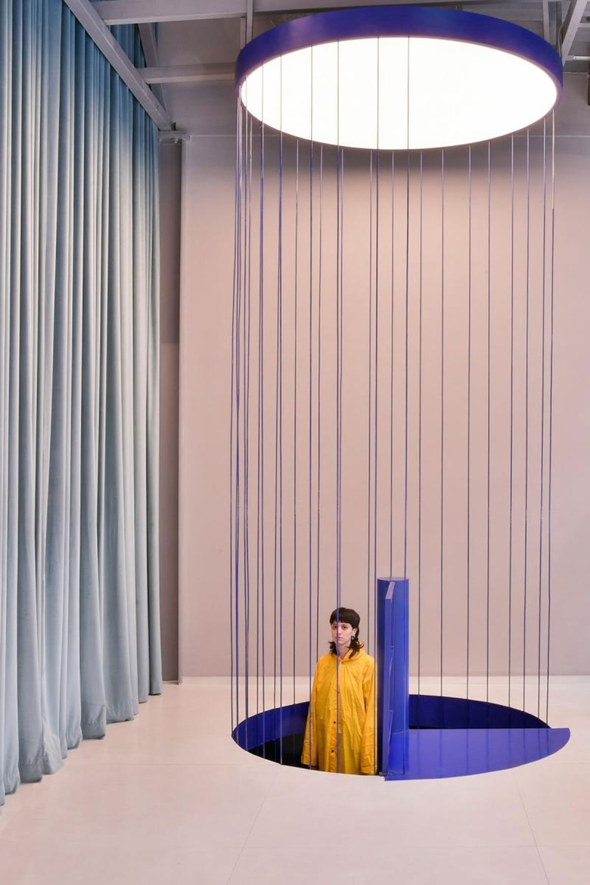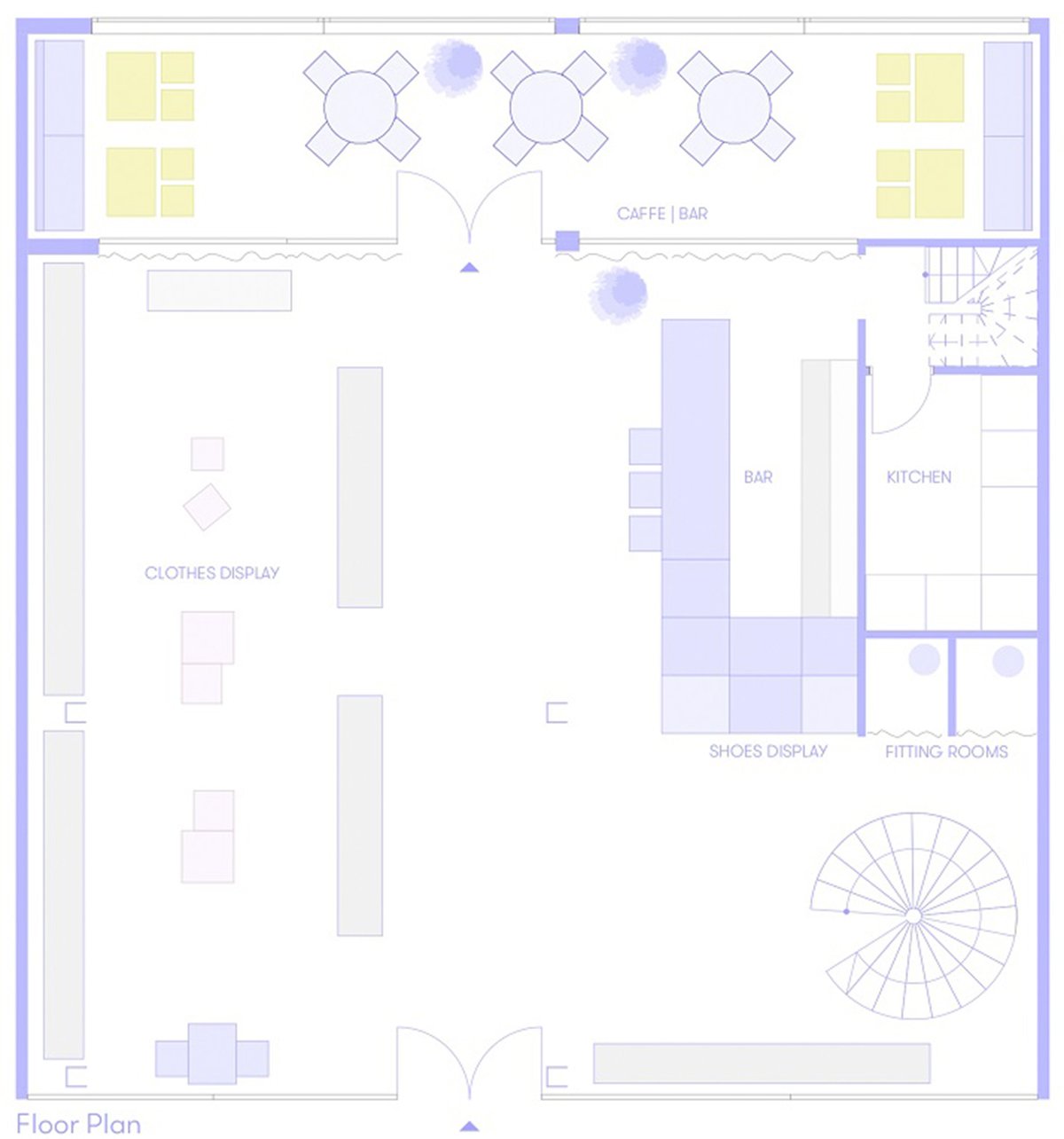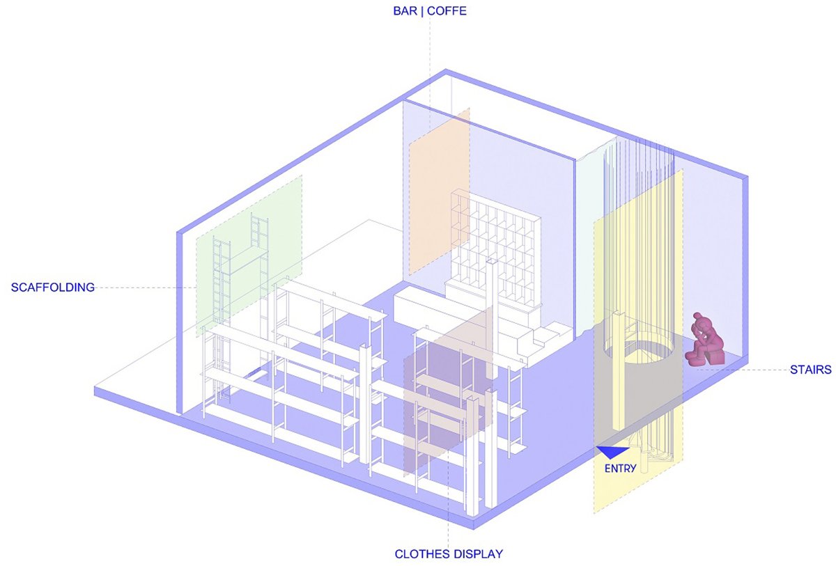 Homme is a concept store known for its various options of clothing brands for men. Since the design is an extension of the already existing store, it was important to create a new visual marker that links the two floors together and adds to the identity of the store. The royal blue colored stairs, encircled by metal wires that act as a railway as well, do just that… and they invite the visitor to check out the newly designed space. The floors are rendered in ceramic tiles, the walls colored in plain gray whereas the ceiling is made of corrugated metal sheets. To further emphasize the urban identity of the design, scaffolding was used to display clothes and to create other elements within the retail function of the store. A three-meter high mirror mounted within the scaffolding is a visual marker of the store as well. The mirror gives another dimension to the space due to its size but also due to the surprising effect of seeing a mirror staying perfectly put inside a scaffolding. Another “urban” element to the store is the bar, which is made up of exposed black glass bricks. One can easily enjoy a drink as they look around for what clothes to buy in the store.