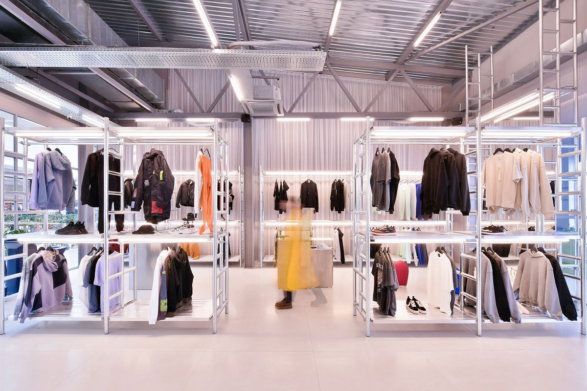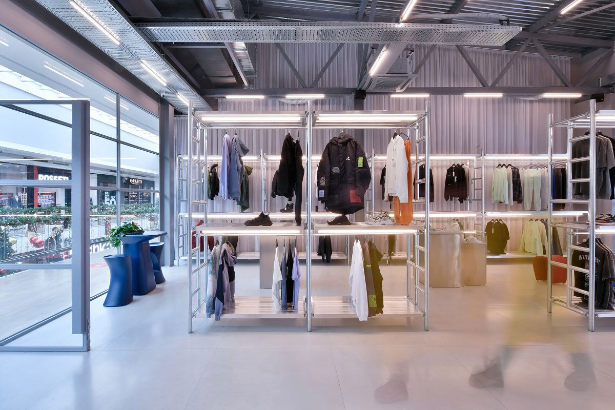 Excerpt: Homme, designed by Maden Group, is a concept store for various options of clothing brands for men and is an extension of the existing store. Steel for shelving, tubular neon lights, a high ceiling and corrugated metal sheets, a glass brick bar with drinks and neon colored furniture, strengthen Homme’s reworked identity and combine a shopping experience with that of cocktail bar experience, while at the same time making the visitor completely forget that they are within a shopping centre in the first place.