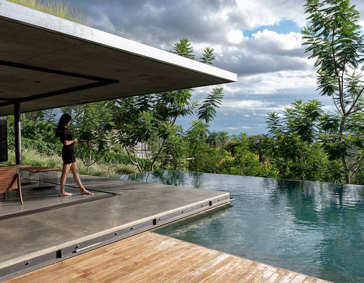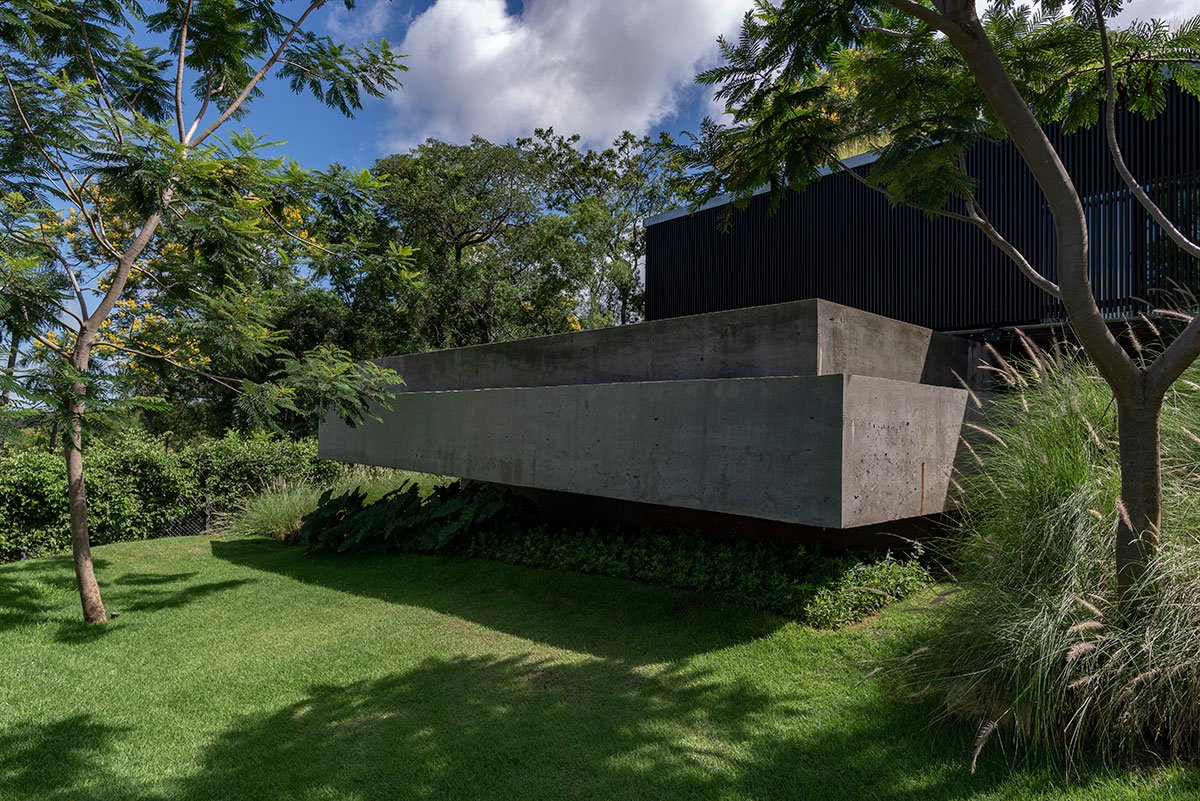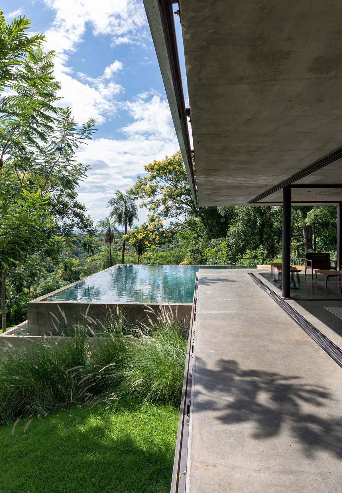 Excerpt: In Horizon House designed by BAUEN the intention was to intervene in the land the least as possible. The house, made almost entirely of concrete, floats over the ground. The downhill topography of the land goes diagonally so it is dugged in a corner where the house is buried, while the pool is laid in the other corner. This semi-burial of the house allows the perspective of the passerby that walks on the street to be respected, a visual continuity.