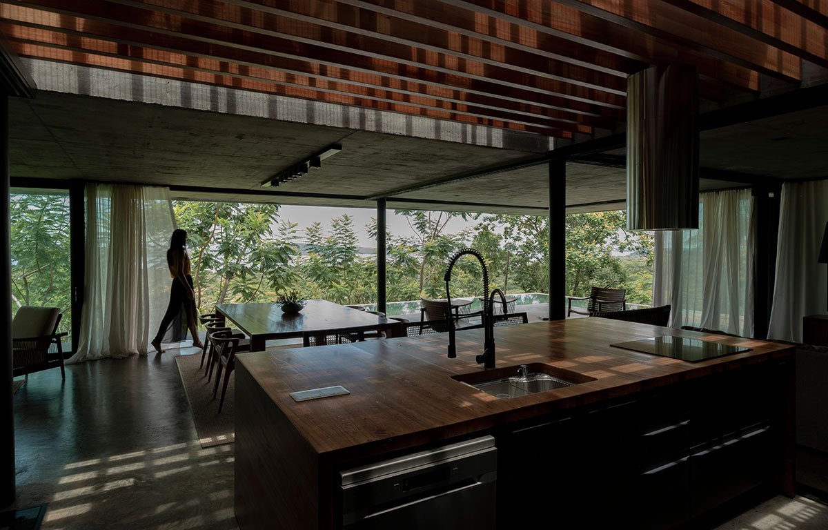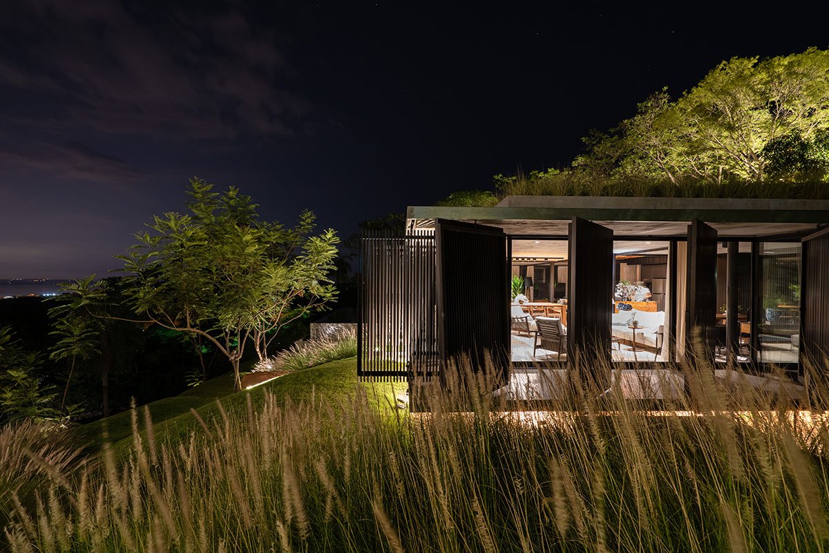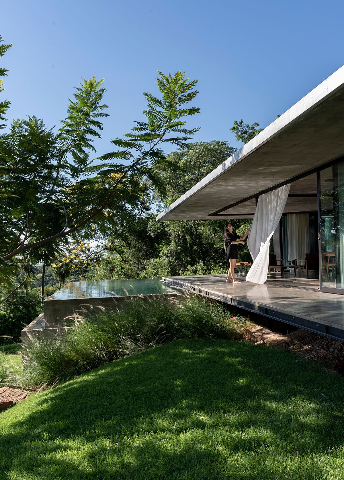 Excerpt: In Horizon House designed by BAUEN the intention was to intervene in the land the least as possible. The house, made almost entirely of concrete, floats over the ground. The downhill topography of the land goes diagonally so it is dugged in a corner where the house is buried, while the pool is laid in the other corner. This semi-burial of the house allows the perspective of the passerby that walks on the street to be respected, a visual continuity.