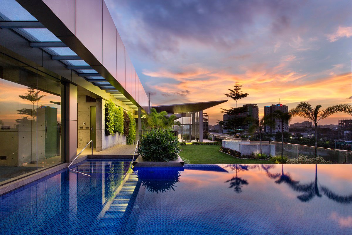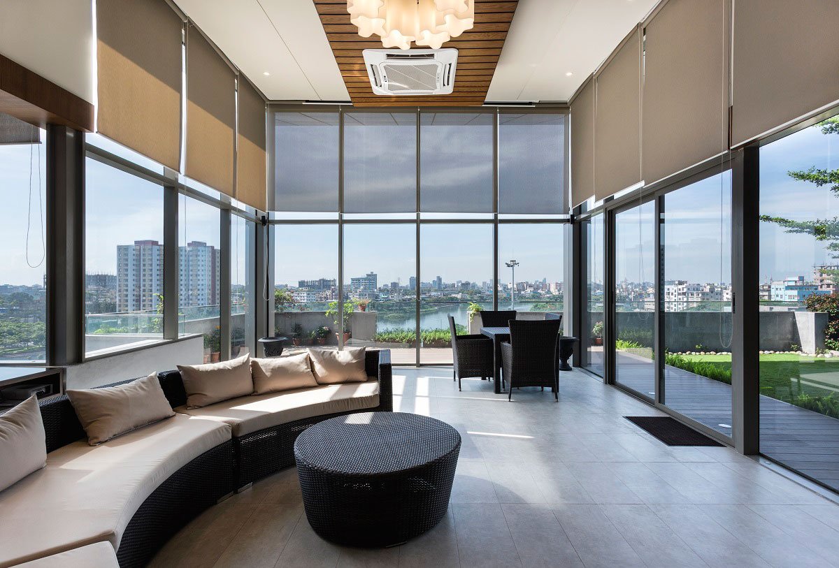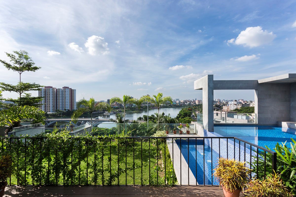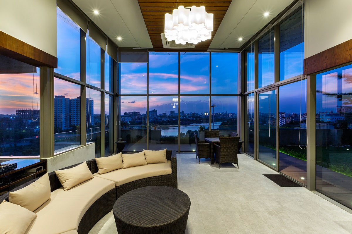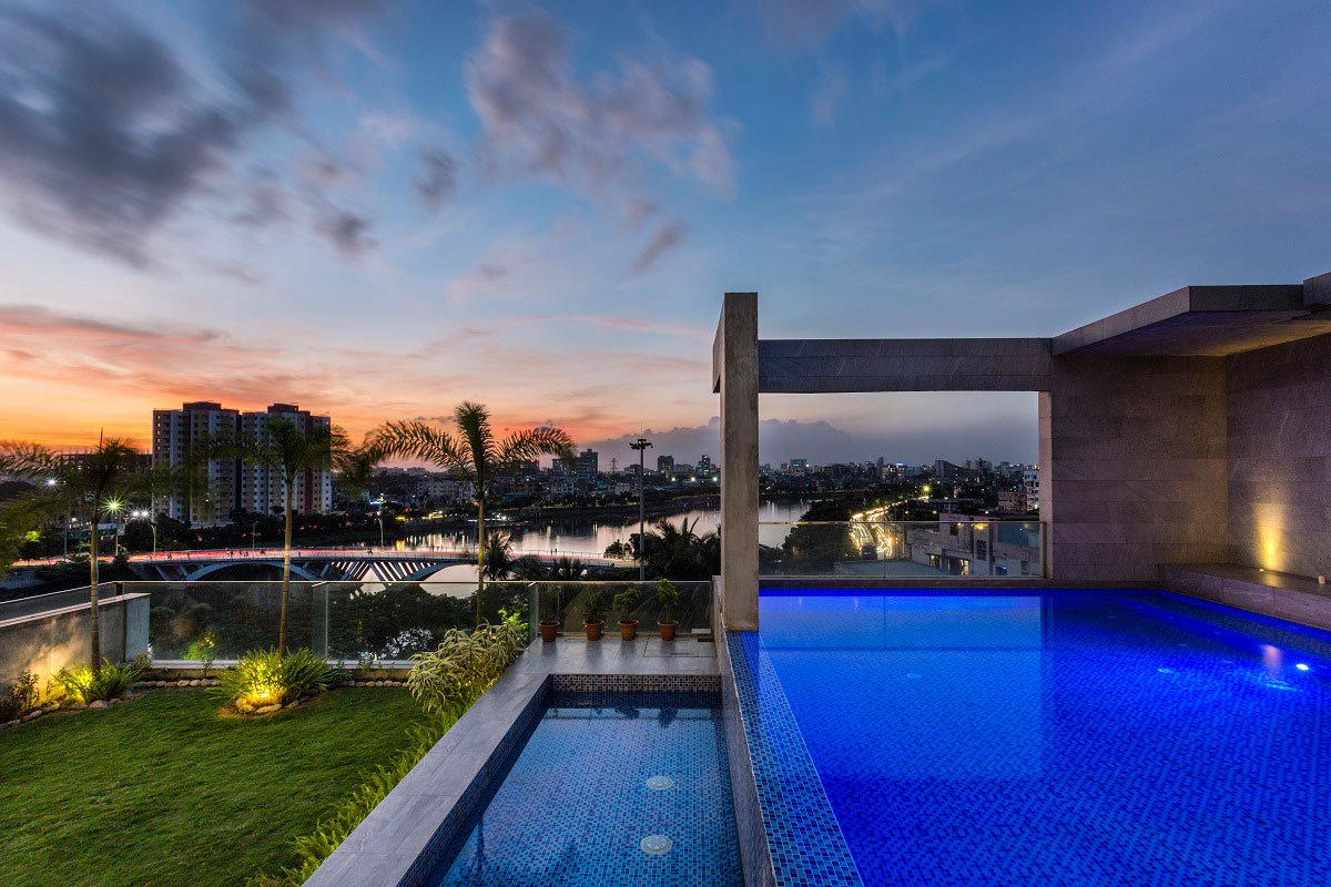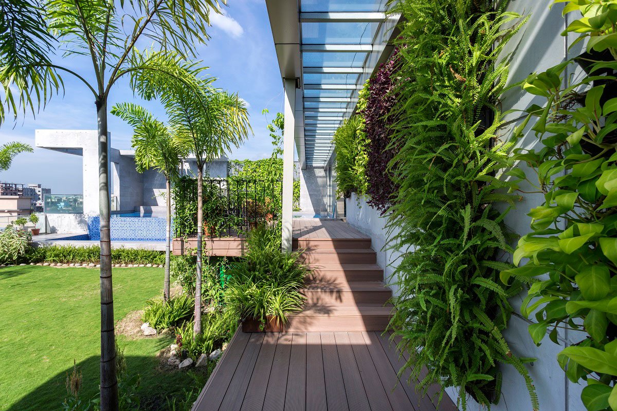 Stepping onto the roof, one is welcomed with the magnificent vista of the Hatir Jheel. The glass wrapped cozy family party space is accompanied by green lawn adjacent to it. The glass roofed shaded path leads one through to the gym and pool alongside the green lawn on one side and green wall on the other side. This is the ultimate layer of space which is very private for the women and children of this house.