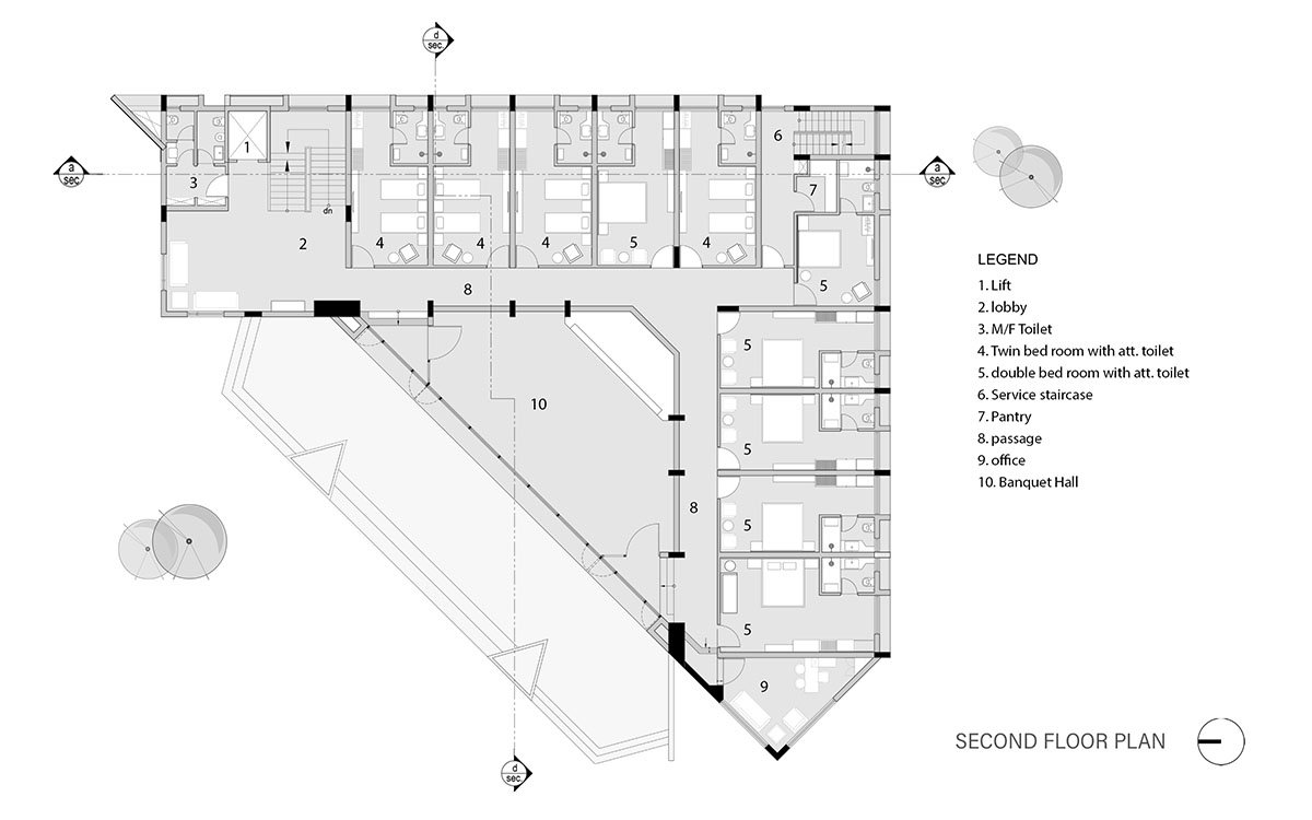The banquet on the 2nd floor which is a large cantilever volume have a 180 degree view .the layout of the banquet is kept trapezoid which gives the audience a focal point where an elevated stage is designed .which is an advantage for different kinds of users right from having small parties, marriages, and business meetings.