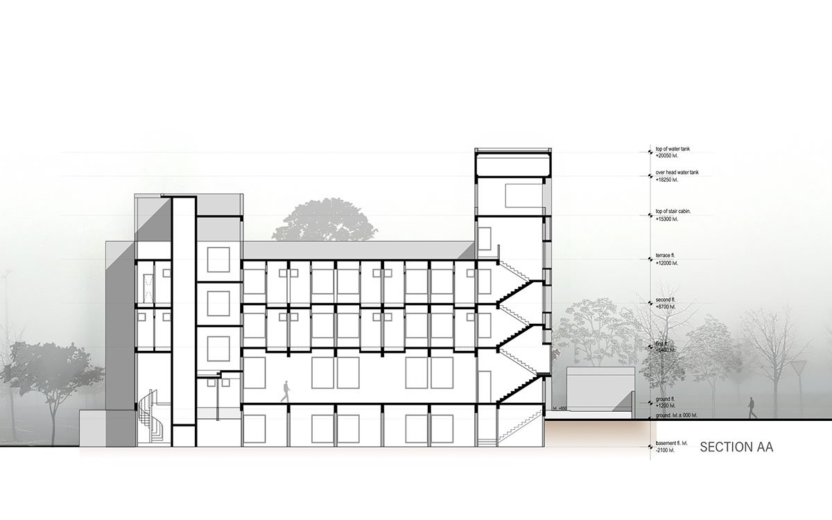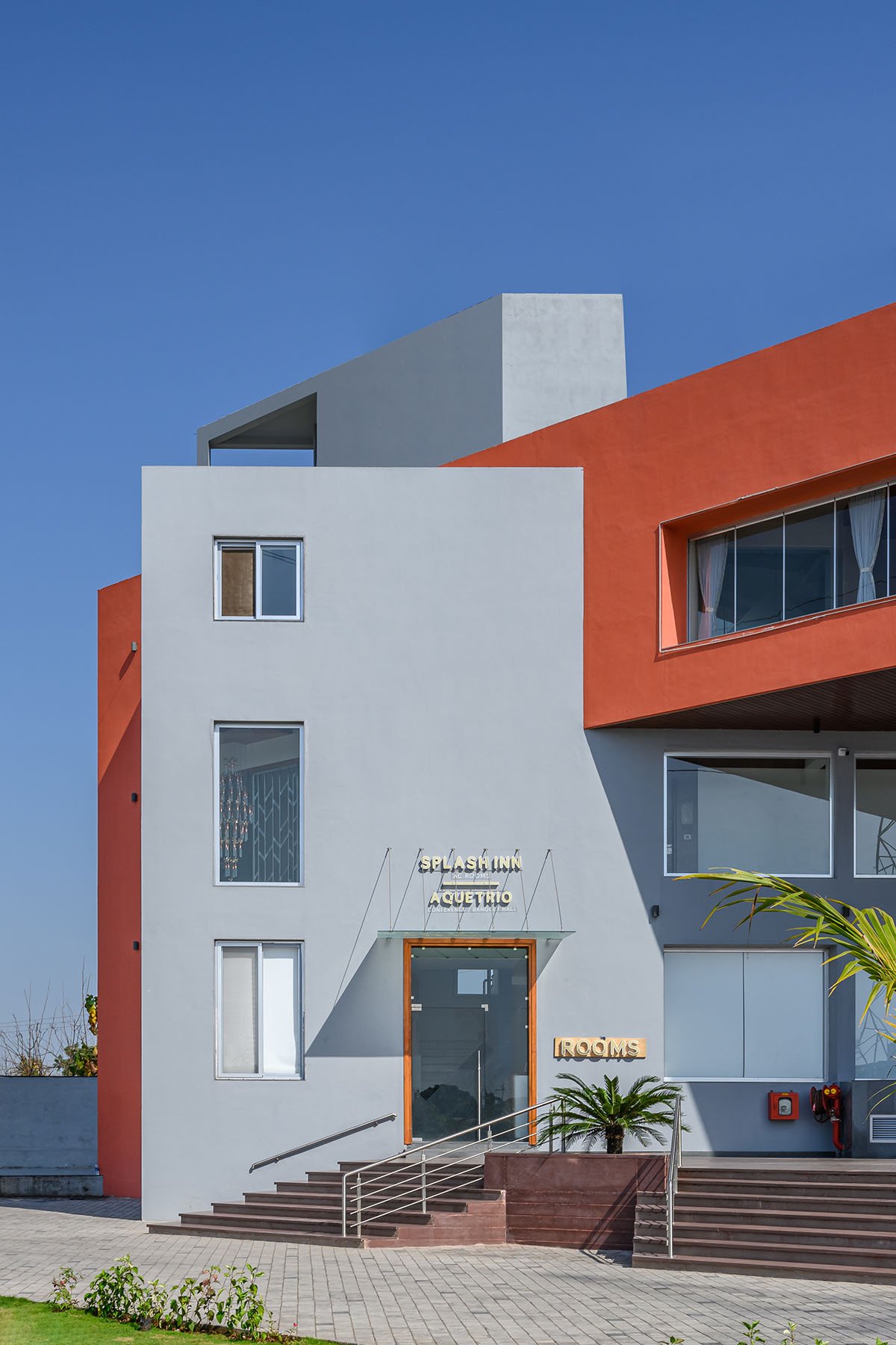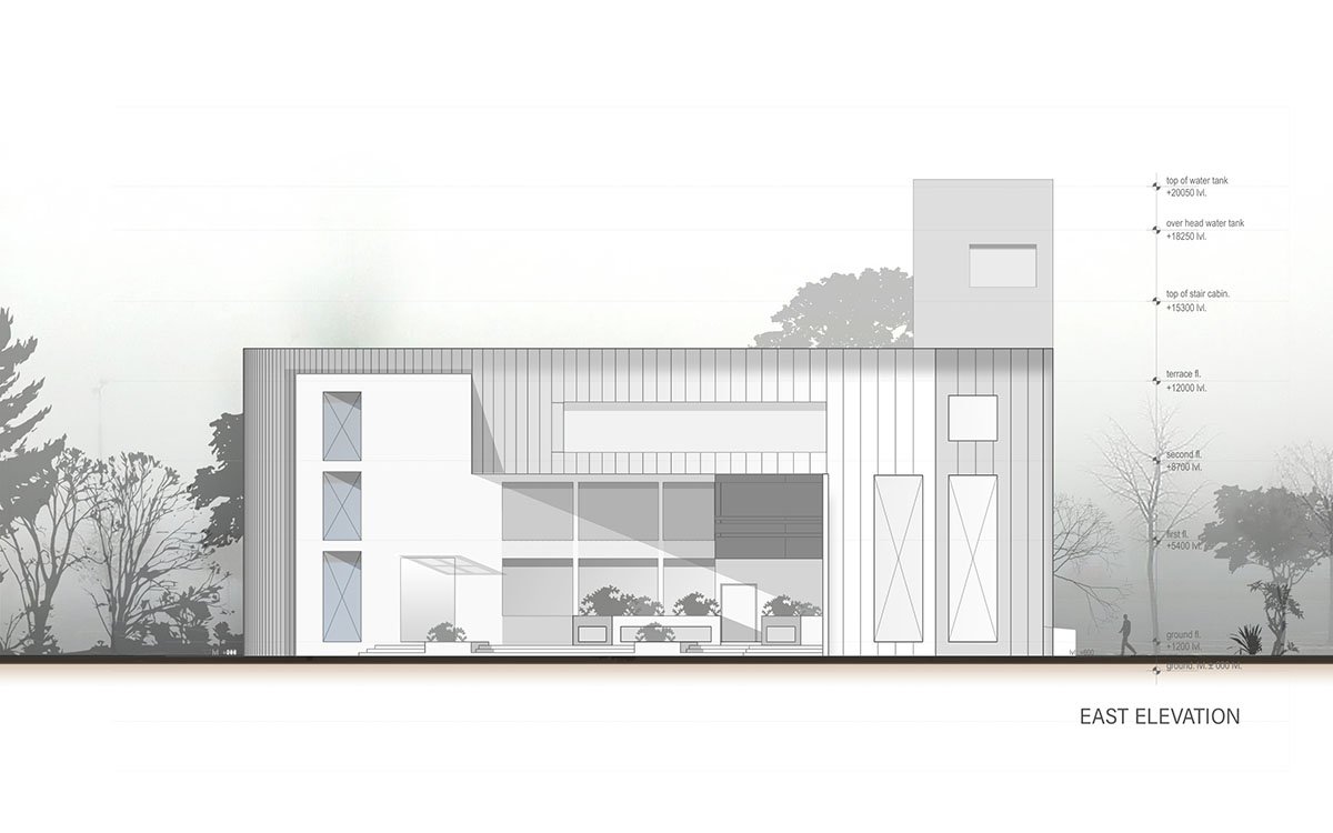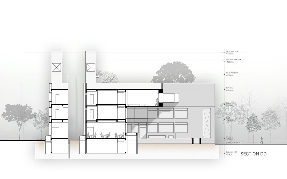 Not keeping the constraints as a limitation the architect wanted to play with different staggered forms, the ground and first floors are “L” shaped blocks and the second floor has been placed at an angle which gives banquet hall a level. The staggered arrangement of these volumes results in passive solar shading on the levels below and also creates a largely pronounced cantilever that the architect describes as the ” start of an architectural journey” to the space designed, an entrance that draws you in to enter the building. Also, both the masses have been intentionally pointed in a different color to accentuate the form of the building.