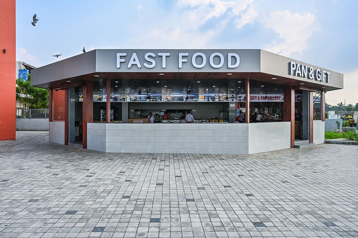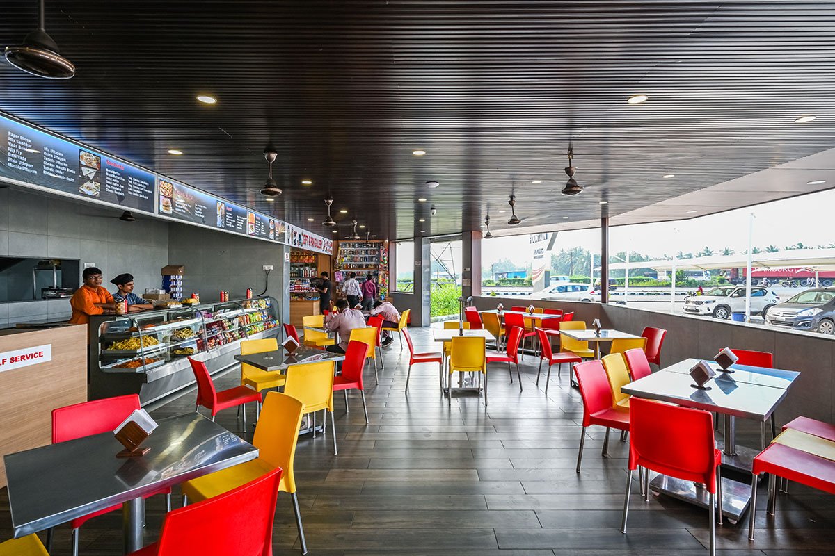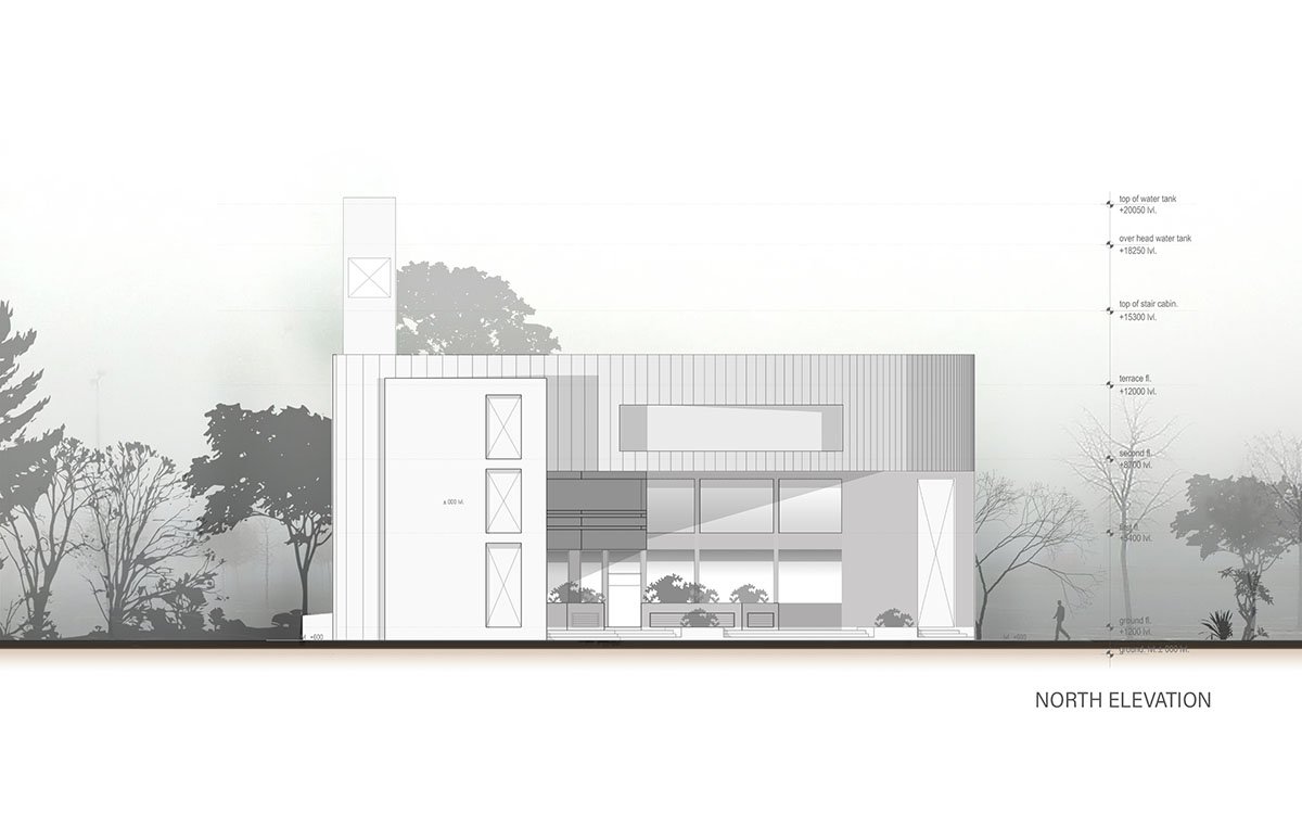 The site is getting divided because of the high-tension electric line passing by it. This setback becomes a starting point to explore and design the form. Overcoming the limitation, we have created a very simple form where two forms are intersecting and it generates the form of the building without compromising its functionality. The building is placed at an angle due to a high tension line; the orientation of the building is completely justified as per the movement of traffic on the highway.it gets good visibility from a large distance.