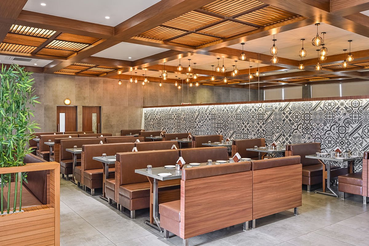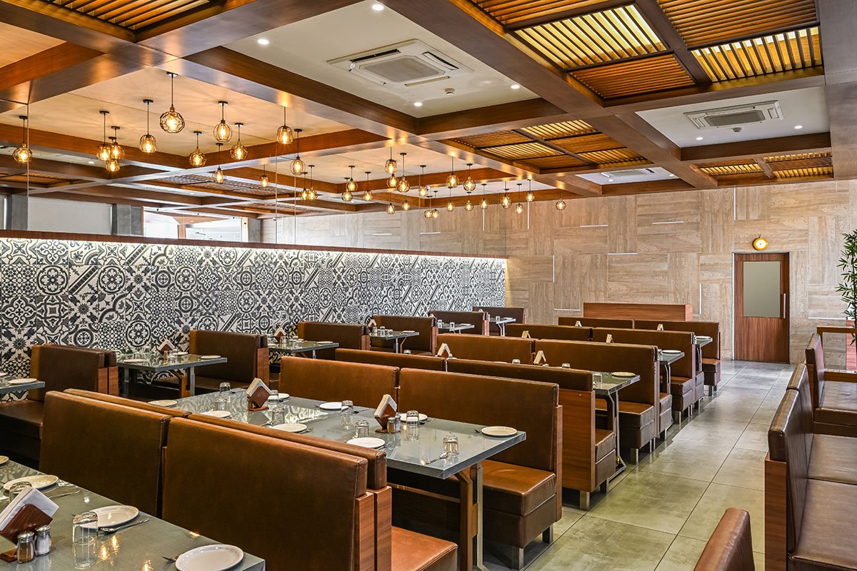 We started with the ground floor which consists of two wings with a kitchen placed strategically at the meeting point of both the wings which servers both a/c and non-ac dining. A separate entrance for the 20 key hotel and banquet hall guests is also planned for their smooth movement into the building which is situated on the 1st and 2nd floor of the building which contains a bright welcoming reception and double-height waiting area. The entire space, we also made sure the elegance factor was not compromised hence balancing all the bright colors with muted backgrounds and pops of geometric patterns.