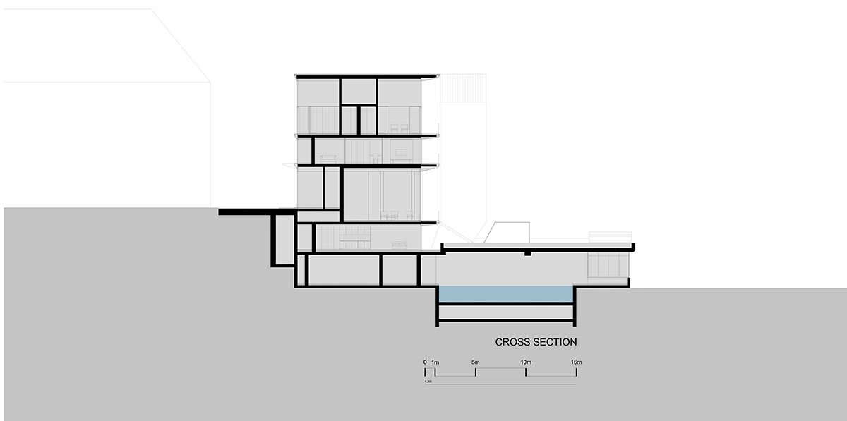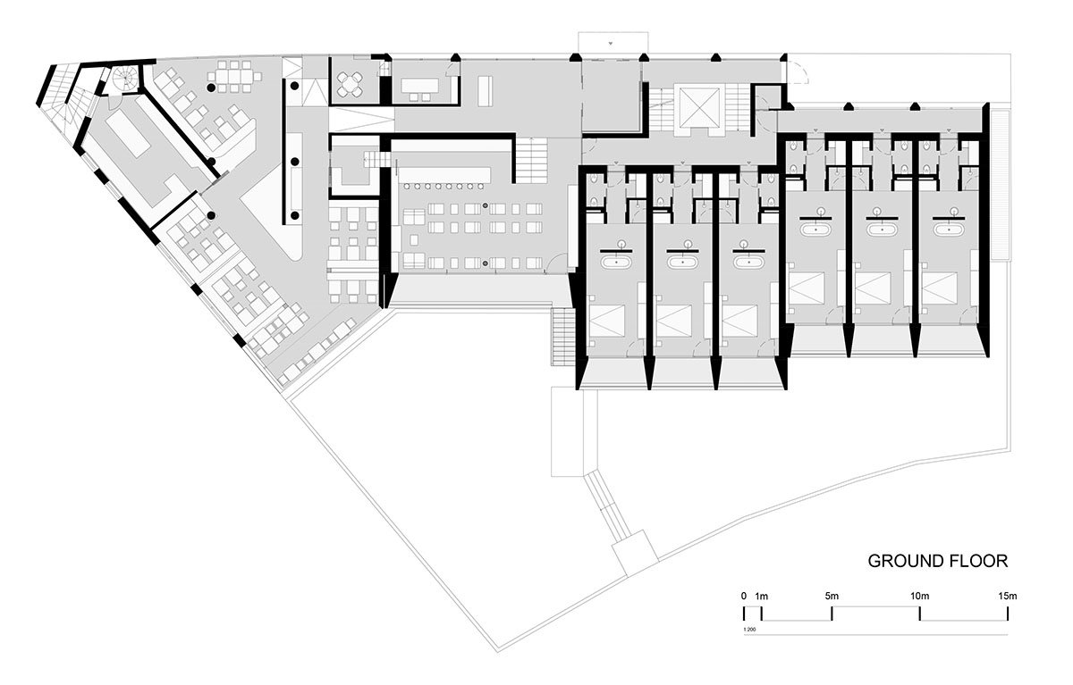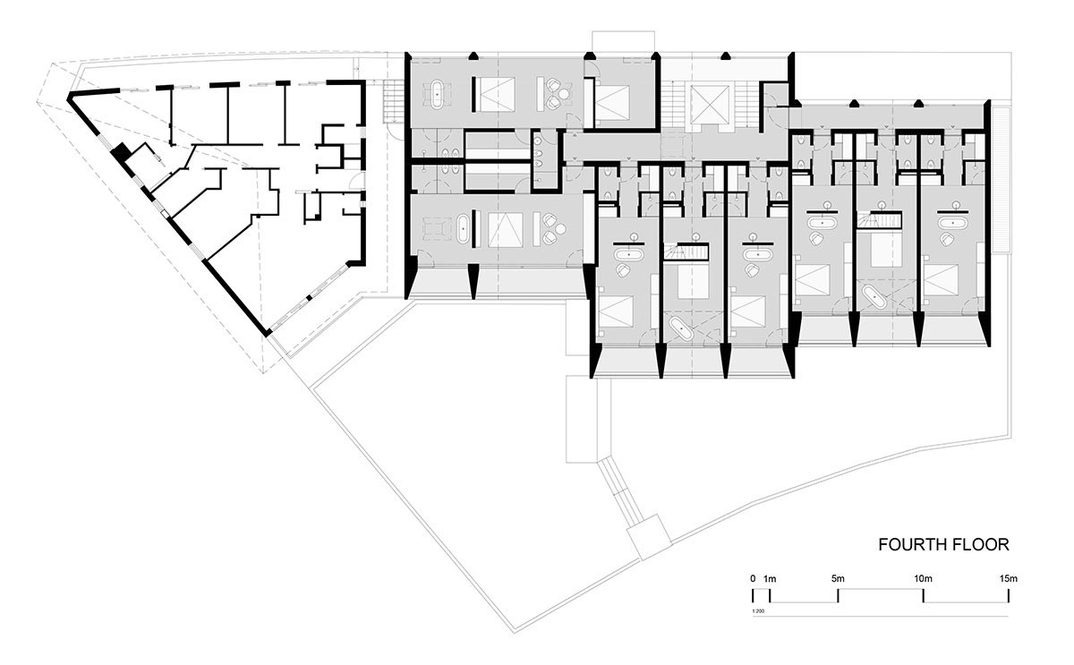 The Project consists of three monolithic volumes, following the house’s original structure before reconstruction. While respecting the local context and its surroundings, the strong architectural identity of the Hotel follows a contemporary reinterpretation of the alpine style. It plays with vernacular elements, such as the typical sloped roof.