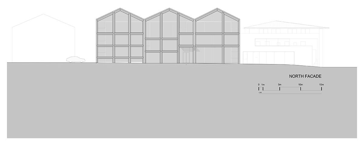 The expressive exoskeleton facade changes according to orientation and program. The almost sculptural structure is less depth on the north/east facade, mostly corridors and public spaces. The tapered geometry has more depth at the south facade and creates loggias with natural shading. The rocks of the surrounding mountains inspire the bright grey colour of the chalk containing the render of the facade.