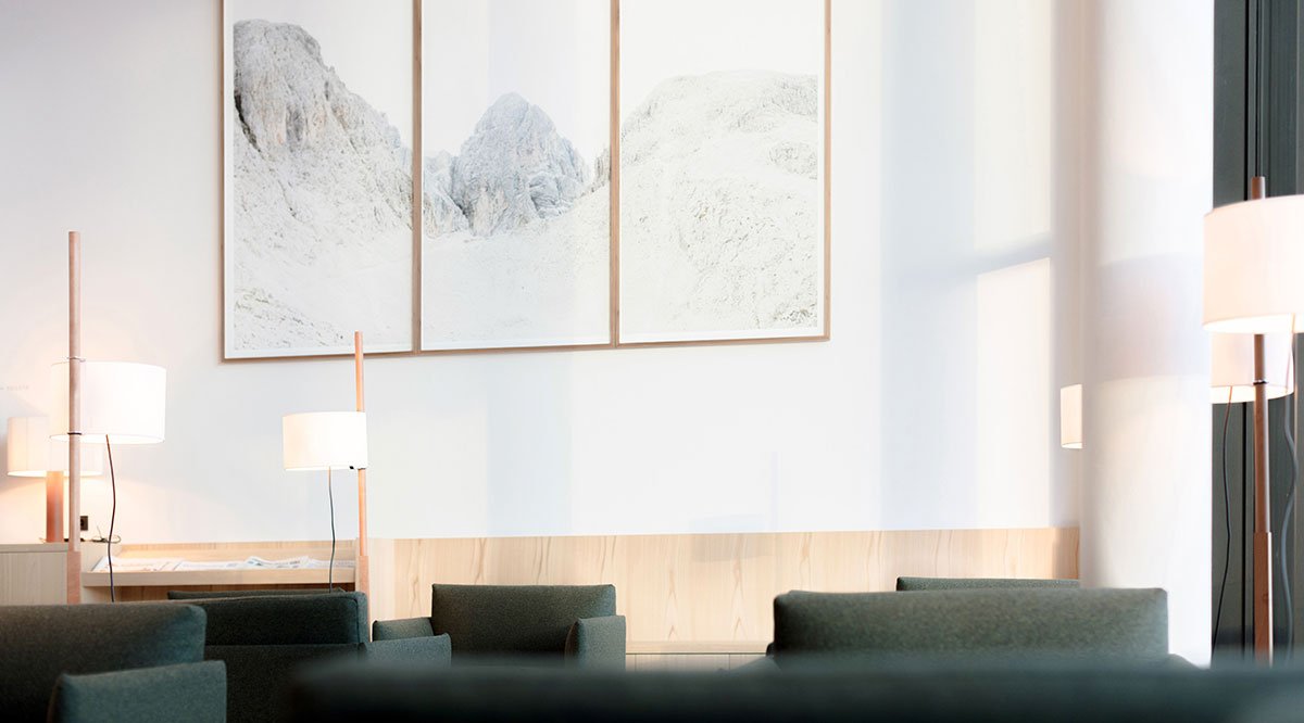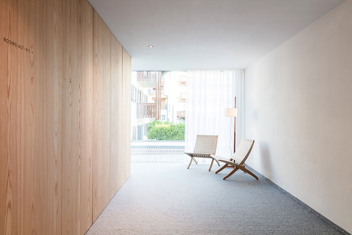 Tradition and culture are vital elements in the design of the Hotel. Functional and straightforward interiors with open layouts are combined with local materials such as chestnut wood or local Stones and textiles. Public spaces like lobby, bar and restaurant are located on the ground floor. The Bar connects to an expansive and sunny terrace with impressive views of the Sciliar mountain. The underground level hosts the wellness facilities, Spa and beauty.